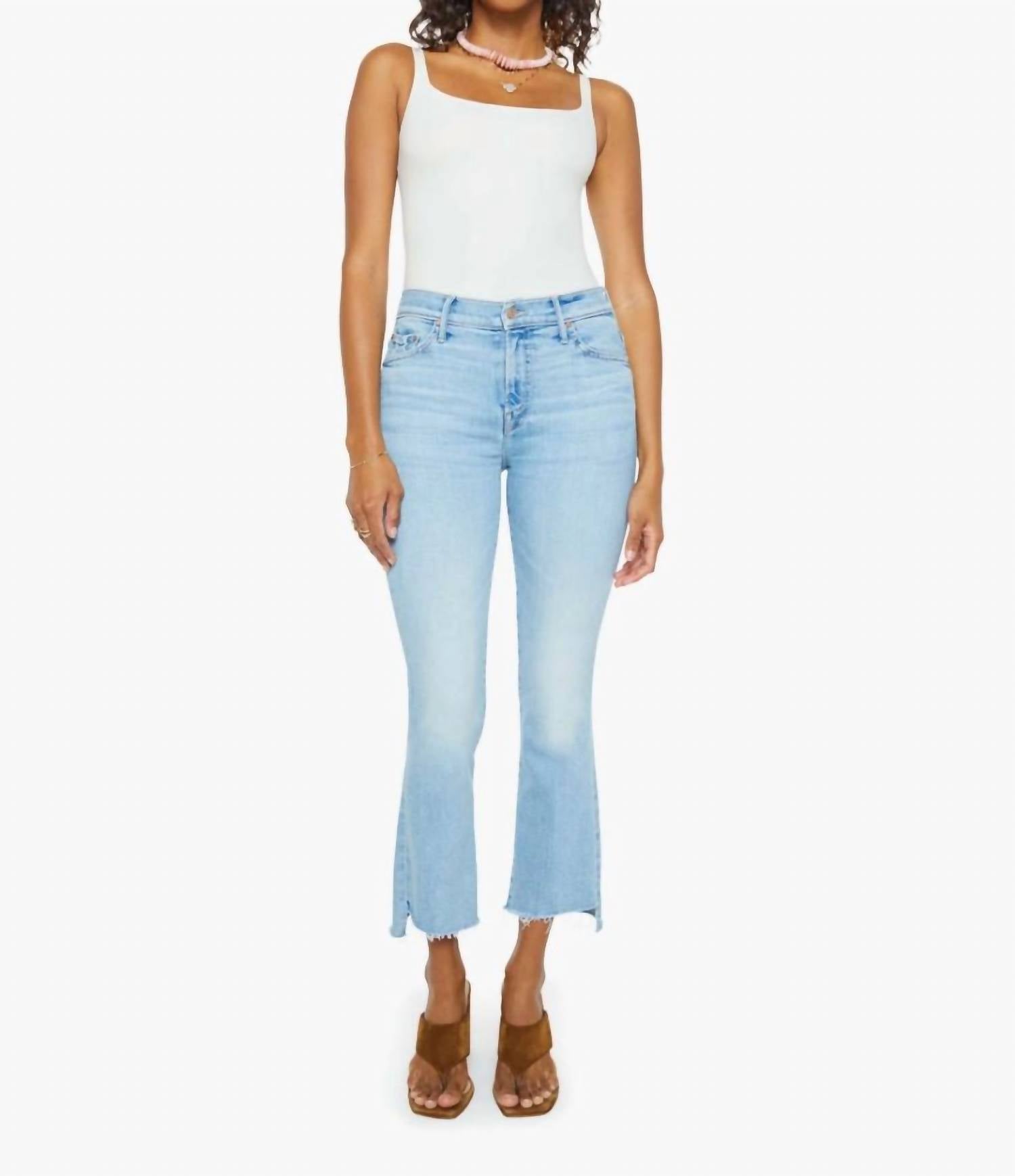 If you're looking for boot-cut, this is the jean for you. Introducing the Insider Crop Step Fray Jean by Mother, a stylish choice in the shade Beaming. Featuring a high-rise waist, these pants boast a classic bootcut leg that hits at the ankle with a distinct frayed step-hem. Made in Los Angeles, it's composed of 78% Cotton, 16% Modal, 4% Polyester, and 2% Elastane for a comfortable stretch fit. Closure: Button closure. Care instructions include machine wash and tumble dry. Designed with a 10-inch rise and 26-inch inseam, this light wash denim offers a minimalist style perfect for holiday parties in the spring.