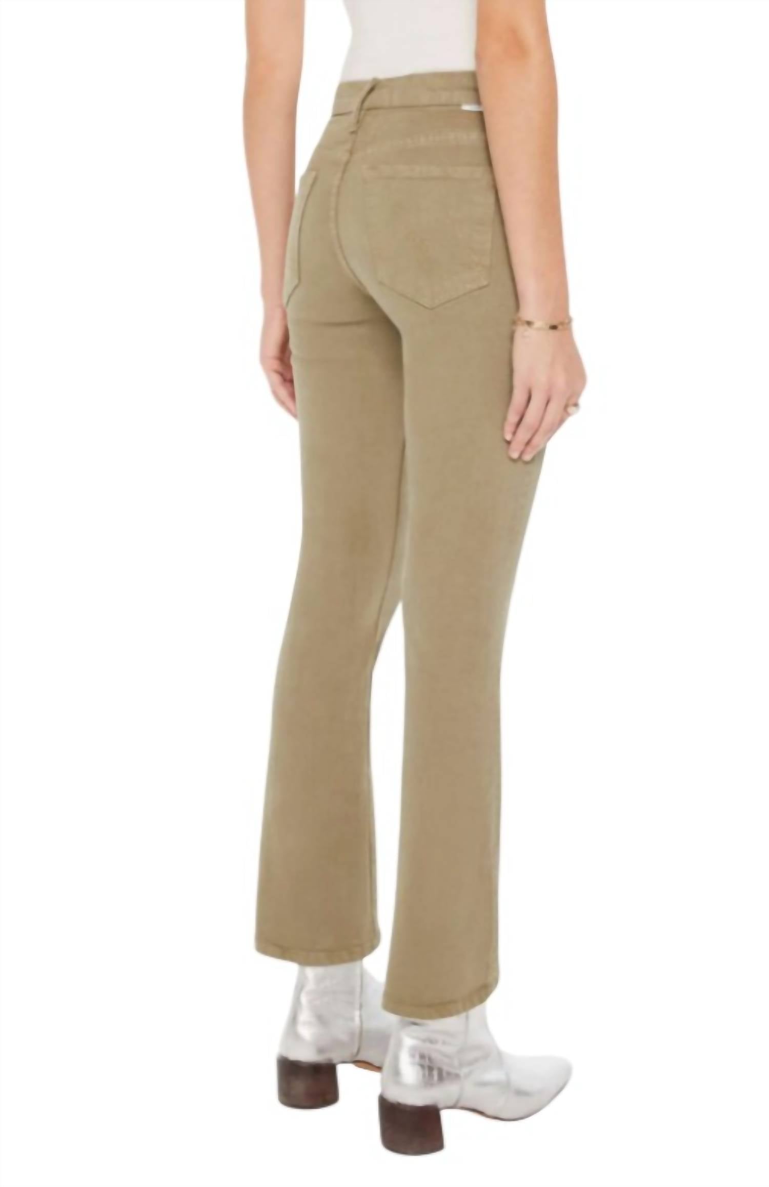 If you're looking for boot-cut, this is the jean for you. Step into style with the Insider Hover Mid Rise Bootcut Jeans by Mother, perfect for every casual occasion. These relaxed-fit jeans feature a 31-inch inseam and an 11-inch rise, crafted from a comfortable cotton blend with a solid kelp green hue. The mid-rise waist and bootcut legs flatter your silhouette, secured with a classic button closure. Care is simple with machine wash and tumble dry instructions, making these jeans a staple for your spring wardrobe.