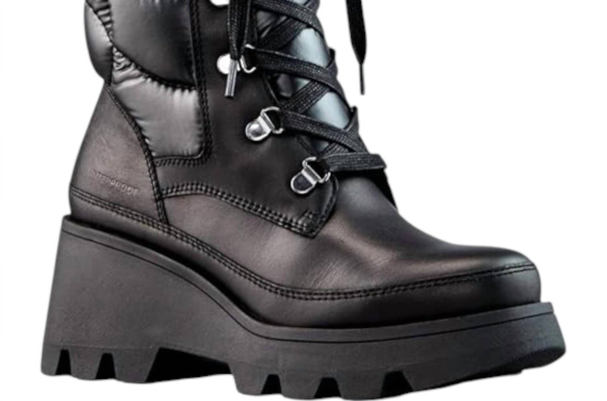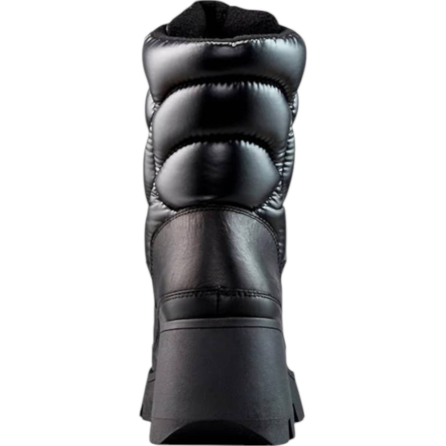 Rainboots so cute, you'll want to wear these even on the lightest drizzle days. Perfect blend of style and comfort for cold weather. Black winter and rain boots feature a round toe, lace-up closure. Crafted with a combination of nylon and leather. Ankle shaft height and a low platform heel, offering stability and support with an anti-slip rubber outsole. Originating from Canada. Temperature rated to -24°C/-11°F and include 200g PrimaLoft Gold Insulation, a polar fleece lining, and a removable footbed for a customized fit.