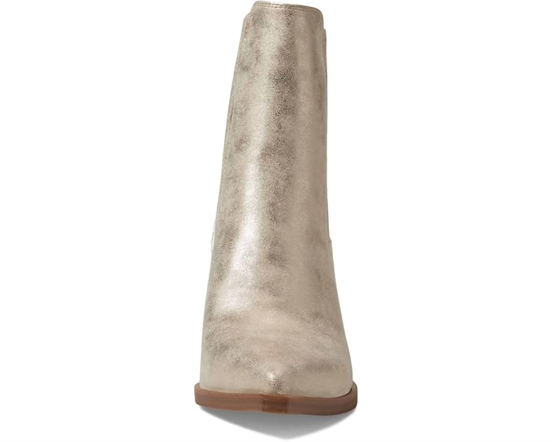 Crafted from soft, faux leather with an elegant gold hue, these booties boast a chic pointed toe and a 3.25" stacked block heel for comfort and height. They feature elastic goring on the sides for easy pull-on functionality, while the PU and jersey lining adds a touch of luxe. With a shaft measuring 5 1/4", a 10 1/2" circumference, and weighing just 15 oz, these imported boots are the perfect choice for any fashion-forward woman.