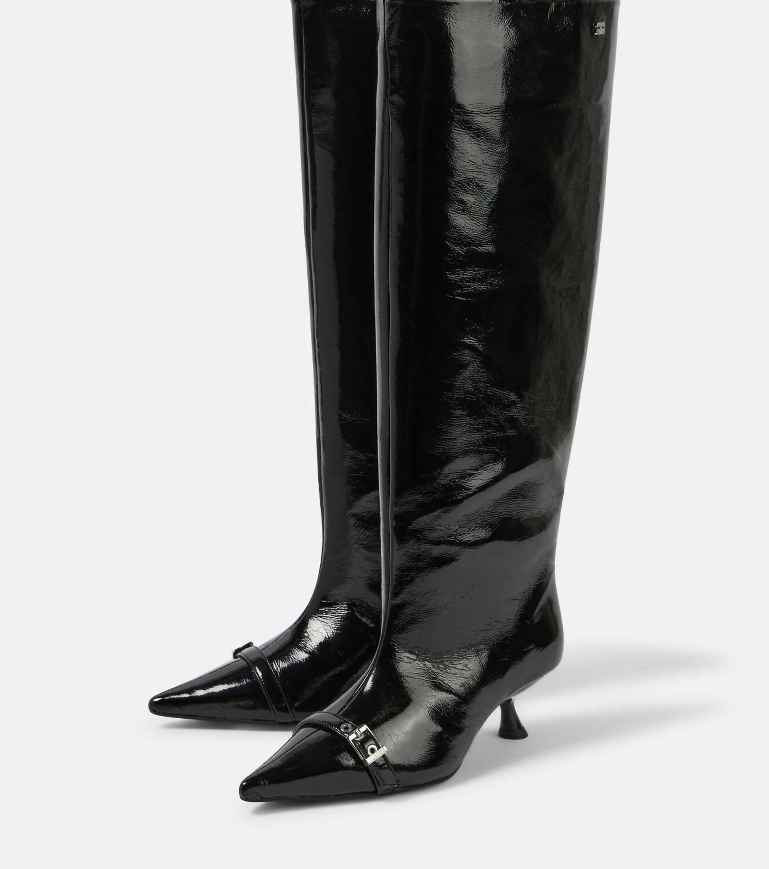 A trend that is here to stay. Step into style with GANNI's Women's Slouchy Boot, a bold statement piece for any spring evening event. These over-the-knee boots in sophisticated black feature a pointed toe design and a comfortable 2-inch kitten heel, perfect for a maximalist wardrobe. Crafted with an upper of polyurethane and rubber and a lining of polyurethane, they boast durability and modern style. Made in Portugal with a rubber insole and sole, these boots are fashion-forward and functional.