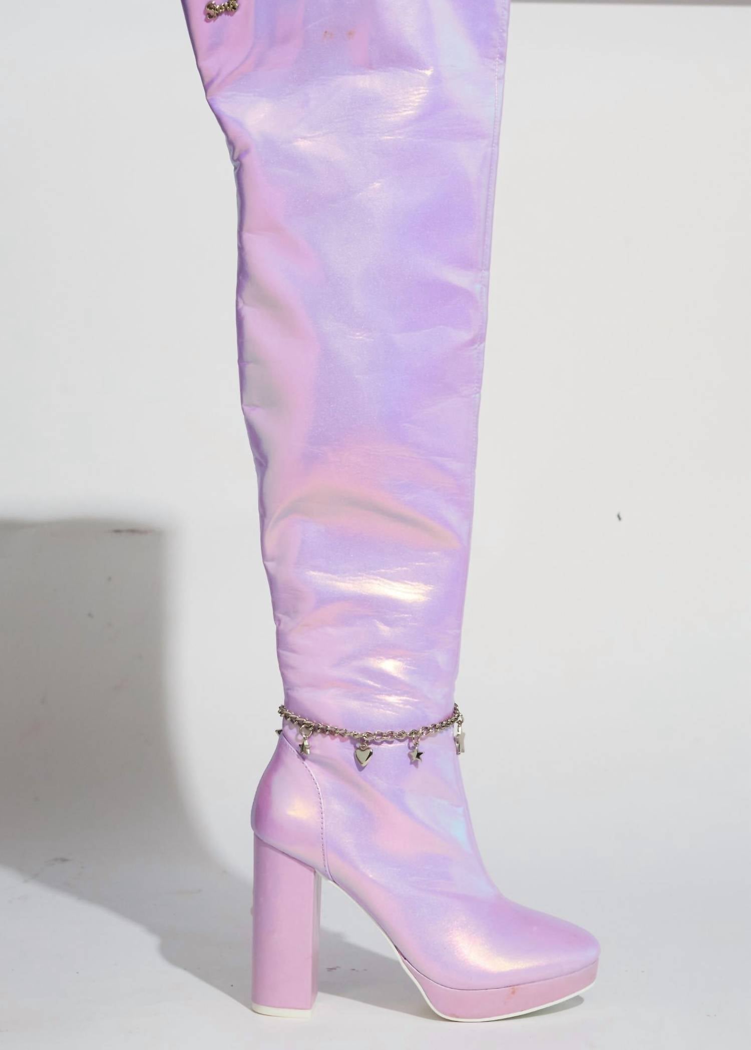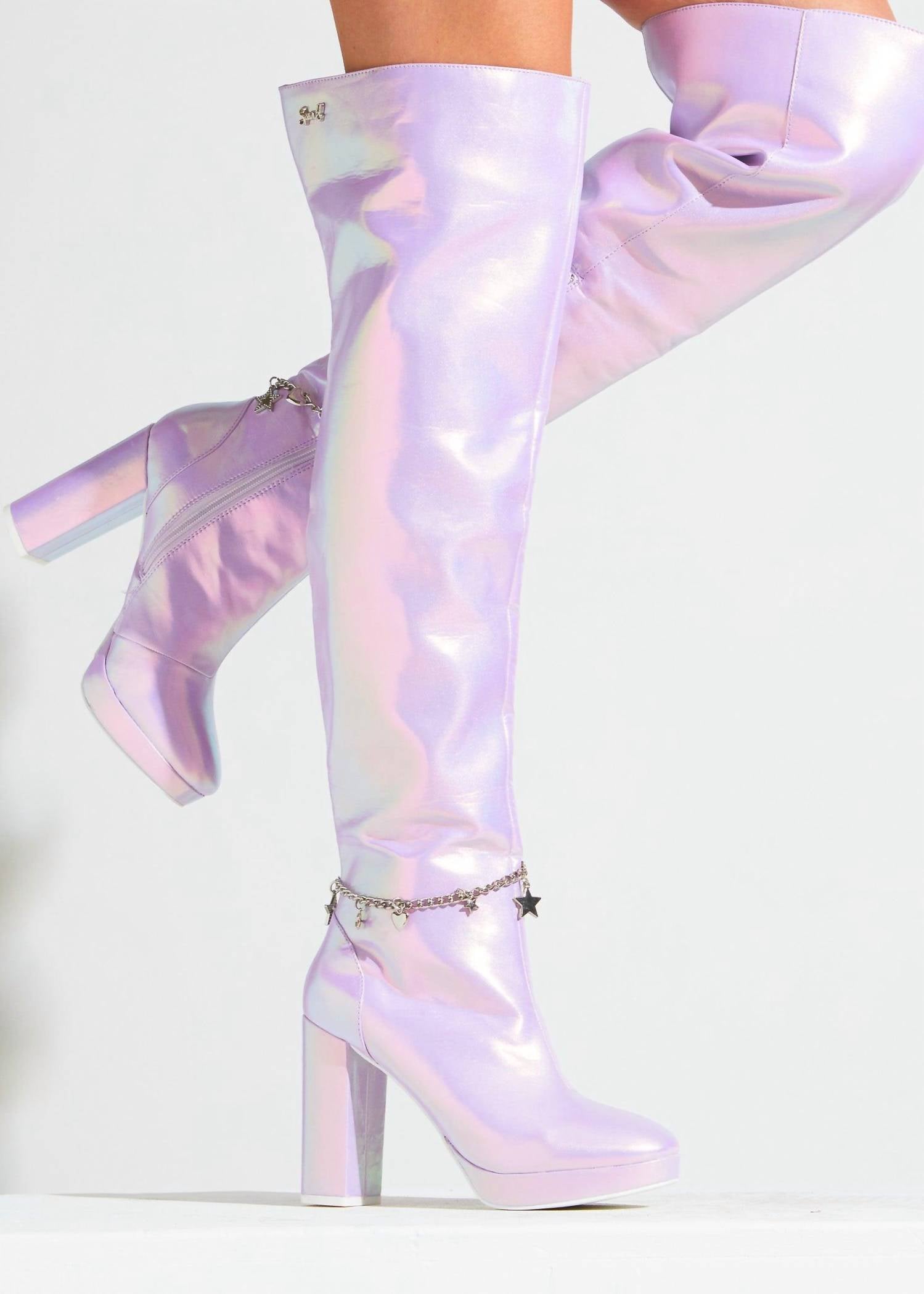 A trend that is here to stay. Introducing the Women's Naomi Boot by Sparkl Fairy Couture, a stunning embodiment of style in a captivating lilac iridescent hue. These thigh-high over-the-knee boots feature an elongating silhouette for a dramatic effect, complemented by a chic star chain detail. Designed with a convenient inside zipper for easy on and off, they ensure both fashion and functionality. Perfectly finished with a block heel and round toe shape, these boots are a must-have for any wardrobe looking to stand out.