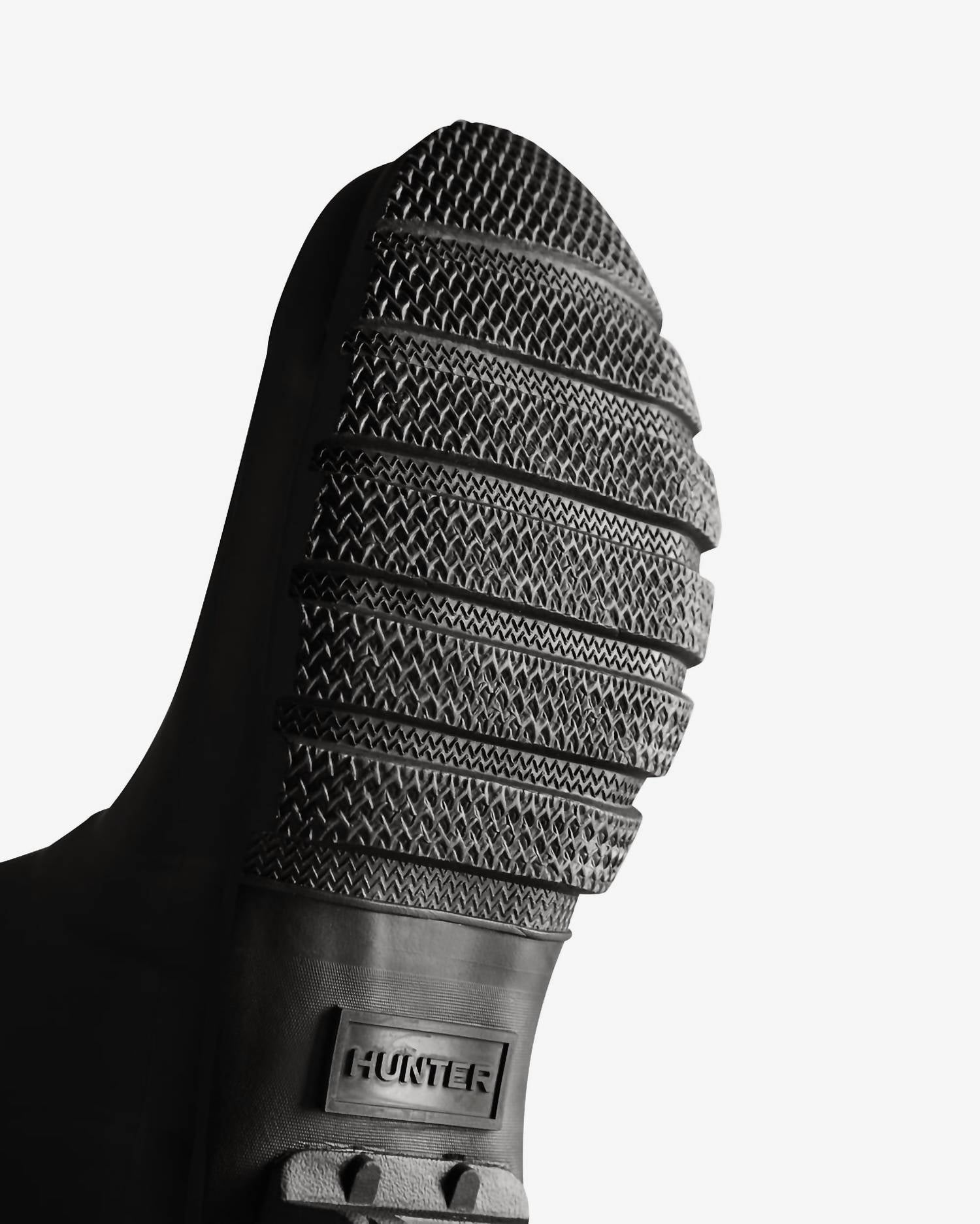 You'll be wishing for rainy days with these stylish yet functional rainboots. Introducing the Women's Original Tall Tri-colour Logo Backstrap Boot by Hunter, a stylish and practical choice for wet weather. Crafted from natural rubber, these boots boast the signature tri-colour logo on the backstrap for an iconic touch. The boots feature a comfortable recycled polyester lining and a round toe with a block heel, offering a flat silhouette for ease of wear. Perfect for all terrains, the vulcanised construction and original tread pattern provide excellent grip and mud release.