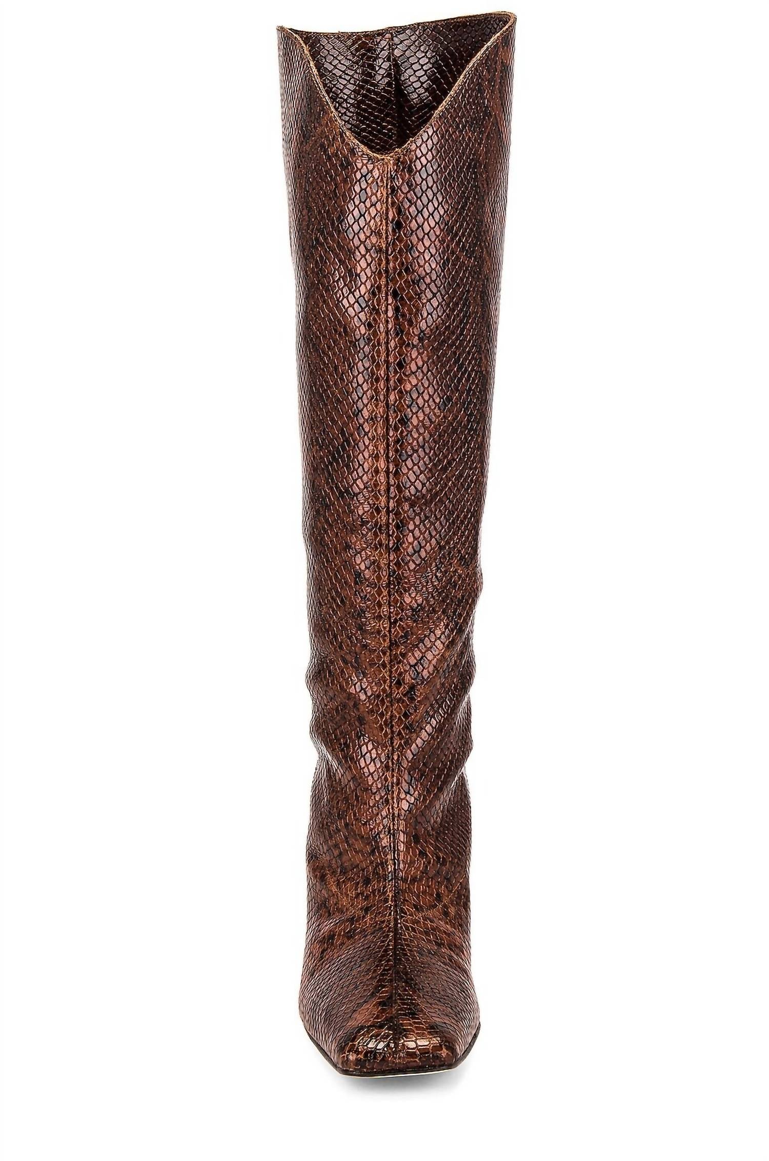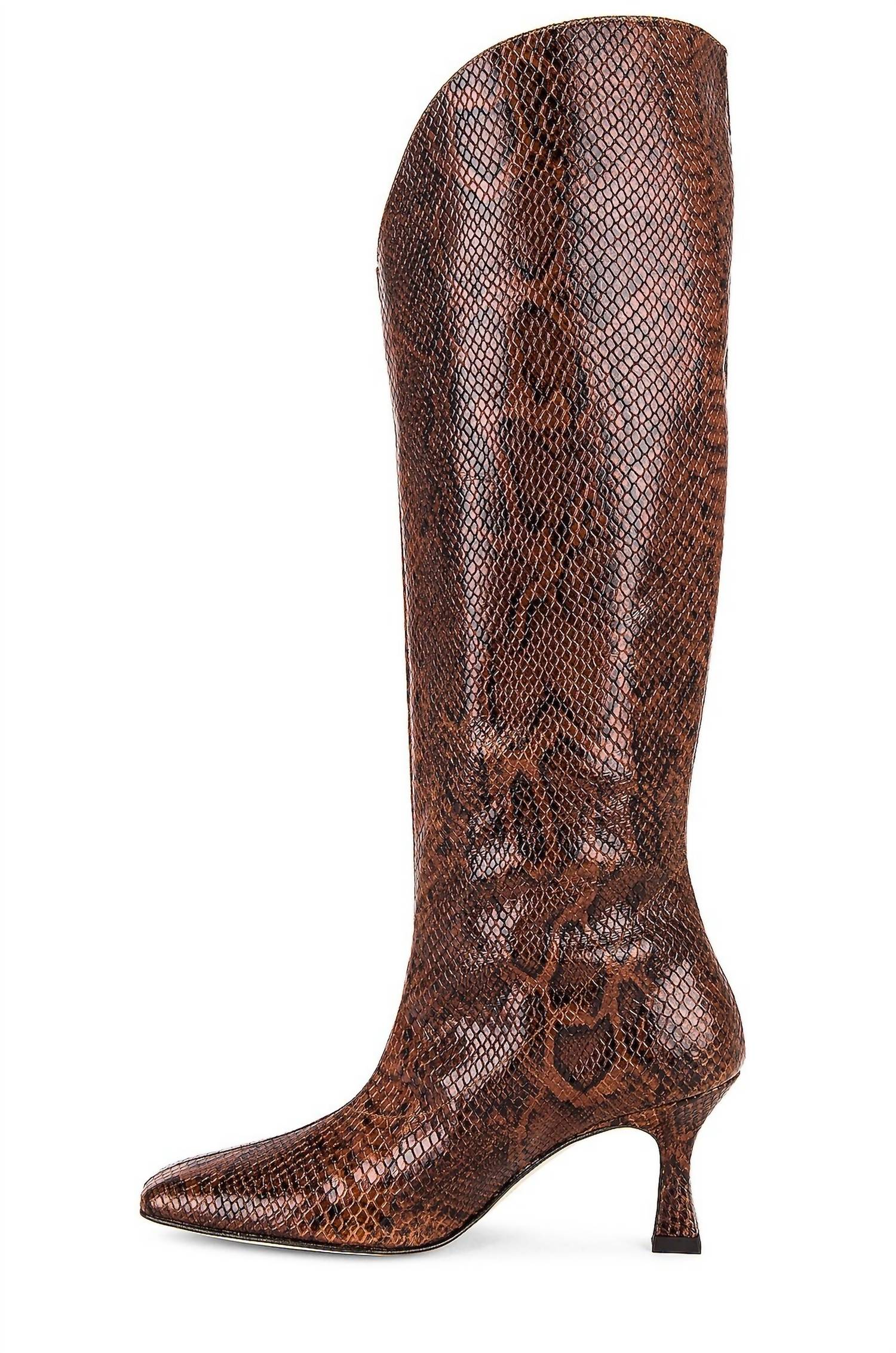 These stylish over the knee boots will look great with denim, dresses or skirts. You can't go wrong! Introducing the Women's Billy Boot by ALOHAS, a stunning pair of wide cowboy-inspired over-the-knee boots. Crafted from high-quality leather, these boots boast a flirty stiletto heel with a height of 2.5 inches, ideal for evening events. The boots feature a curved top opening and a pointed toe for a sophisticated look. Elevate your fall fashion with this python print design, embodying a trend of quiet luxury.