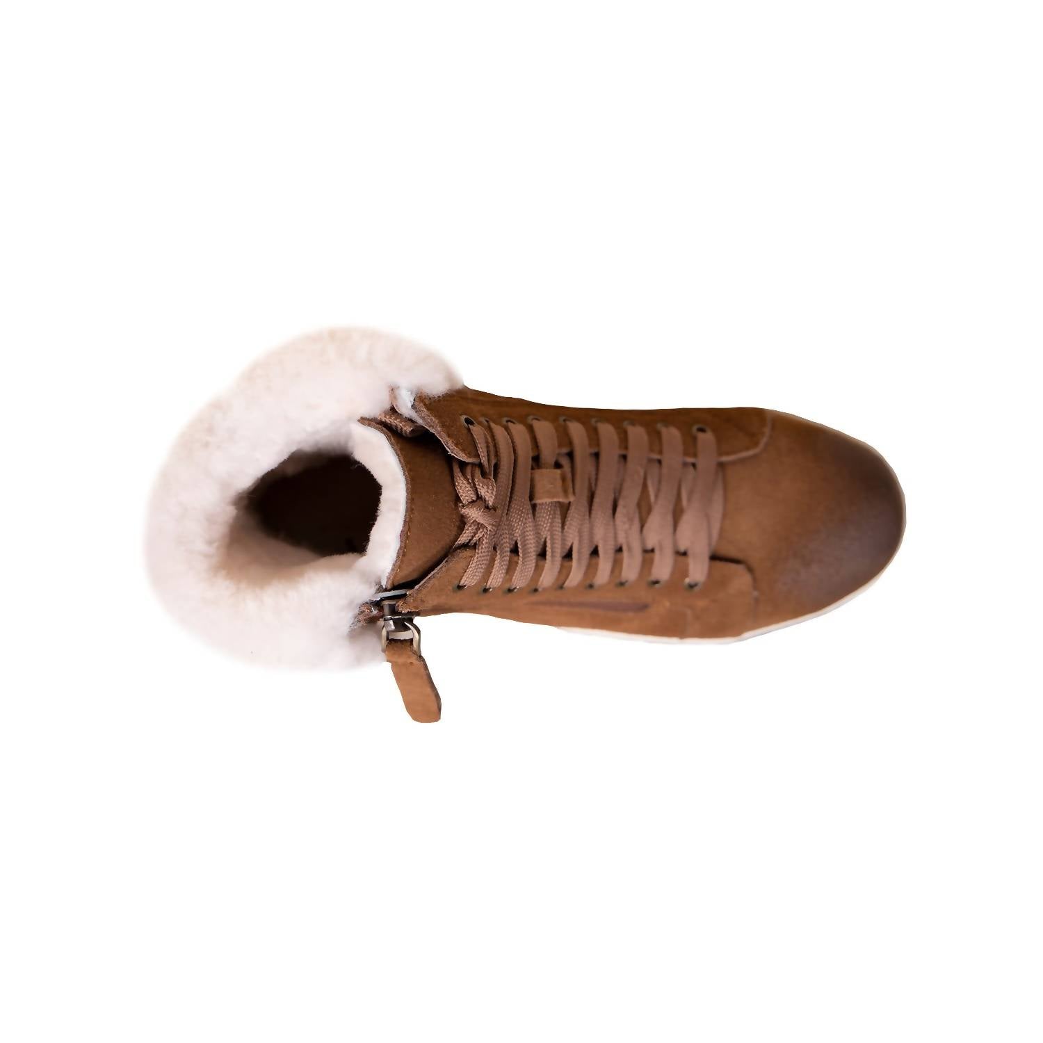 Important Note: Due to the sizing for this style running small—it is recommended that you order one size up. Model: CNS-151. Sheepskin and sneakers make a great combination—casual comfort and outstanding looks! Lining: 100% Sheepskin. Upper: Burnished suede leather, side zippered. Sole: Rubber