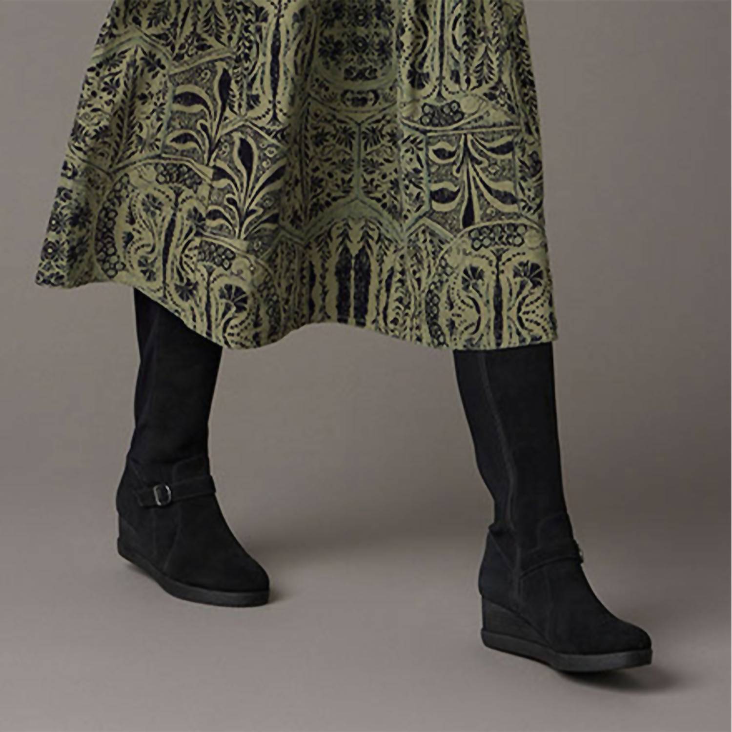 A trend that is here to stay. Step into style and comfort with the Dansko Shelia Waterproof Suede Tall-shaft Boot, designed for women who appreciate quality. Featuring a durable waterproof leather upper treated with 3M Scotchgard™ for stain resistance, these black boots come with a back zipper closure and sleek round toe. The combination of soft fabric and breathable leather lining ensures comfort, while the removable footbed offers firm support with memory foam cushioning and Dansko Natural Arch® technology. Crafted with a 2-inch heel height and 0.75-inch platform, these boots are both flexible and lightweight, made with a TR rubber outsole and durable raw leather stacked BPU heel.