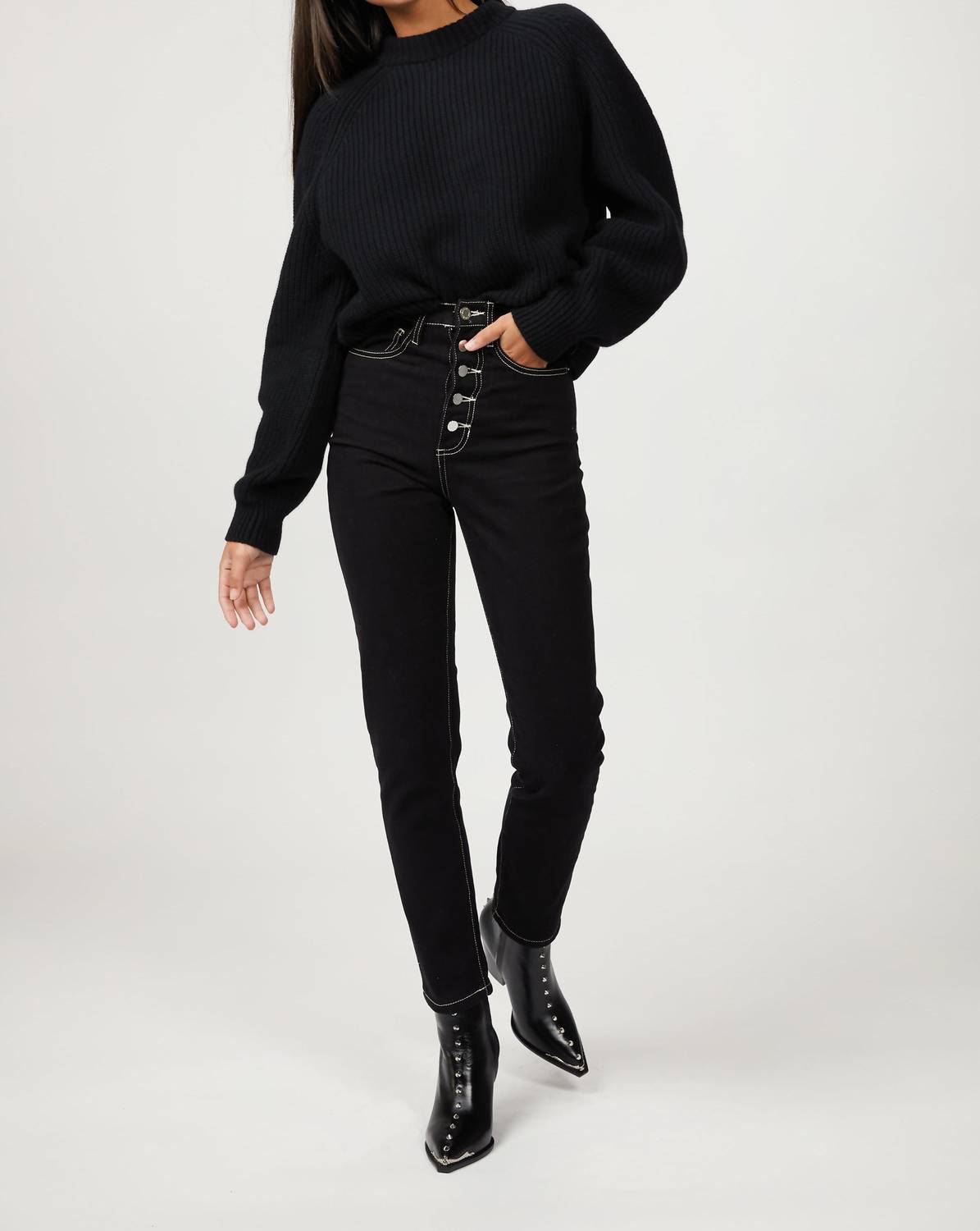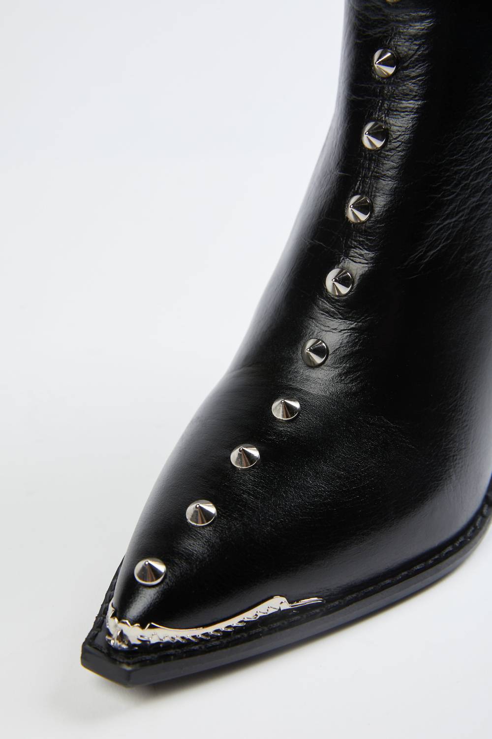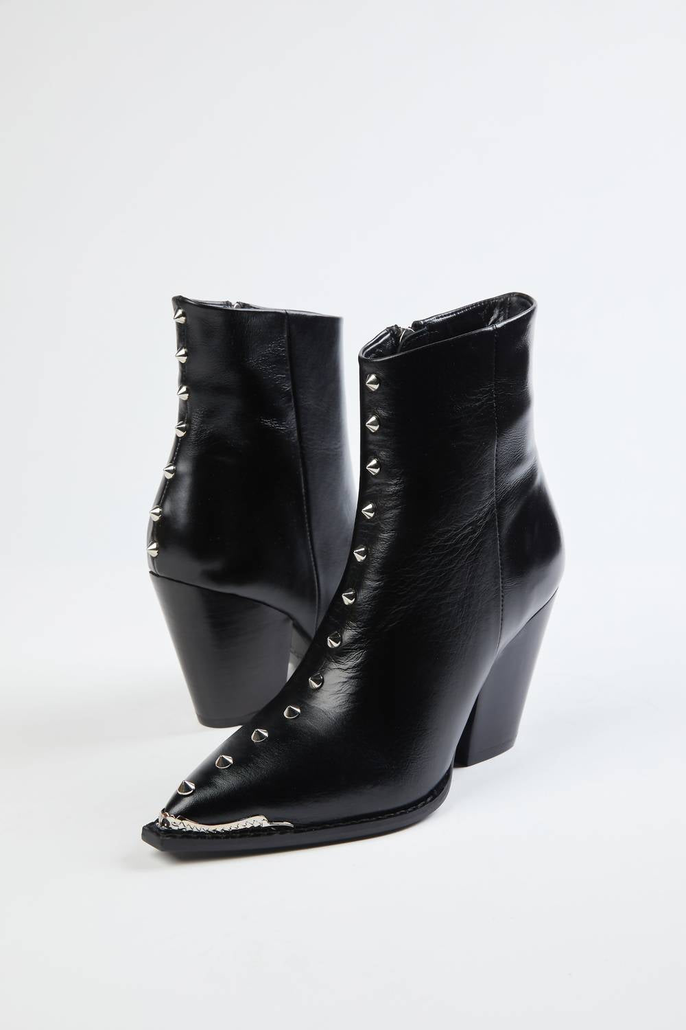 Made in Europe from smooth black calf leather, The Kooples' ankle boots feature silver studs up the center and a cuban heel. They have a steel-toe detail with a matching metal ornament on the heel. Wear yours with pleated skirts and flowing floral print dresses.89mm (3.5") heel Fabrication: Exterior - 100% Calfskin leather; Lining - 100% Goatskin leather; Sole - 100% Cow leatherEuropean SizingCheyenne is wearing size EU 39