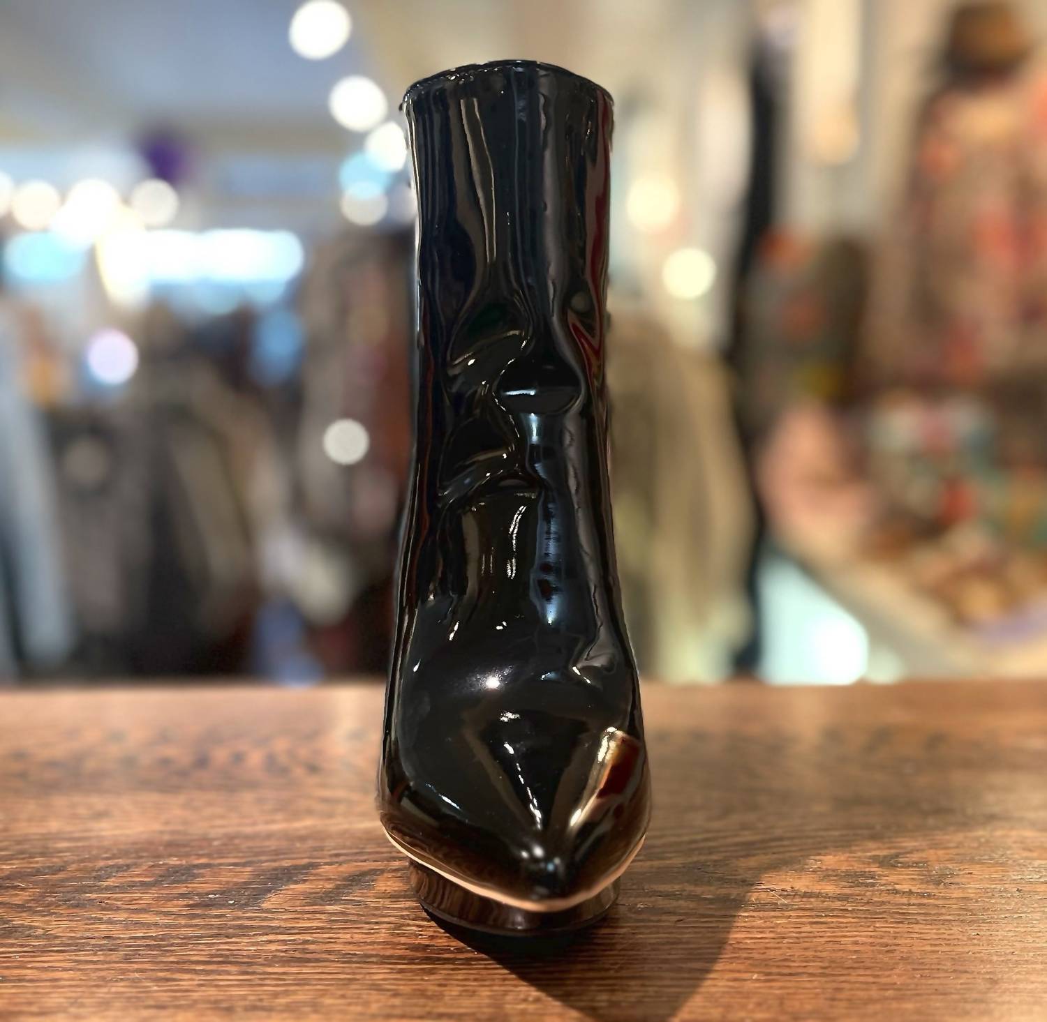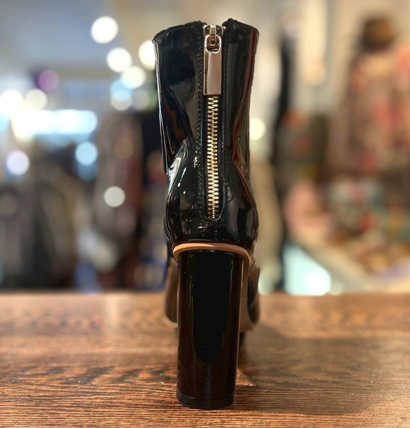 Heeled. Back zipper. Patent leather.
