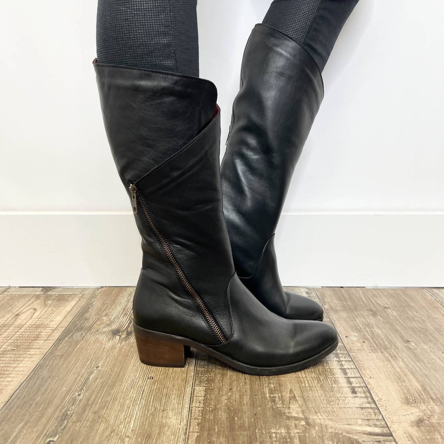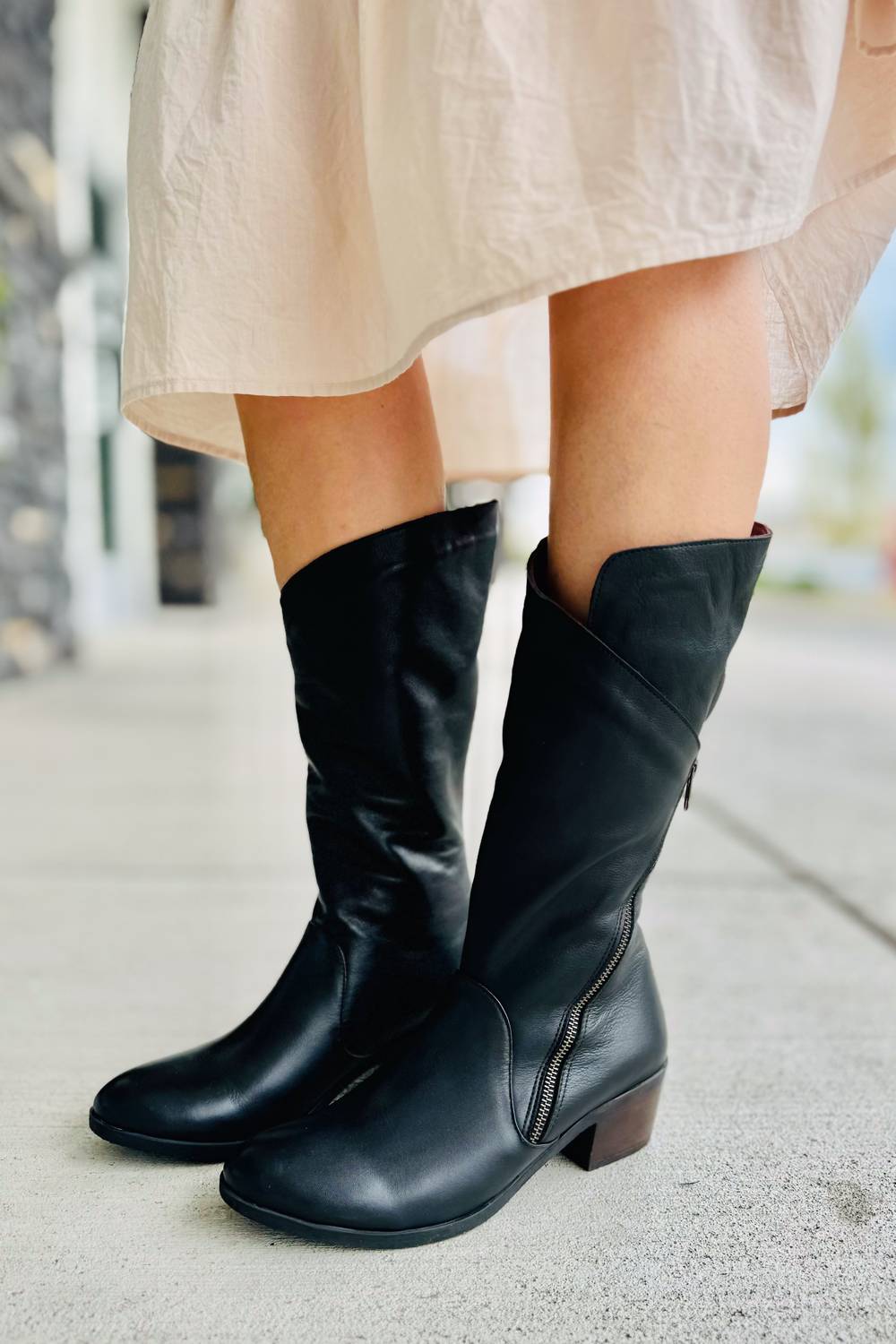 Upgrade your shoe game with these classic heeled boots, designed to merge sophistication and style. Comfortable enough for long days or a night out on the town. Step out in style with the Women's Camille Mid Boot by Bueno, an exquisite choice for any wardrobe. Crafted with a luxurious leather upper, these mid-calf boots feature a rounded toe and an oversized zipper for a modern touch. The cushioned insole and block heel provide comfort and support, with a heel height of approximately 2". Perfect for pairing with this season's outfits.