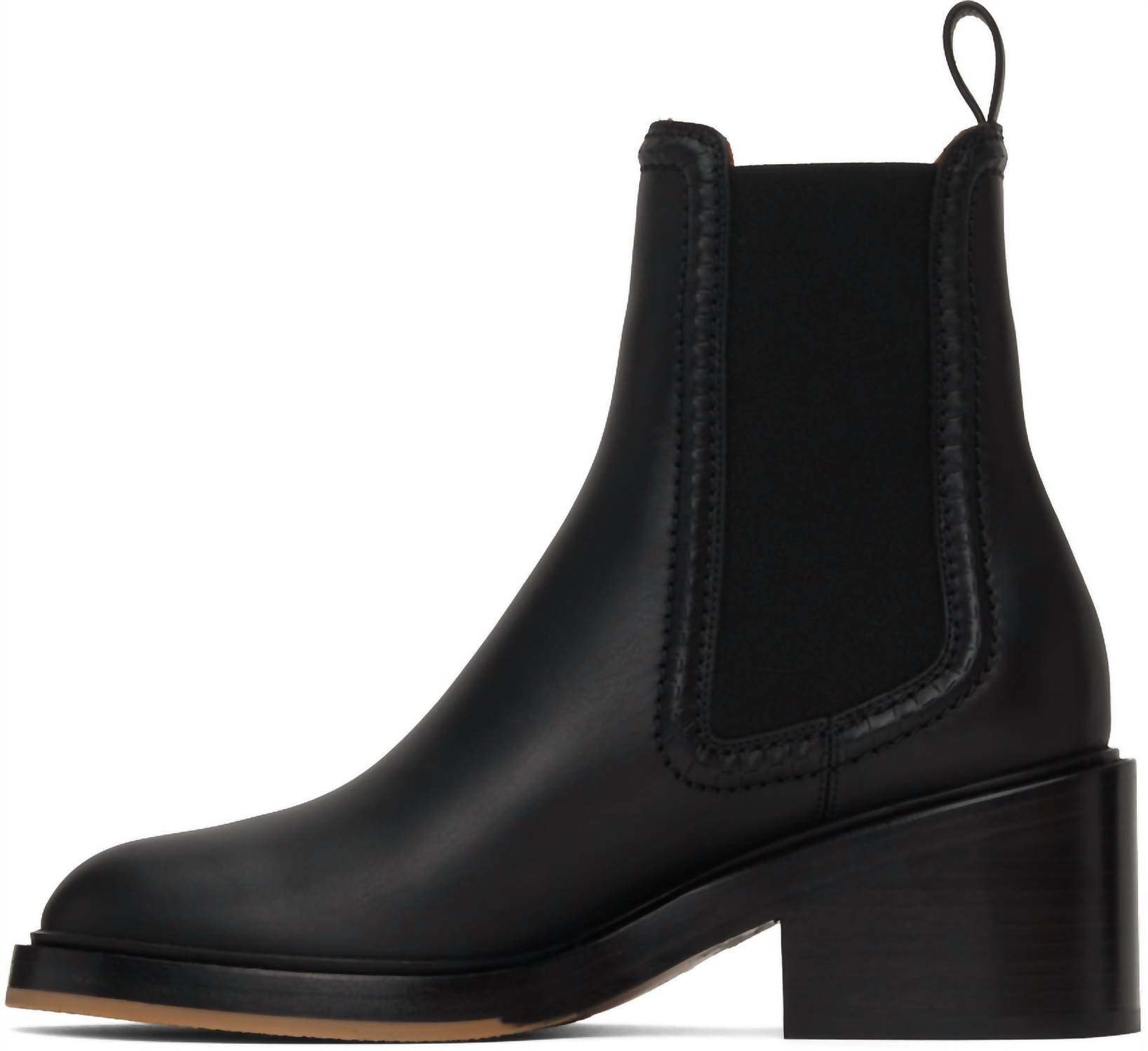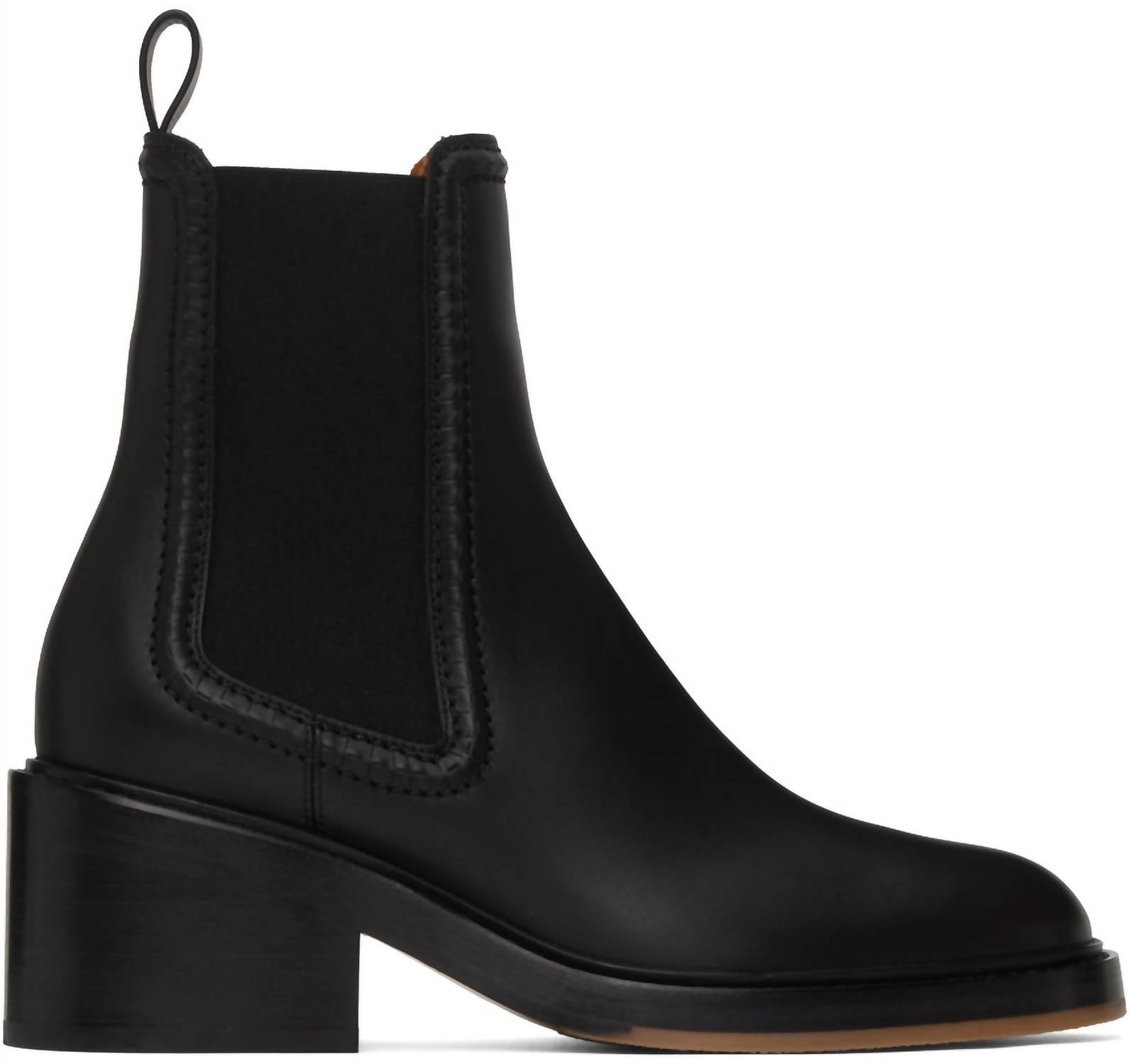 Say hello to the perfect, most versatile boot. The ankle height makes this style easily transition from day to night. Wear them with your favorite skinny jeans and tee for a more laid back look, or pair them with your favorite mini dress and jacket for a night out on the town. Elevate your ensemble with the Women's Mallo Boot by Chloe, a chic option in classic black. Crafted from premium leather, this boot features a mid block heel of approximately 66mm/2.6 inches and a 146mm/5.75 inch shaft for a stylish silhouette. Made in Italy, these boots are designed with a pull-on style, heel pull tab, and elastic side gussets for effortless wear. Suitable for women, they promise comfort with a round toe design and are perfect for adult fashionistas.