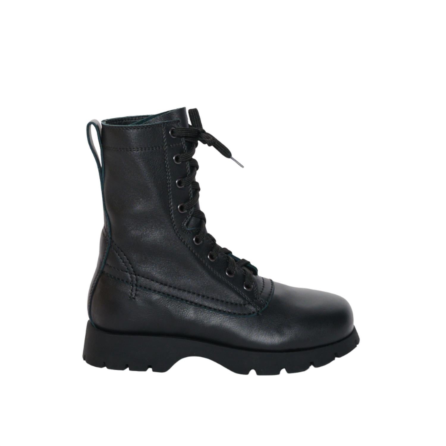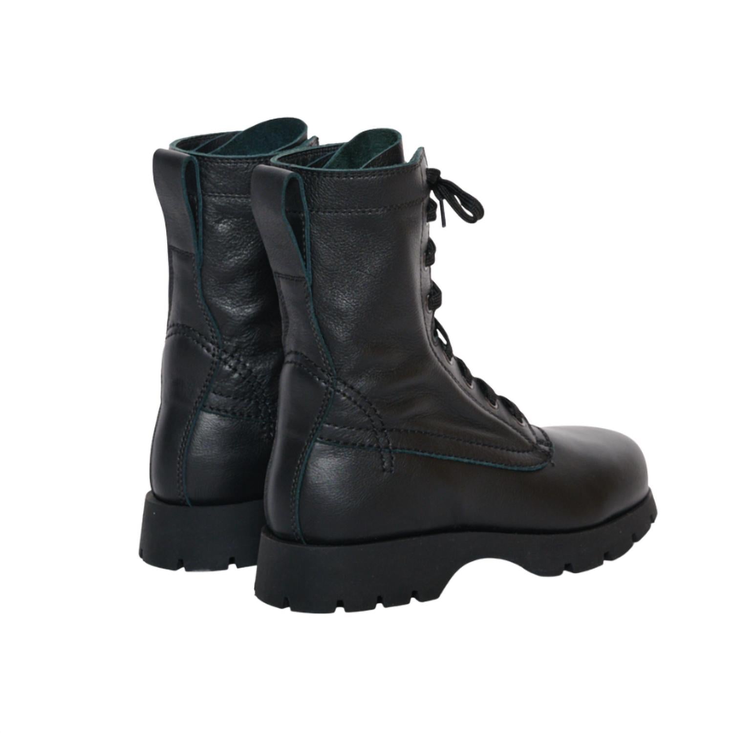 So versatile, you can wear these boots with your favorite jeans or even a dress for a more feminine feel. Discover timeless minimalism with Jil Sander’s Black Leather Combat Boots, expertly crafted in Italy. Featuring a sophisticated leather upper and durable rubber sole, these boots are perfect for the grunge trend of the autumn-winter season. The round toe design is paired with a platform heel, and the lace-up front allows a customizable fit. A pull tab at the heel offers easy slip-on access and superior traction completes their functionality for any adult woman.