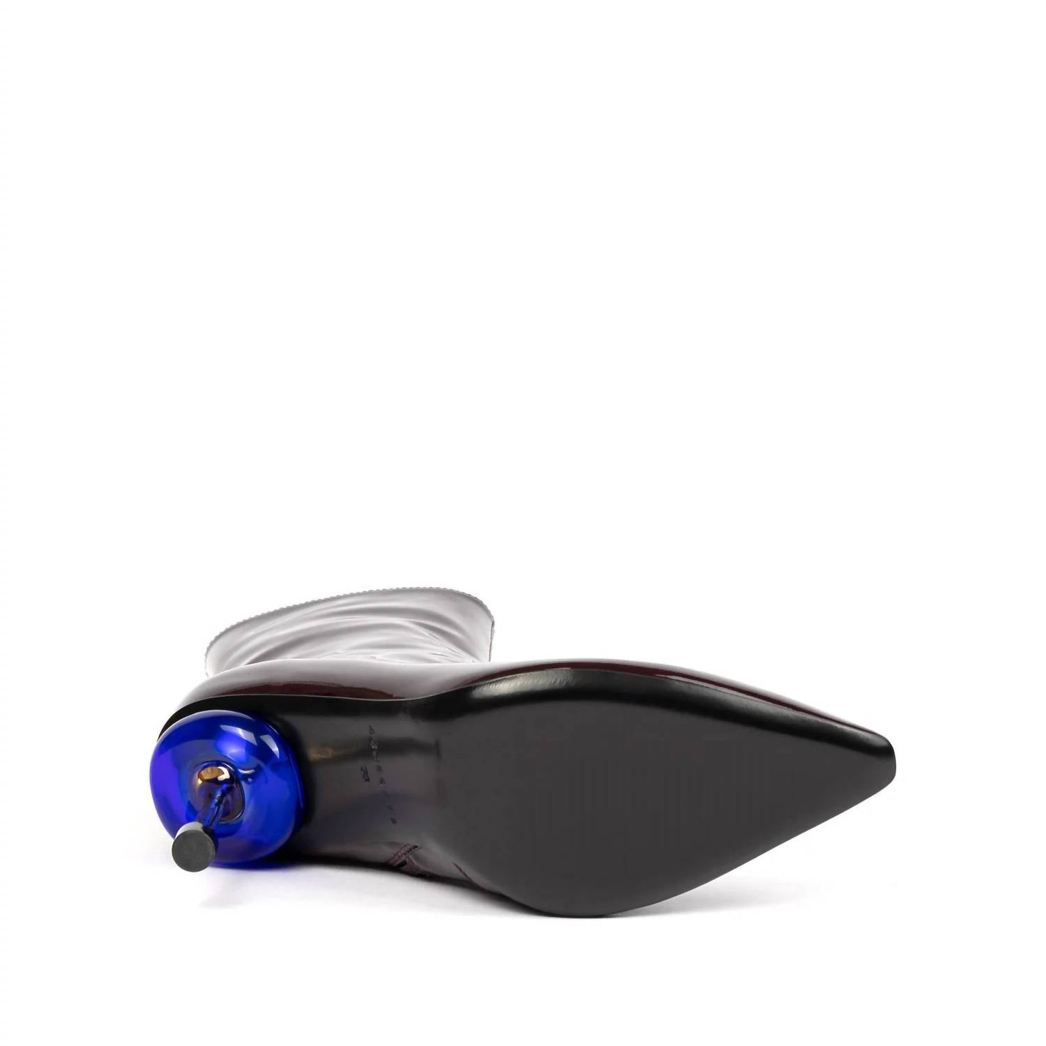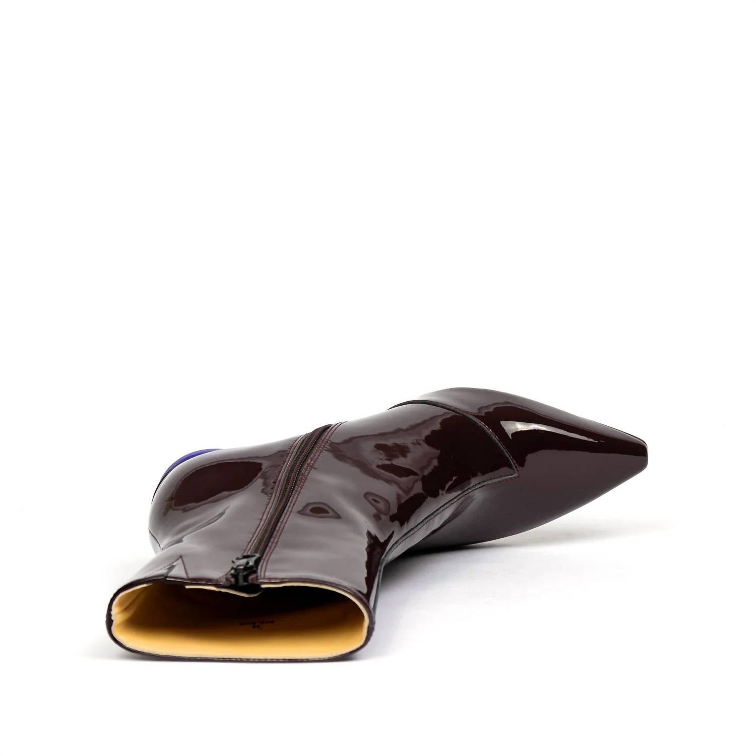 Step out in confidence and showcase your impeccable taste with these fashionable and versatile boots. Their classic style will have you reaching for these boots season after season. Step into sophistication with the Osha Nox Hi ankle boots by 4CCCCEES, elegantly crafted in a striking Plum Patent hue. These women's heeled boots feature a pointed toe and metallic chrome stiletto heel, complemented by an oversized top section for added chic allure. Enhanced with practical zipper fastenings, they are inspired by the cascading motion of water droplets, effortlessly balancing formal allure with a playful edge. Ideal for those preferring a narrower fit, these boots are perfect for elevating your understated, sophisticated look.