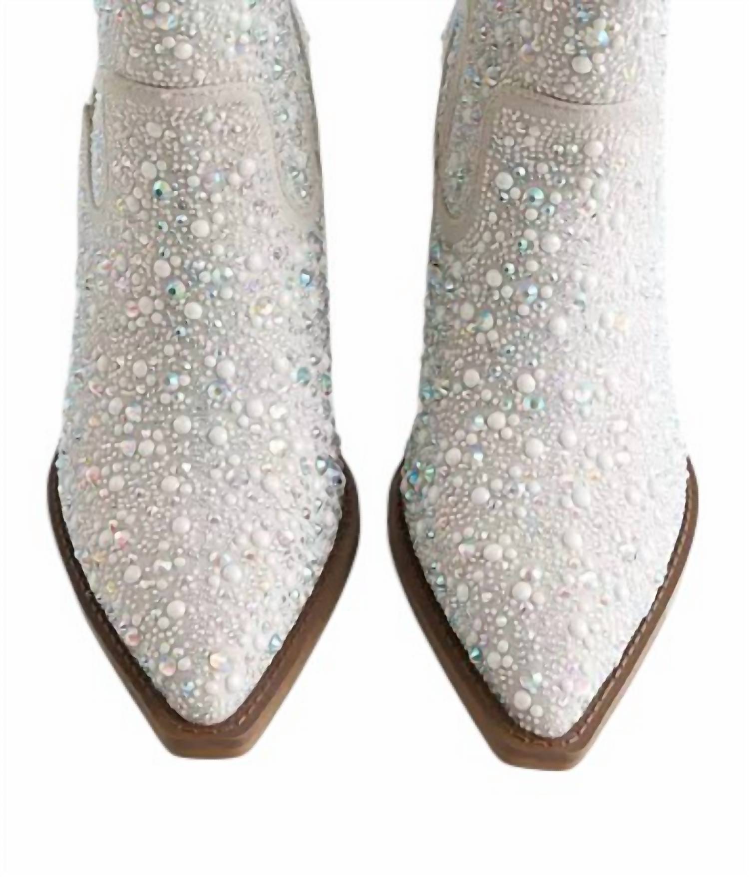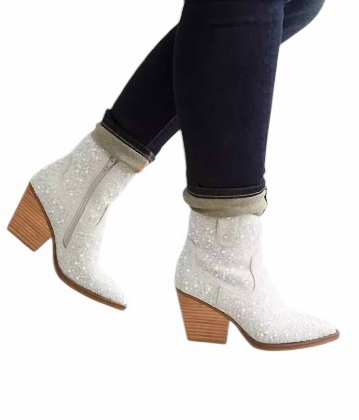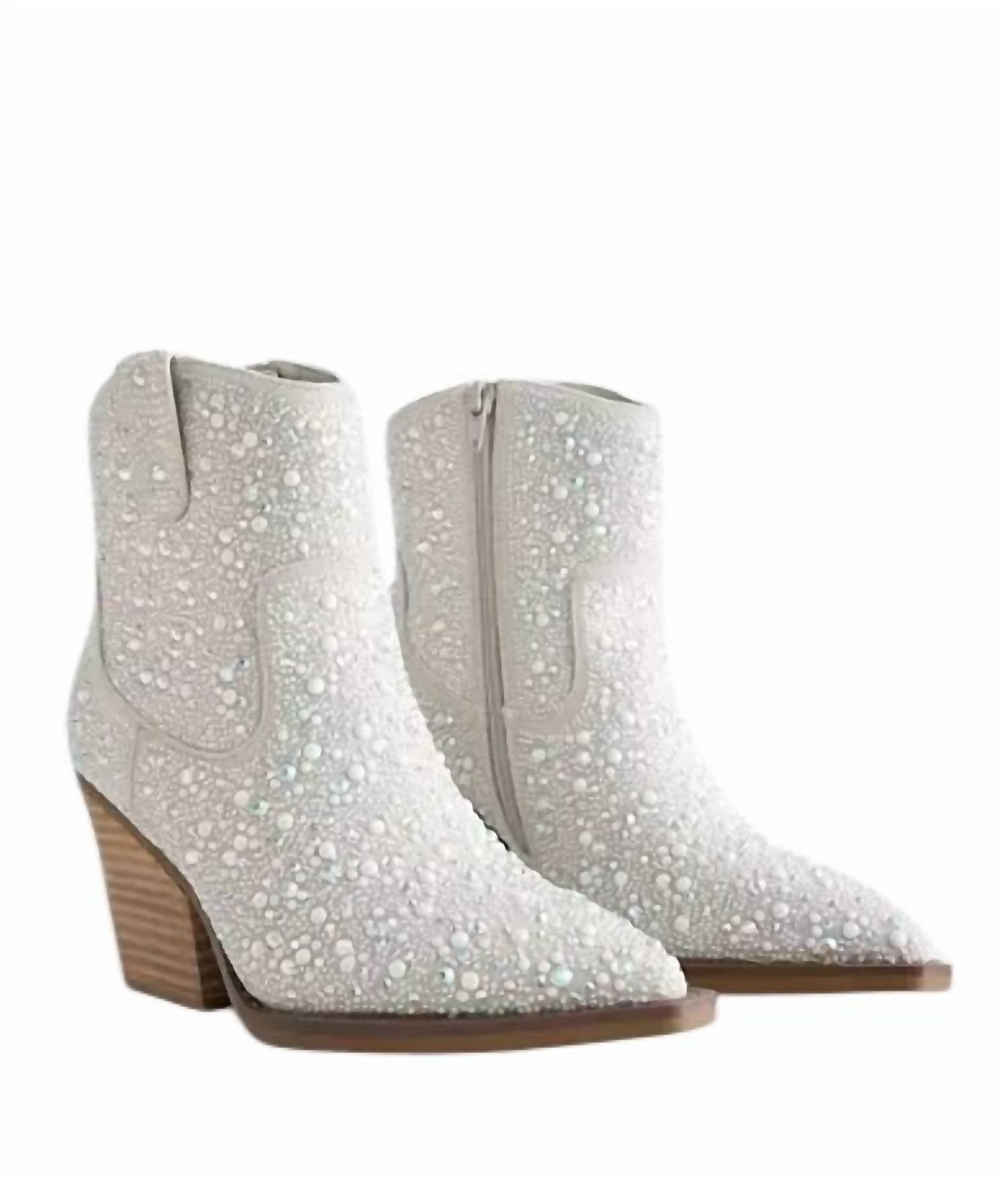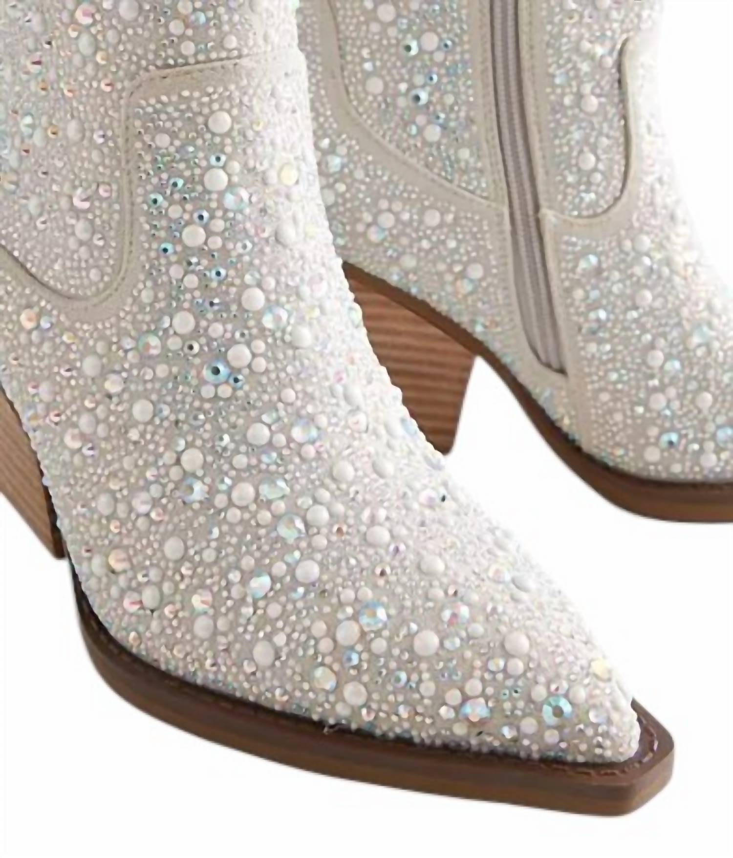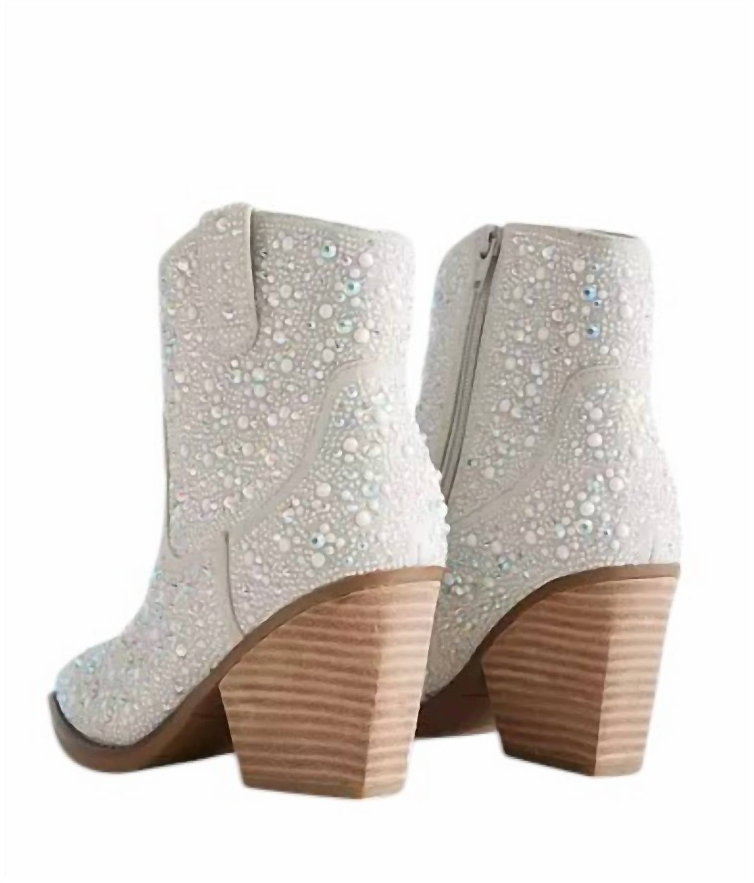 This bootie features faux pearl and rhinestone details on a faux suede upper. It has a side zip detail for easy wear, a cushioned footbed for comfort, and a 7.5" shaft. The 3.25" heel adds height and style. Imported.