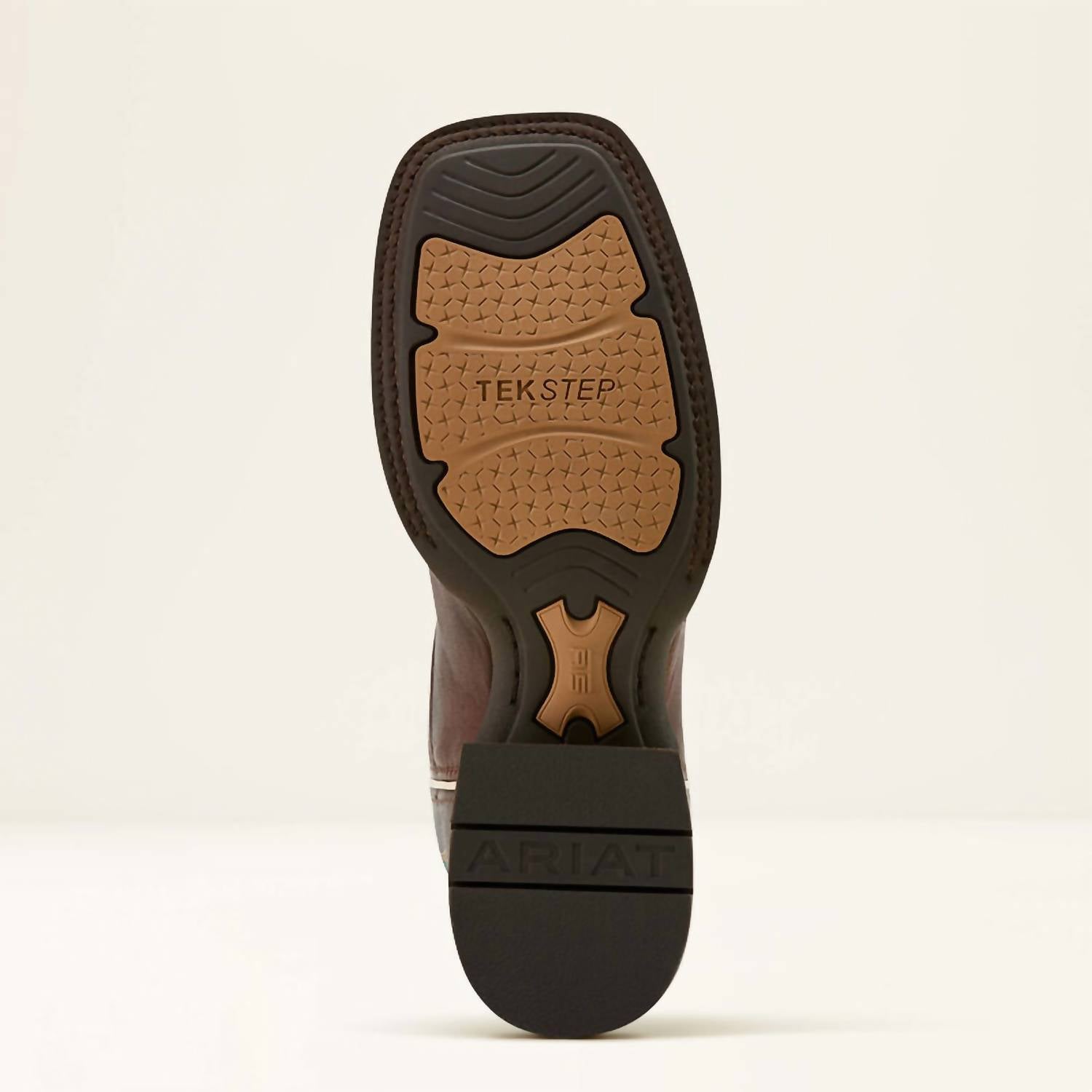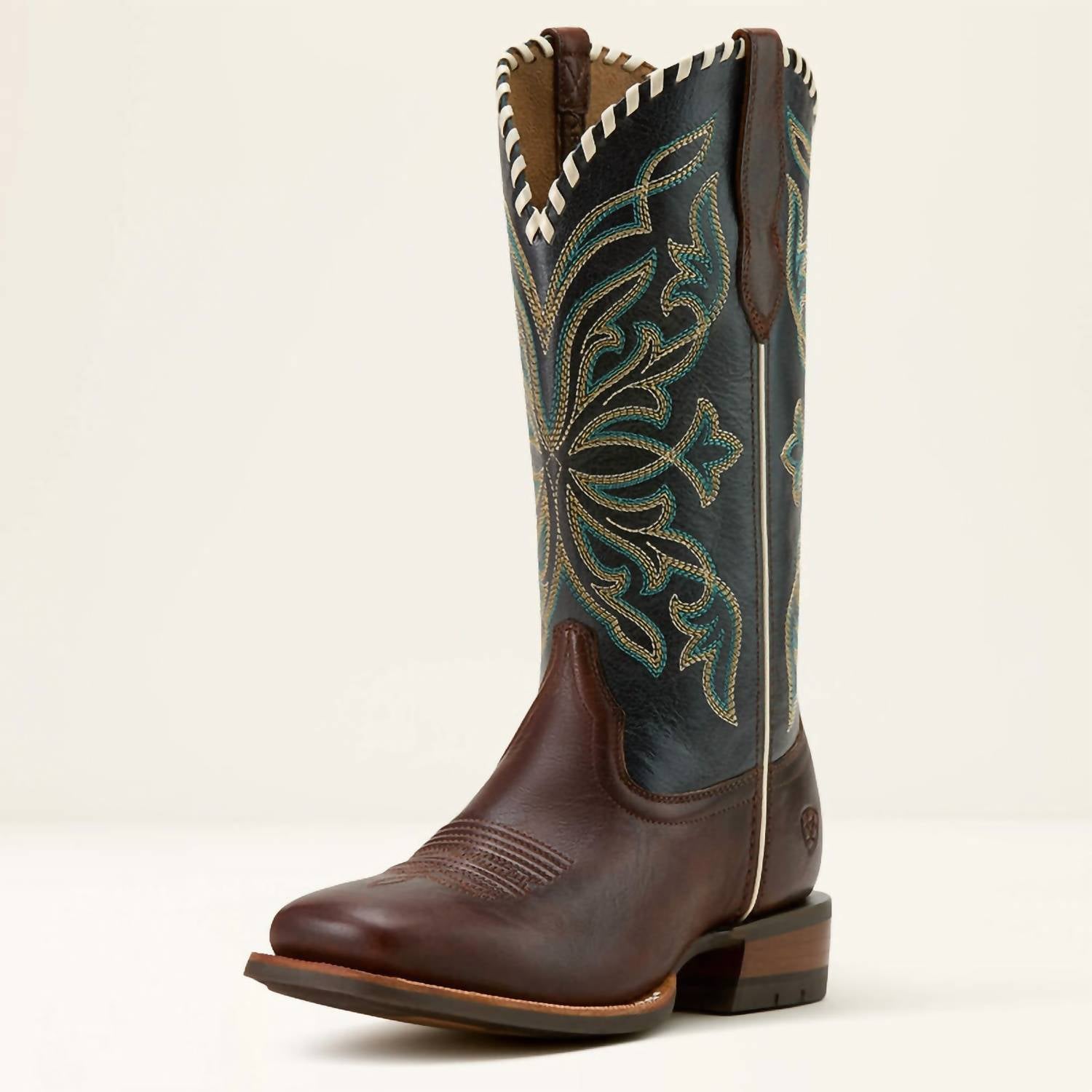 A stylish boot with a comfortable fit and the perfect amount of height. These classic boots are the perfect addition to any outfit and can be worn season after season. Step into style with the ARIAT Women's Showdown Western Boots in Espresso Textured Blue, perfect for a holiday party or summer gatherings. These boots feature a 12" shaft height and a low 1.5" horseman heel with a wide square toe. Crafted from full-grain leather with a synthetic lining, they offer comfort with a removable All Day Cushioning insole and ergonomic support through ATS® technology. The stylish five-row stitch pattern and whipstitched topline enhance their Western charm.