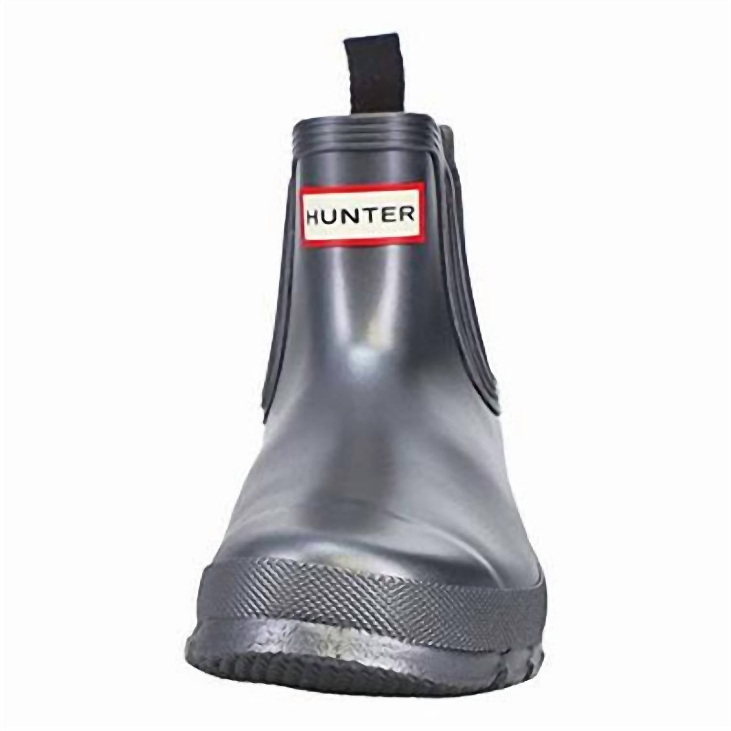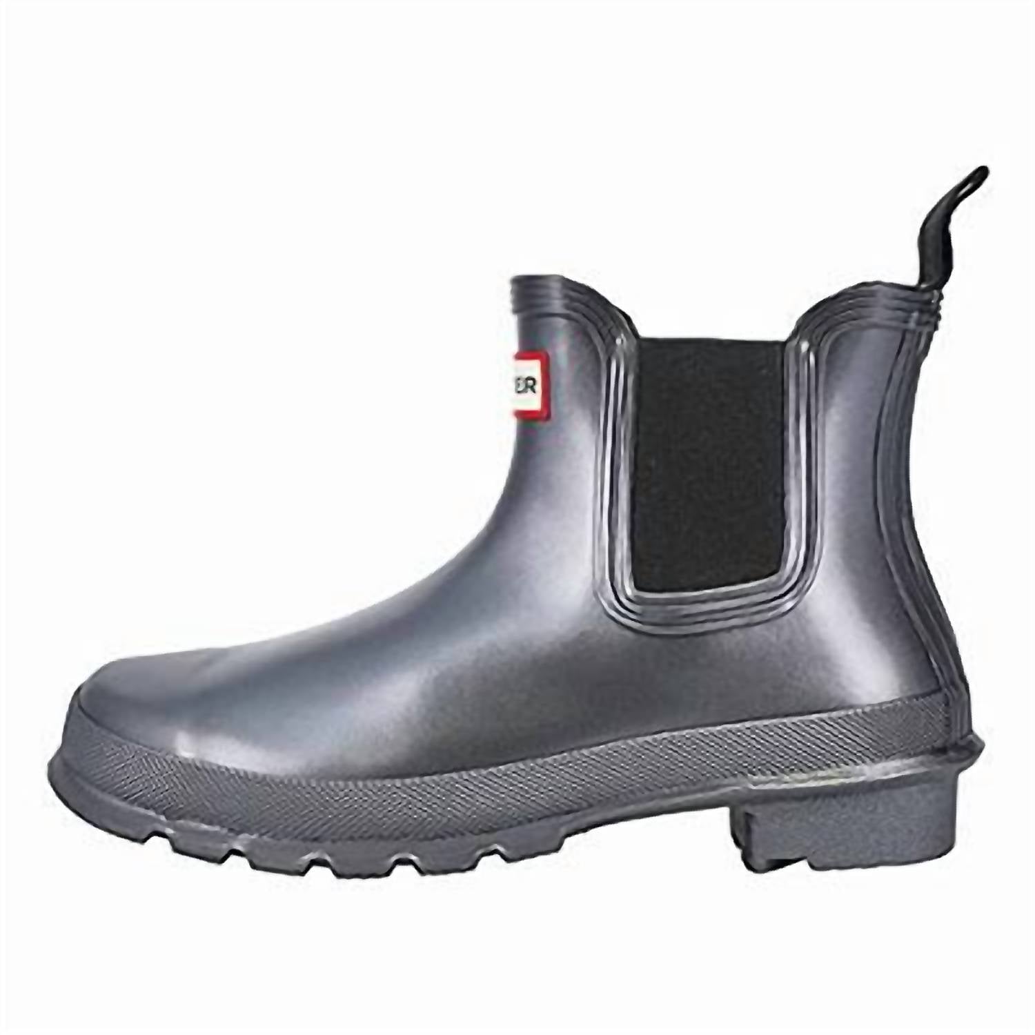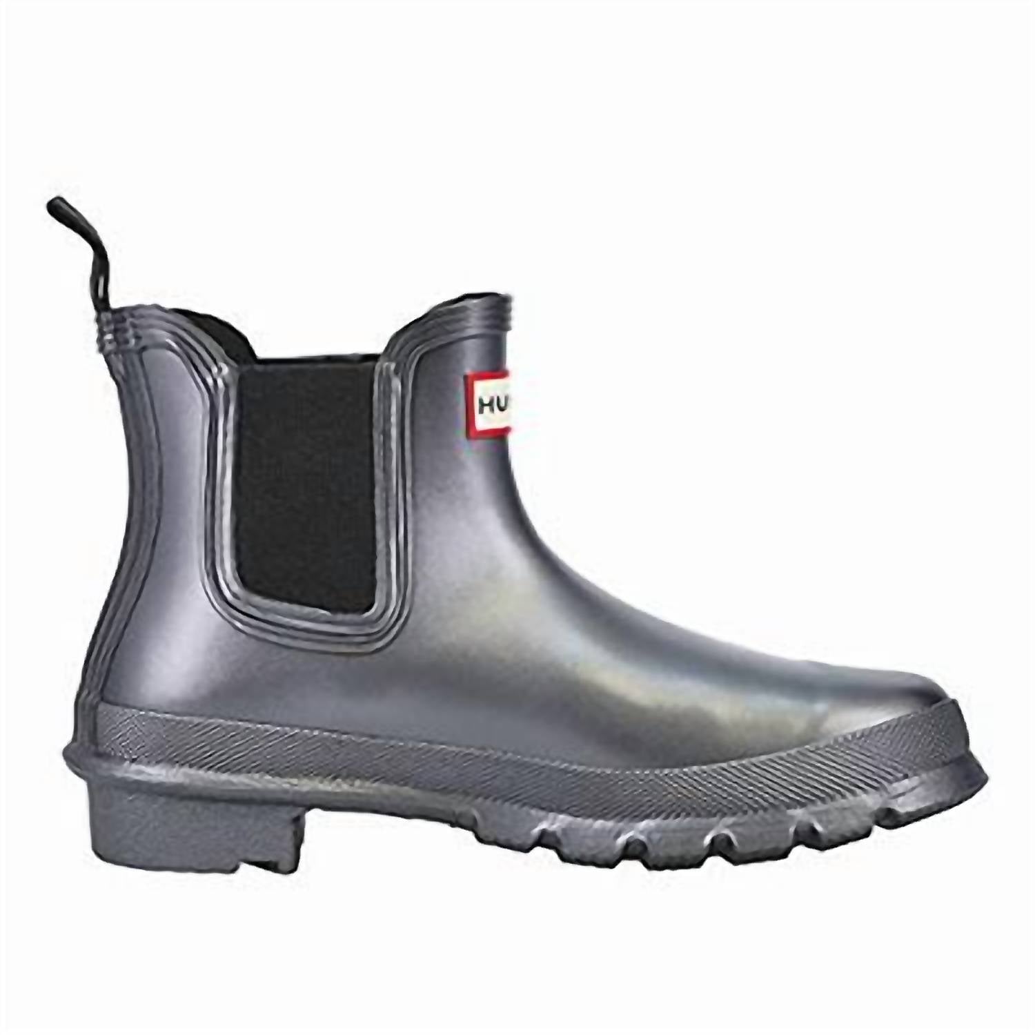 Natural vulcanized rubber with an iridescent finish .Polyester lining. Elastic side gussets and nylon tongue. Rubber outsole with Hunter Original pattern