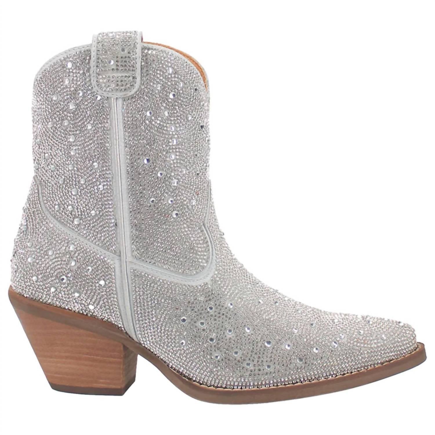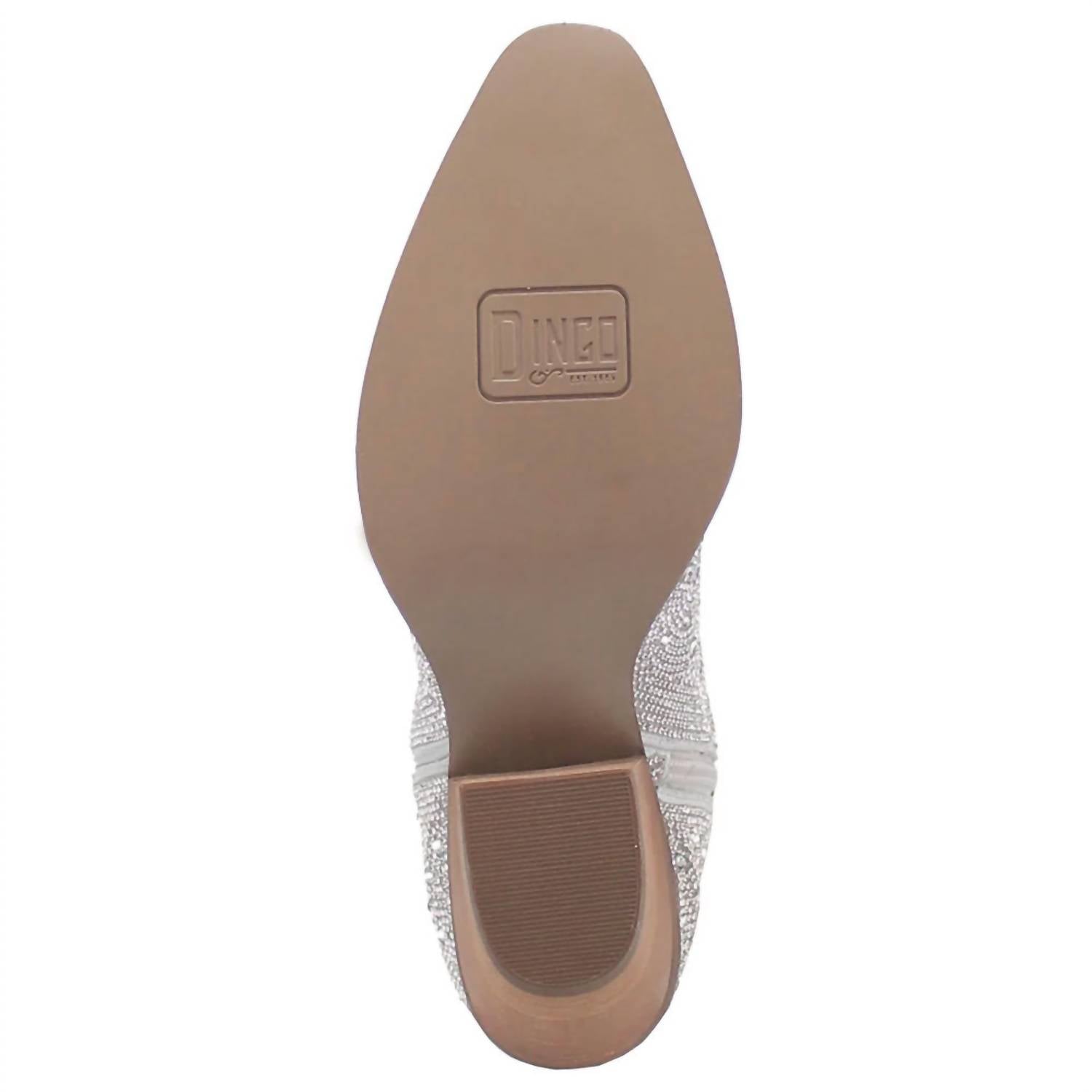 Say hello to the perfect, most versatile boot. The ankle height makes this style easily transition from day to night. Wear them with your favorite skinny jeans and tee for a more laid back look, or pair them with your favorite mini dress and jacket for a night out on the town. Step into sparkle with the Women's Rhinestone Cowgirl Short Boot by Dingo, designed to bring glitz to any outfit. Crafted from premium leather, this ankle boot features a 7" shaft and an 11" circumference, highlighted by a mid-height block heel at 2.5". The boot dazzles in stunning silver, adorned with rhinestones, while the pointed toe and rubber sole add both style and comfort. Complete with a cushion comfort insole, it's the perfect blend of Western charm and modern elegance.