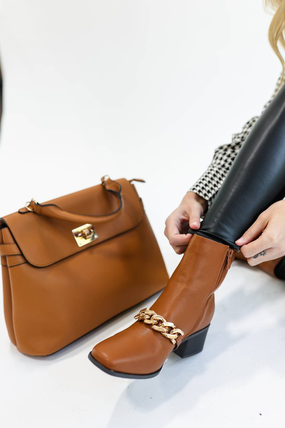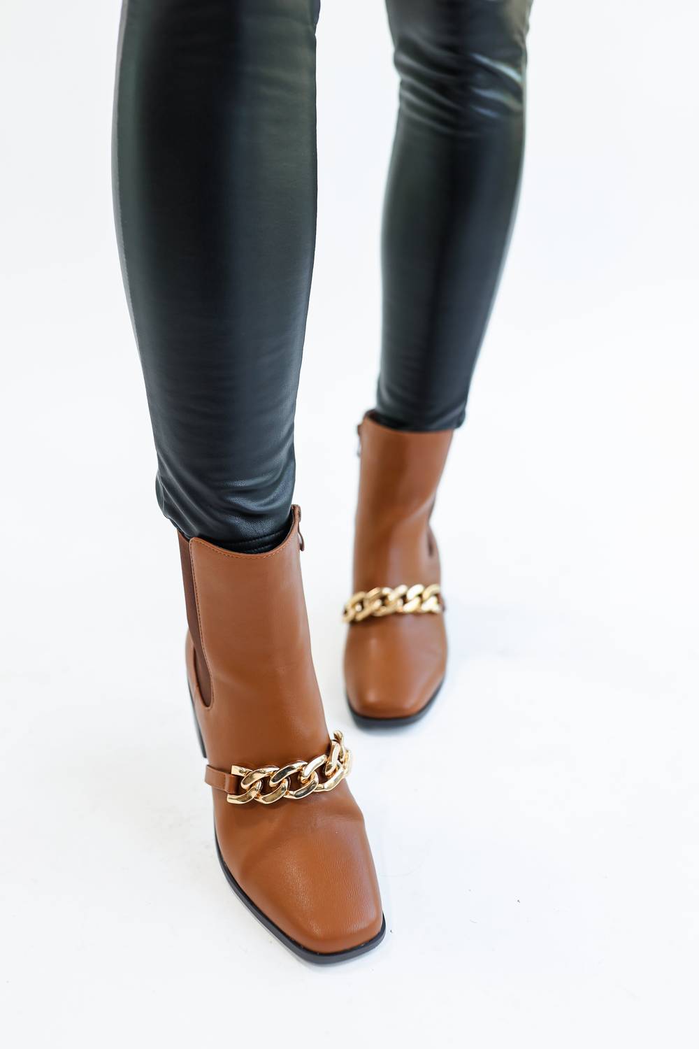 This Michelle bootie features faux leather material with a gold chain across the top, a rounded square closed toe, a 1.5-inch block heel, an inside ankle zip closure, and an above-the-ankle silhouette! This bootie runs more true to size.