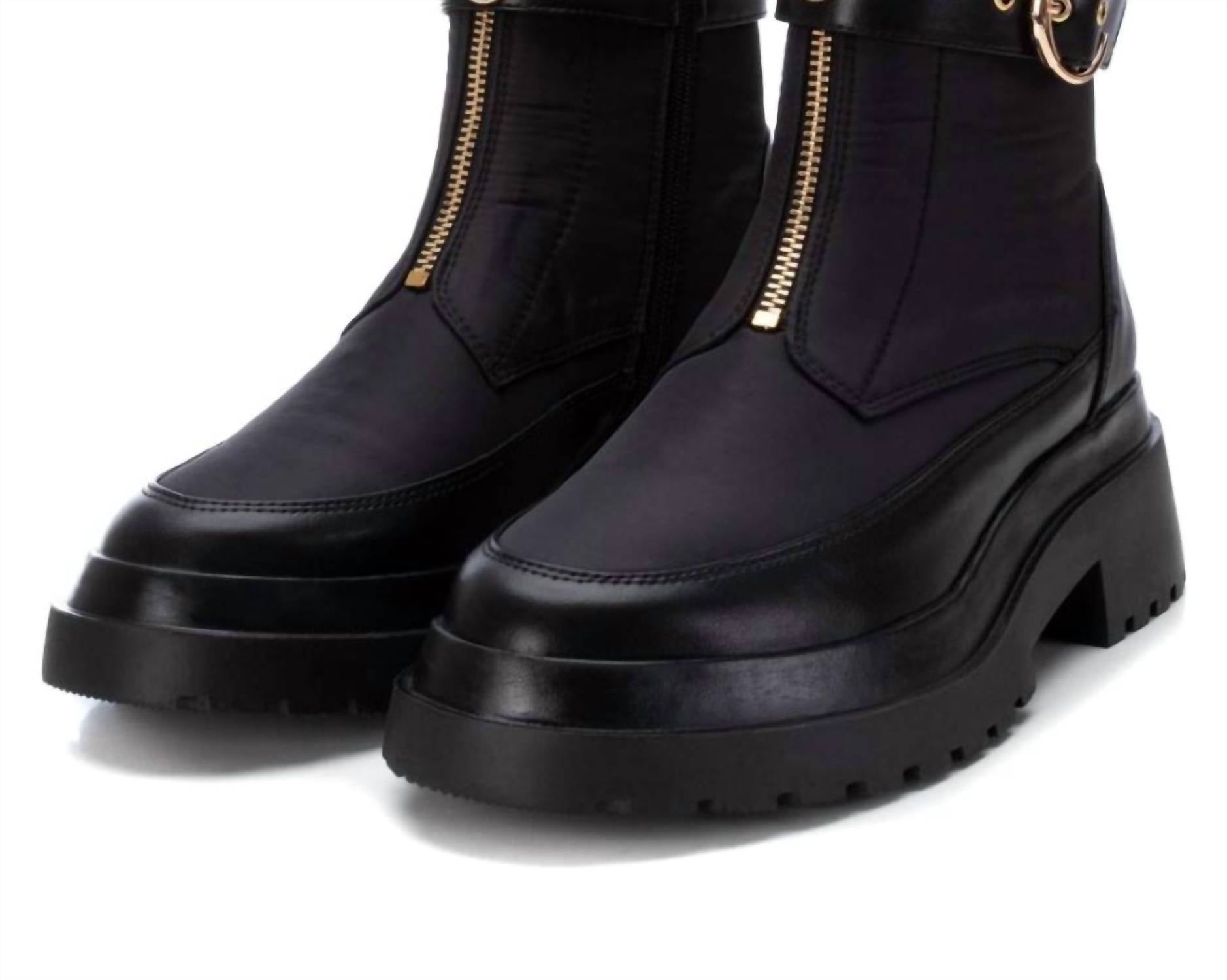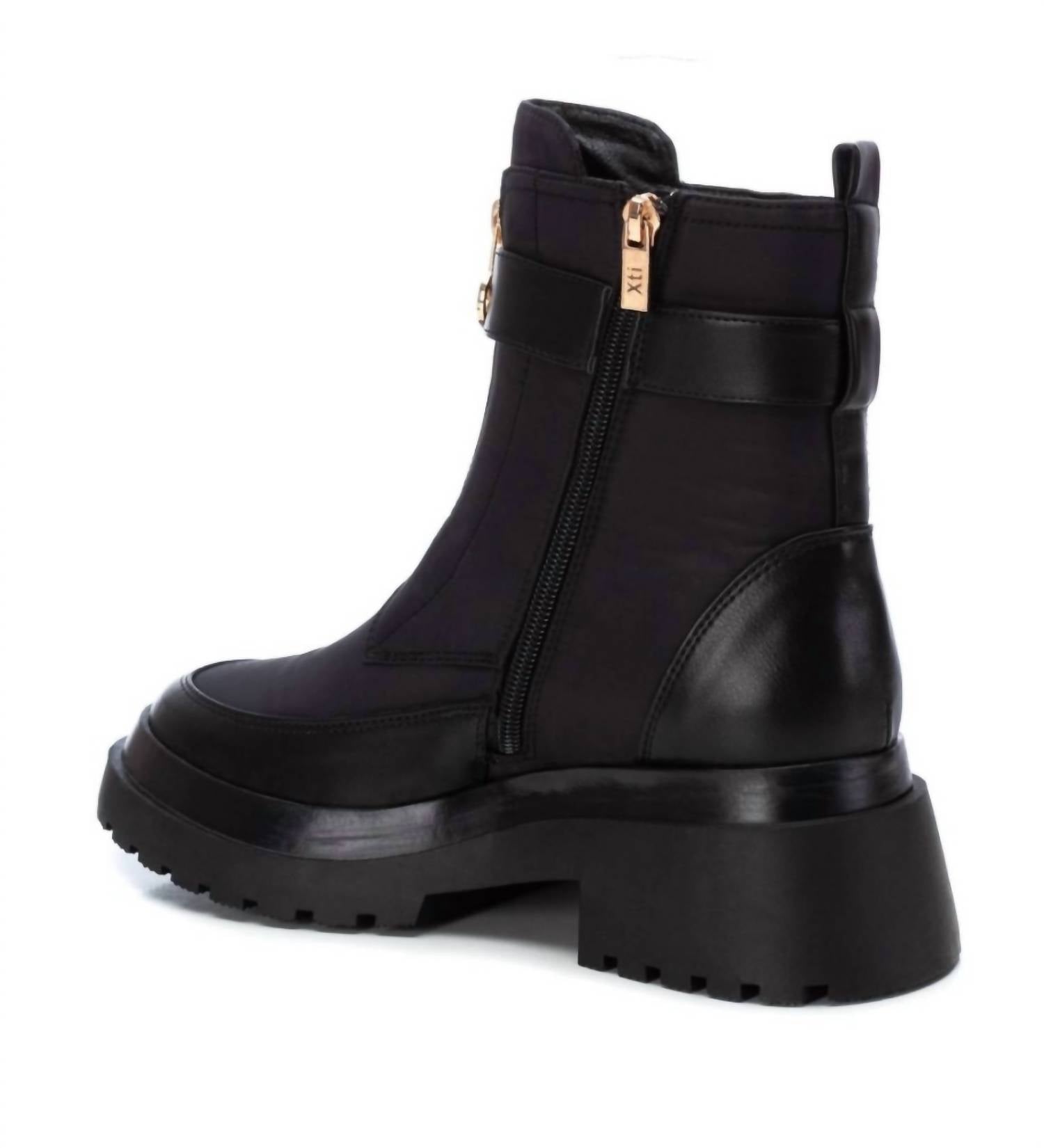 Made in nylon combined with material that imitates leather. Decorative front zipper and strap with buckle detail. Side zipper closure. Lightweight non-slip rubber sole.