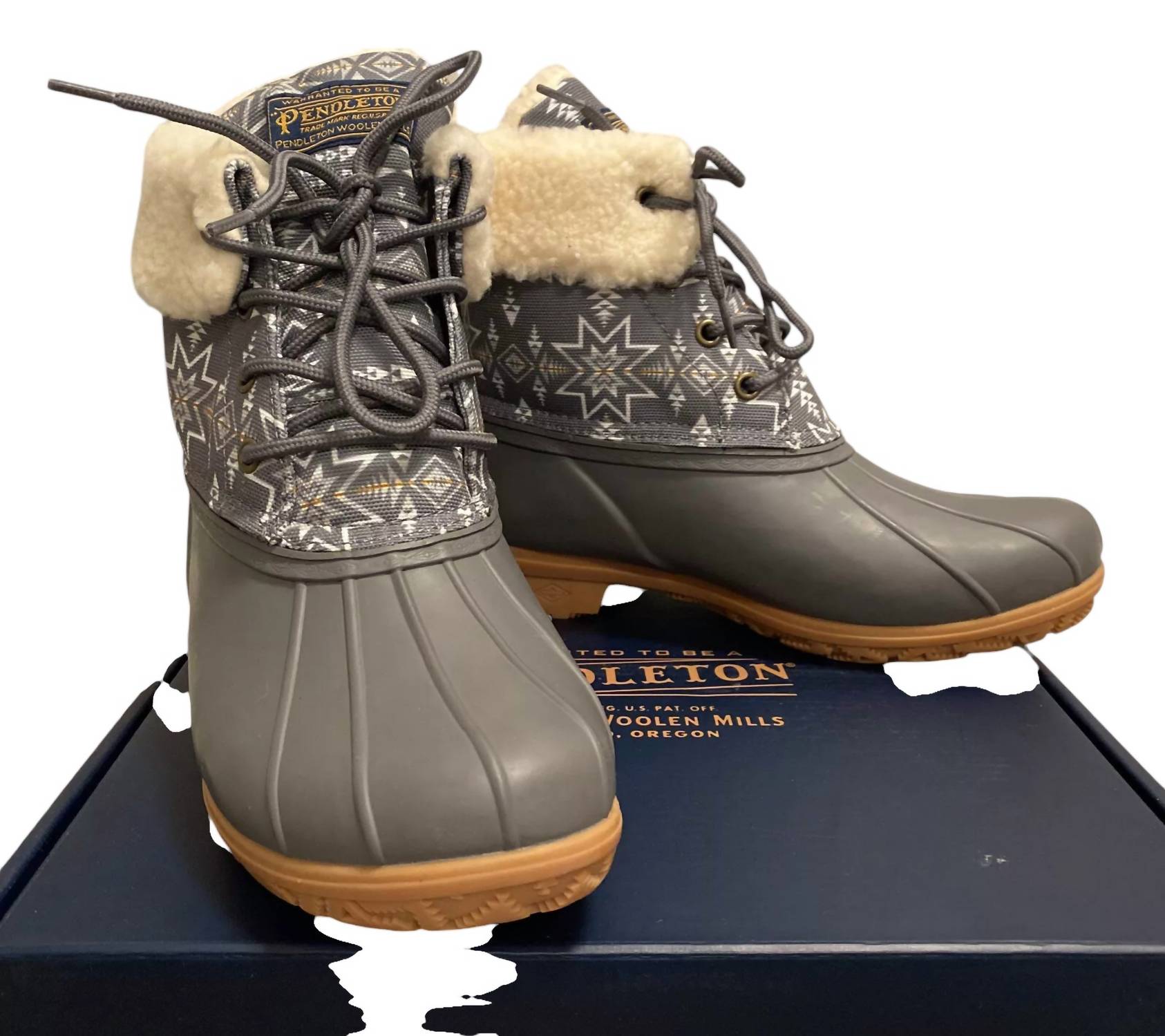 These classic duck boots with a Pendleton touch combine style and functionality. Waterproof with premium rubber construction and waxed cotton uppers showcasing the Journey West pattern, they offer no-slip soles for traction in any condition. The cushioned insoles and internal shank system provide all-day comfort and support, while the moisture-wicking linings keep feet dry. A convenient pull-tab allows for easy on-and-off. 7¼" height; 12-14" circumference. 1½" heel.