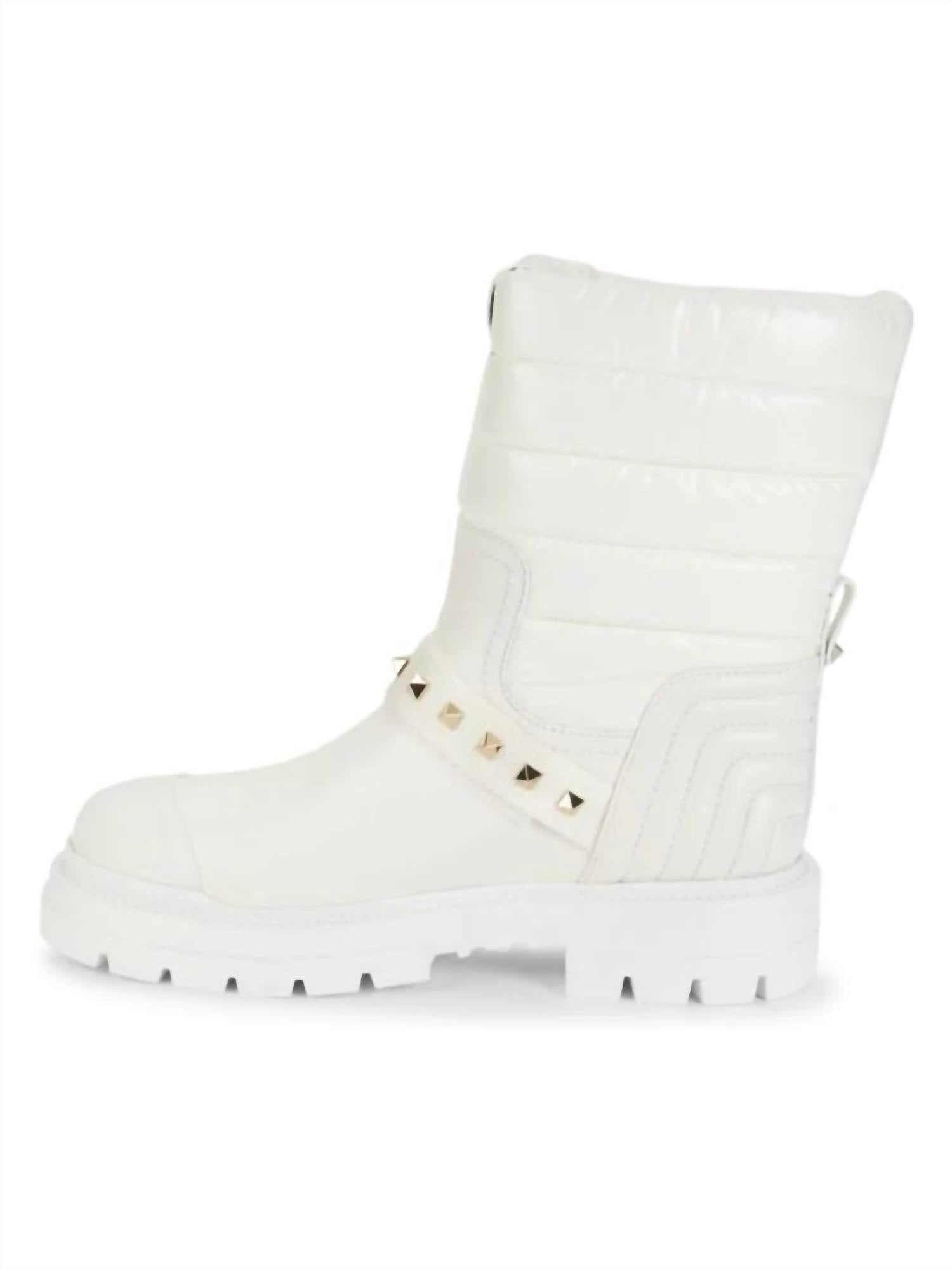 Say hello to the perfect, most versatile boot. The ankle height makes this style easily transition from day to night. Wear them with your favorite skinny jeans and tee for a more laid back look, or pair them with your favorite mini dress and jacket for a night out on the town. Step into sophistication with the Women's Calfskin Leather Ankle Boots by Valentino Garavani in Whisper White. Made in Italy, these boots boast a premium calf leather upper and a leather and fabric lining, complemented by a faux-buckle fastening. The iconic platinum-plated pyramid studs accentuate the design, offering a striking silver-toned finish that enhances their round toe and block heel silhouette. Perfect for the fall season, these boots feature a leather insole and durable rubber sole, ensuring both luxury and functionality.