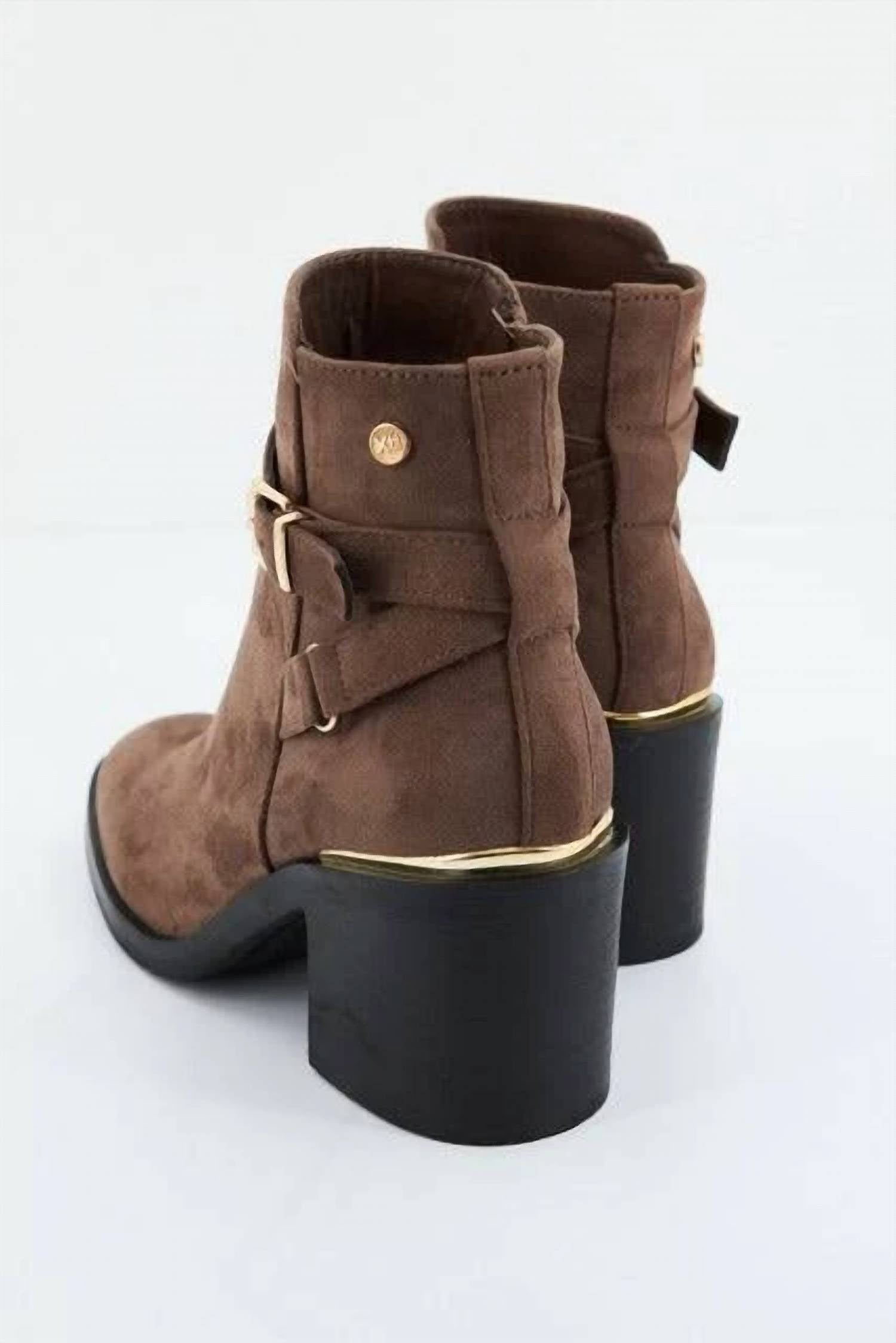 Women's Suede Dress Booties from Xti. Sleek black ankle boots crafted from sumptuous suede. Chic decorative buckle strap. Convenient side zipper closure. Lightweight, non-slip rubber sole for stable footing. Perfect fusion of casual elegance and everyday wearability. Versatile for both day and night outfits. Essential addition to any fashion-forward collection.