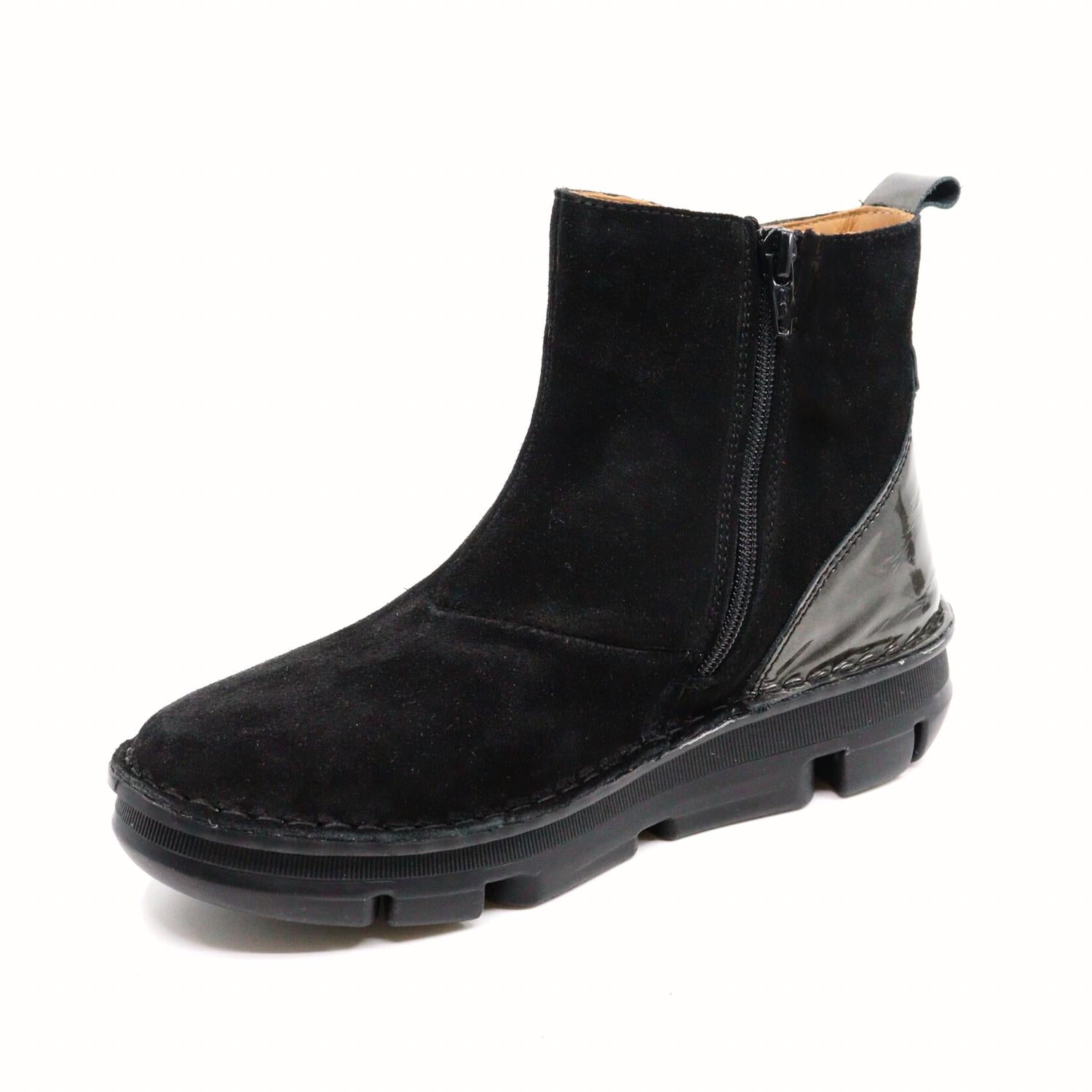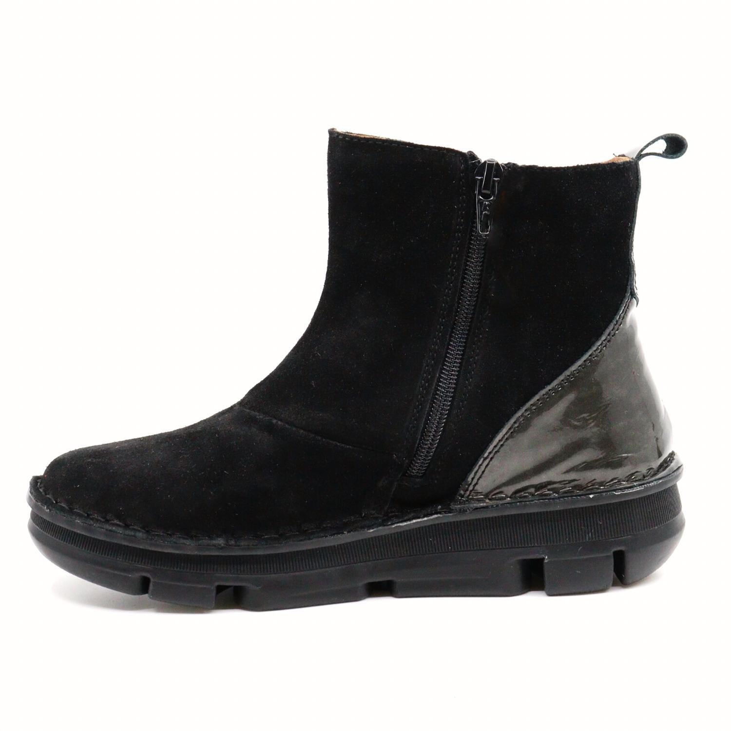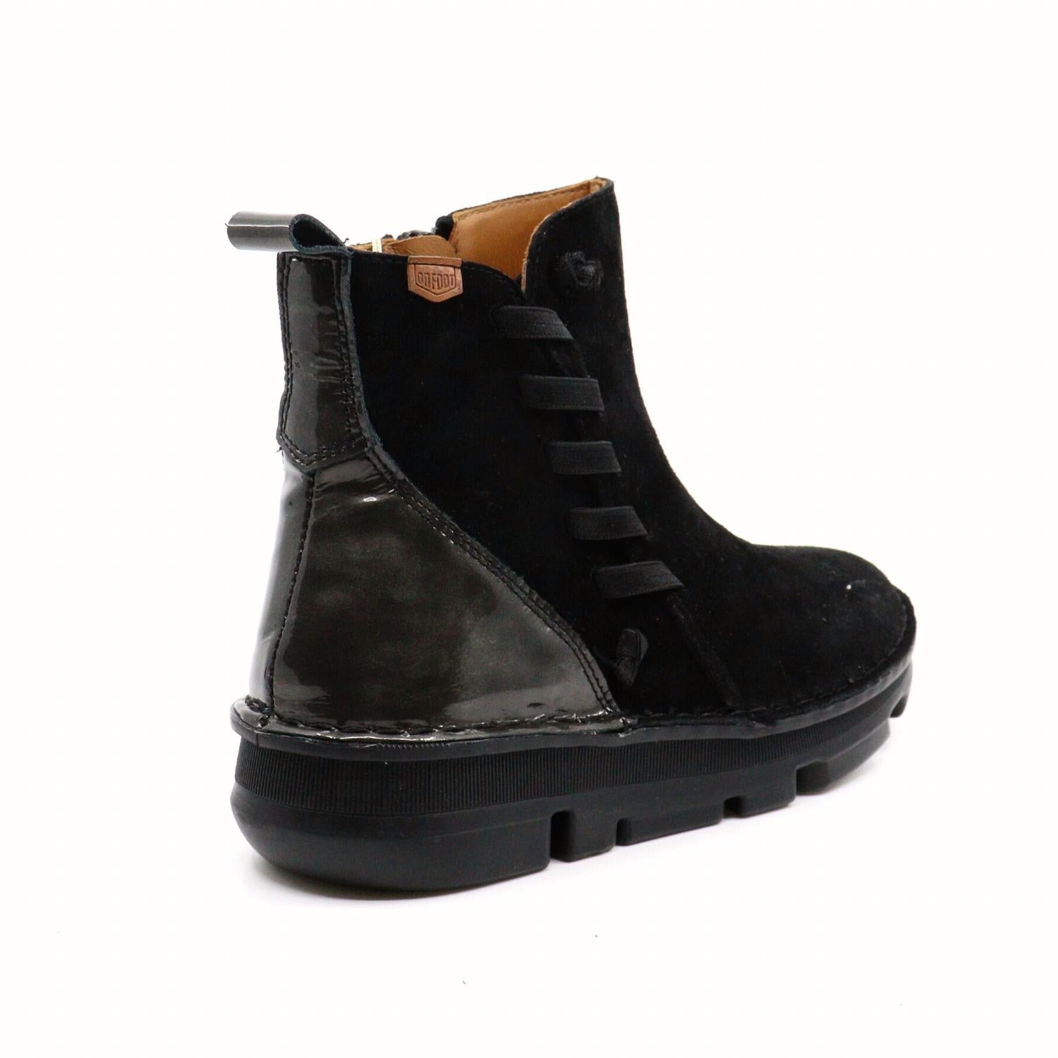 This boot featuring woven ribbon detail with a back pull tab and soft nubuck leather is an easy closet staple. Part of "ZEN Technology" inspired in reflexology, the footbed massages key areas of your feet while walking, relieving foot muscle stress and increasing the circulation. This shoe runs small, our store team recommends sizing up a full size! 1" heel; 1/2" platform. 4 1/4" shaft. Pull-on style. Removable insole. Leather and textile upper/textile lining/synthetic sole. Made in Spain