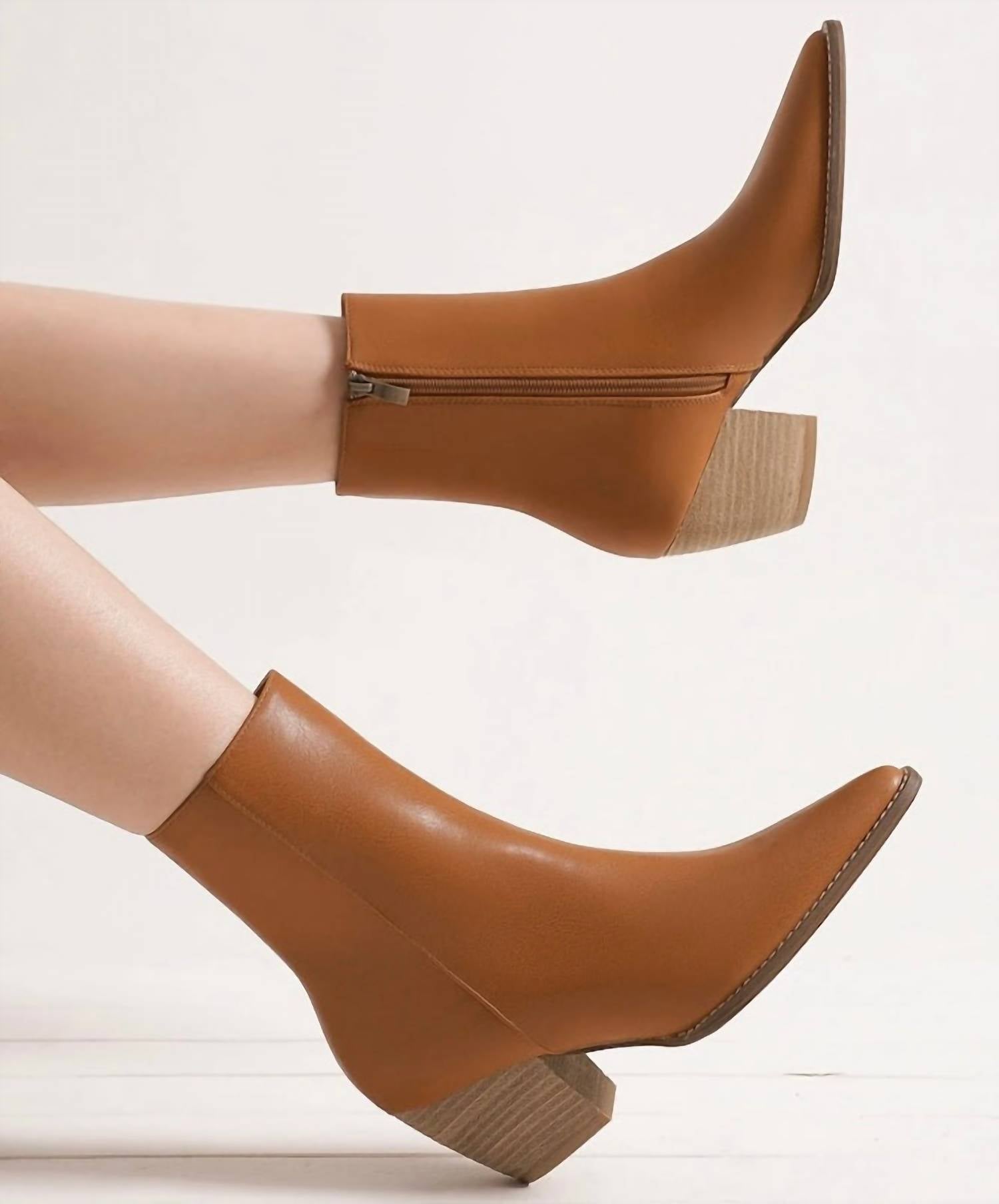 Upgrade your shoe game with these classic heeled boots, designed to merge sophistication and style. Comfortable enough for long days or a night out on the town. Step out in style with the Women's Arisa Bootie by CCOCCI, a chic camel ankle boot designed for the fashion-forward woman. Featuring a stacked 2.25-inch block heel and a pointed toe, this bootie combines elegance with comfort. Crafted for easy wearability with a convenient side zip closure. A perfect addition to any wardrobe, these booties enhance both casual and upscale looks.