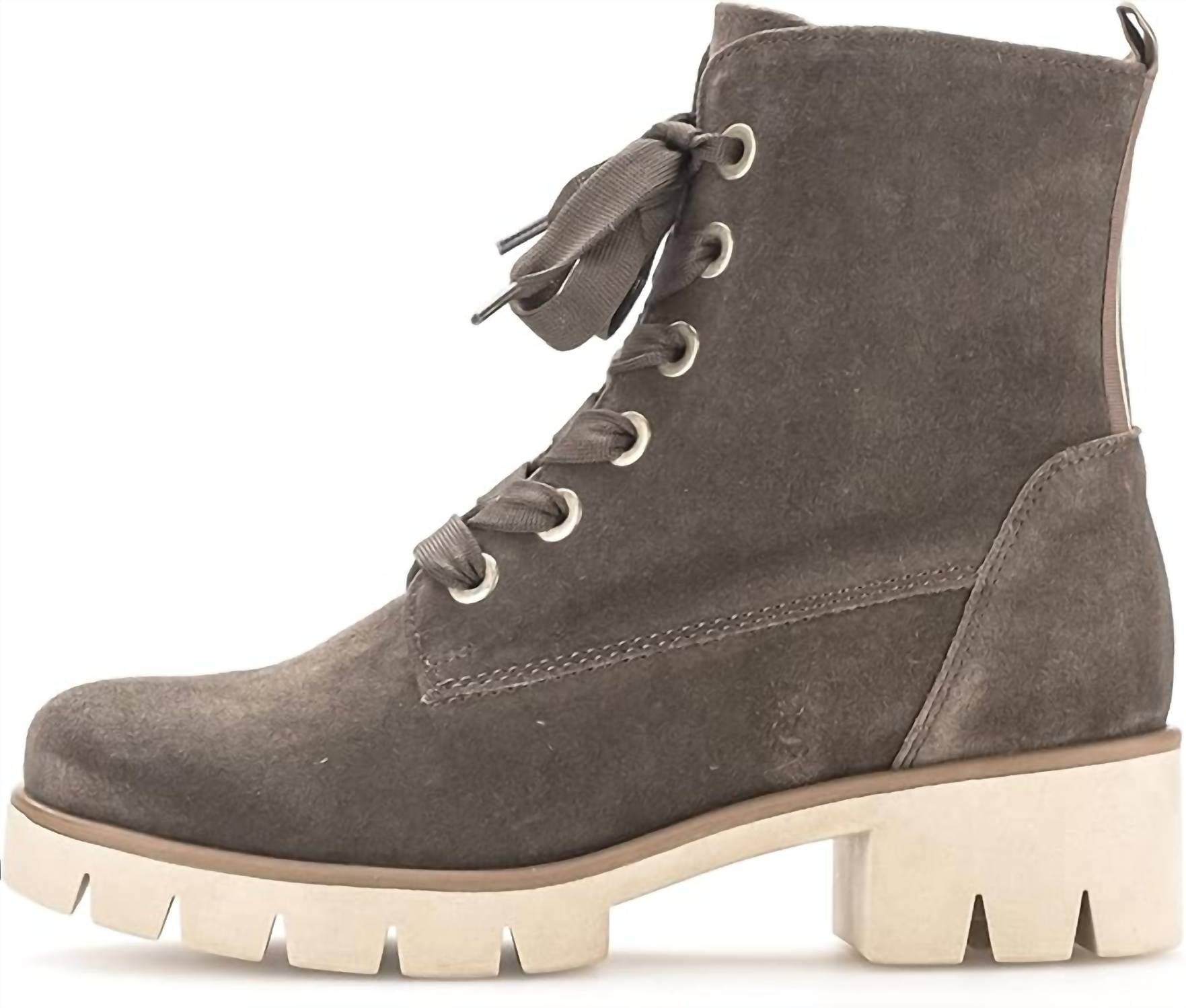 A stylish lace-up boot with a comfortable fit and classic design. Versatile enough to wear with almost every outfit, your closet and feet will be thanking you. Enhance your wardrobe with the Women's Lace-up Boots by GABOR, a blend of style and comfort in Dark Taupe. These boots feature a suede leather upper and a trendy almond toe, set on a 2" chunky heel with a 1" lug sole for a unique Western-inspired look. With a 6.5" shaft height and made in Portugal, they secure comfortably with both a lace-up and inner zipper closure. Ideal for summer vacations, these faux leather boots ensure both durability and chic style on every step.