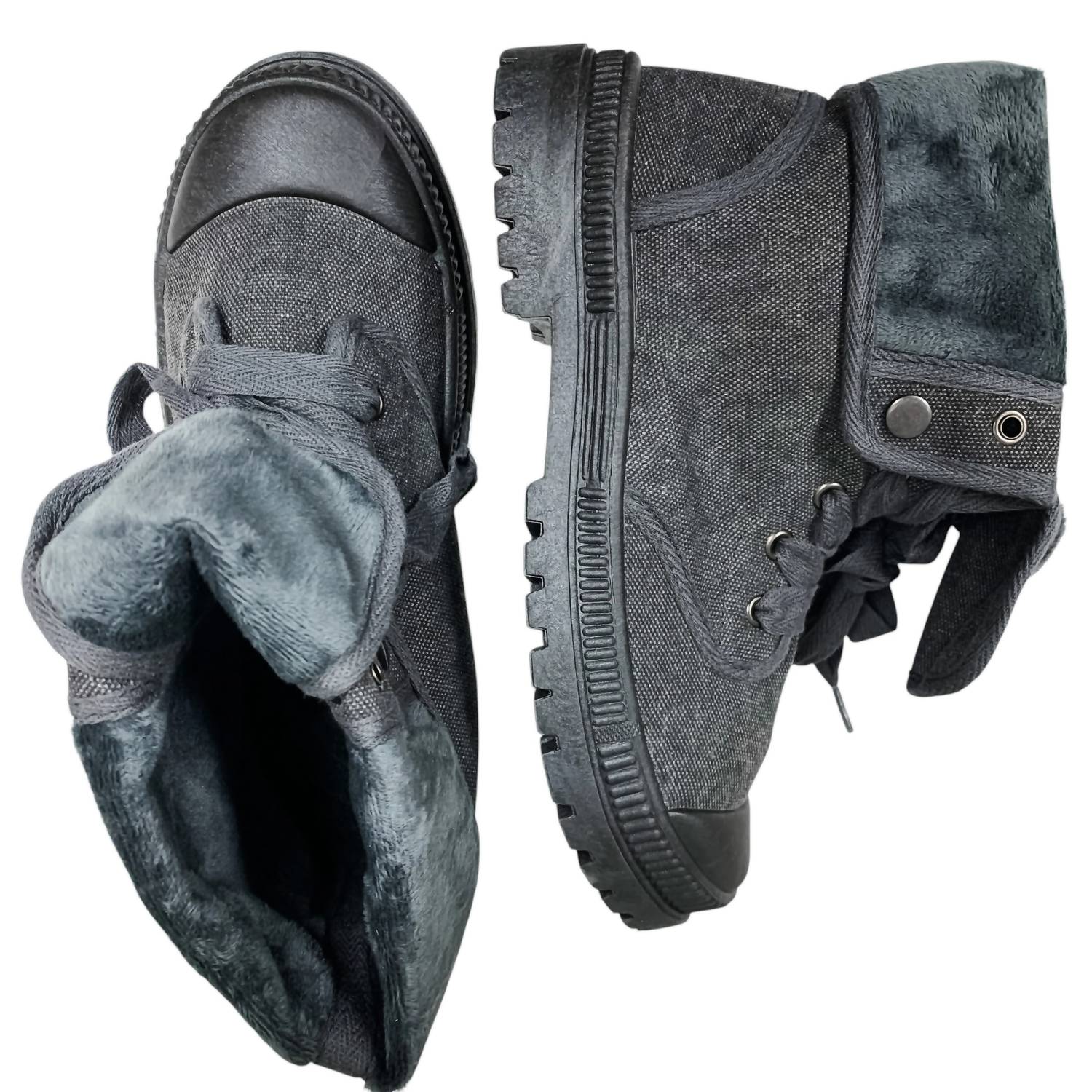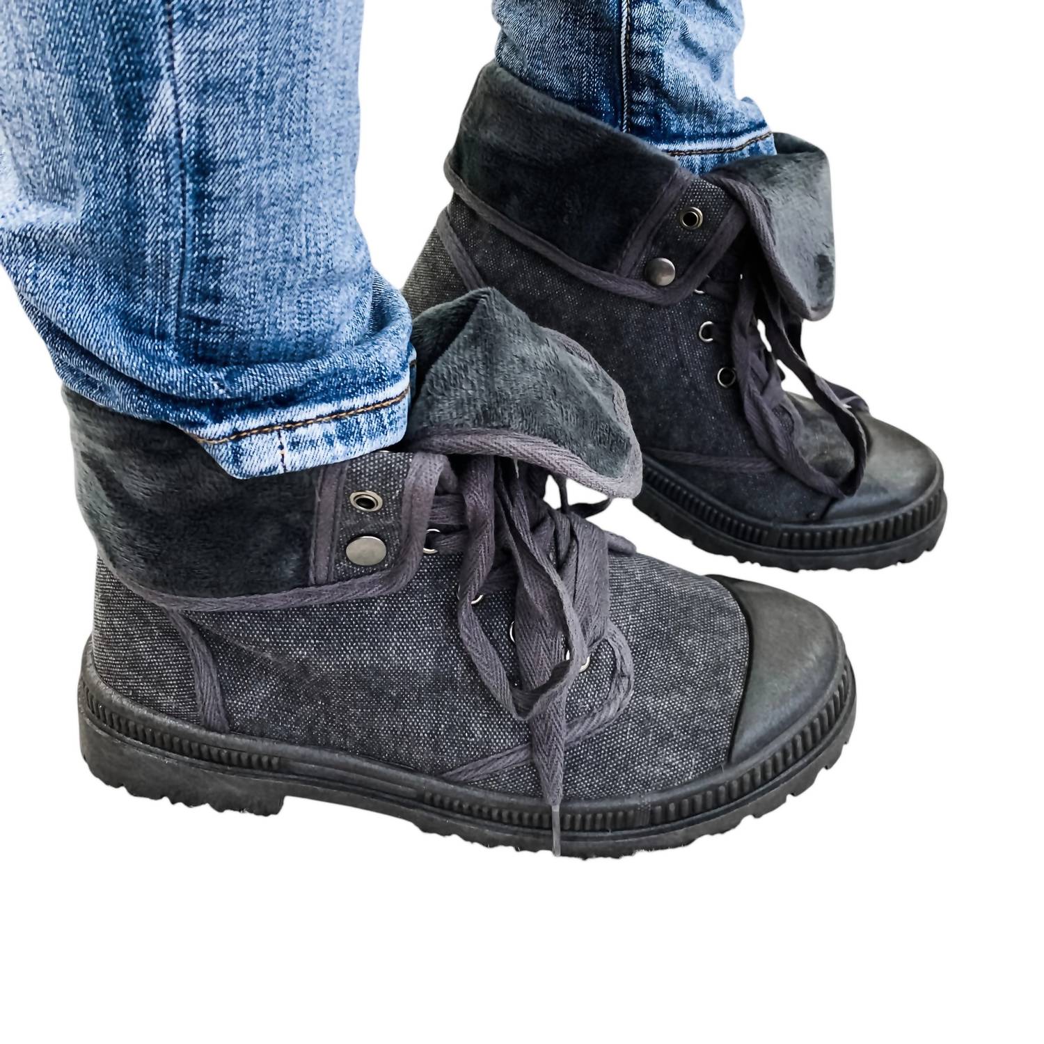 This foldover combat boot features a 1" rubber sole, a padded footbed for comfort, and a rounded rubber toe. The canvas upper is lined with soft faux fur, and it includes a foldover snap option for versatile styling.