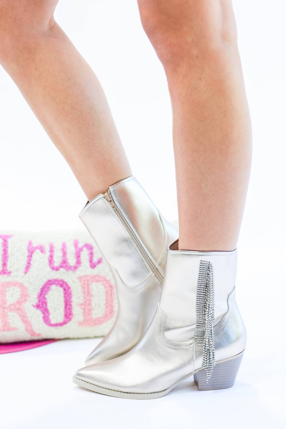 This cowboy boot features faux leather material with silver rhinestone fringe accent. pointed closed toe, 2-inch block heel, an inside zipper, and above-the-ankle silhouette! This boot runs more true to size.