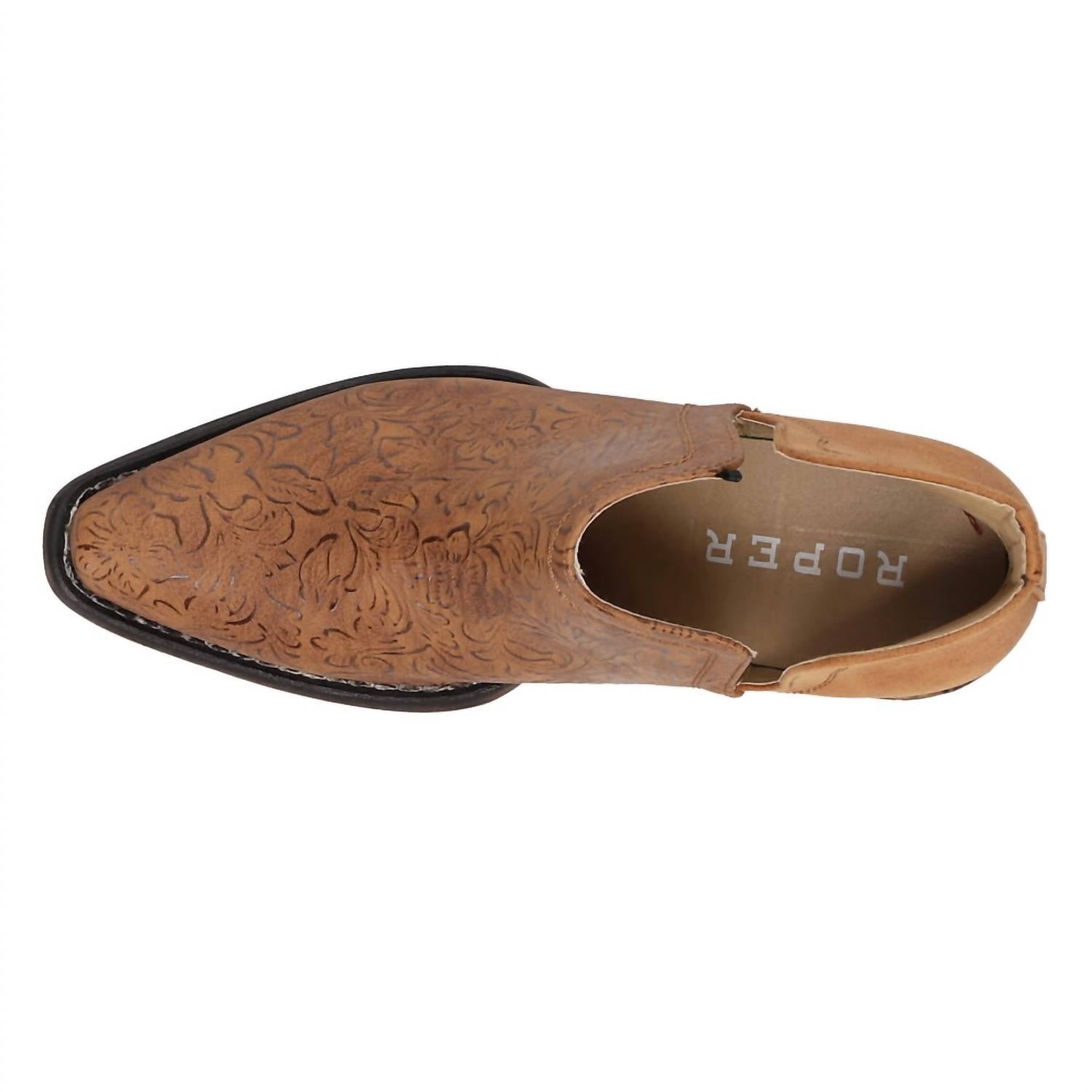 Say hello to the perfect, most versatile boot. The ankle height makes this style easily transition from day to night. Wear them with your favorite skinny jeans and tee for a more laid back look, or pair them with your favorite mini dress and jacket for a night out on the town. Step into timeless style with the Women's Snip Toe Ava Embossed Bootie by ROPER, perfect for your next vacation. Crafted from faux leather, this bootie features a pointed toe and a chic block heel with a height of 1.5 inches, categorized as low. Designed in a trendy Western style, these ankle boots are an ideal addition to your fall wardrobe. Experience comfort and charm with every step!
