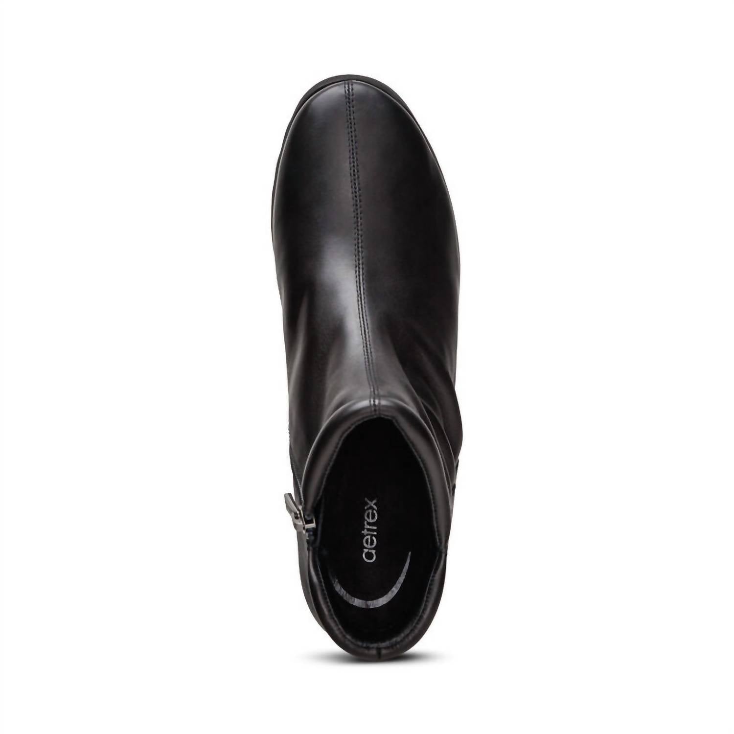 Say hello to the perfect, most versatile boot. The ankle height makes this style easily transition from day to night. Wear them with your favorite skinny jeans and tee for a more laid back look, or pair them with your favorite mini dress and jacket for a night out on the town. Introducing the Aetrex Women's Zoey Slip-on Boots, where comfort meets style in sleek Black Leather. These boots feature a soft upper with pleats and are crafted from durable leather for a sophisticated look, resting on a low 1.25" flat heel. With a round toe design, rubber outsole, and built-in Aetrex Orthotic System, they ensure stability, foot alignment, and relief from common foot pains. Designed in a medium shoe width and suitable for any summer vacation outing, these monochrome boots promise effortless elegance and unparalleled comfort.