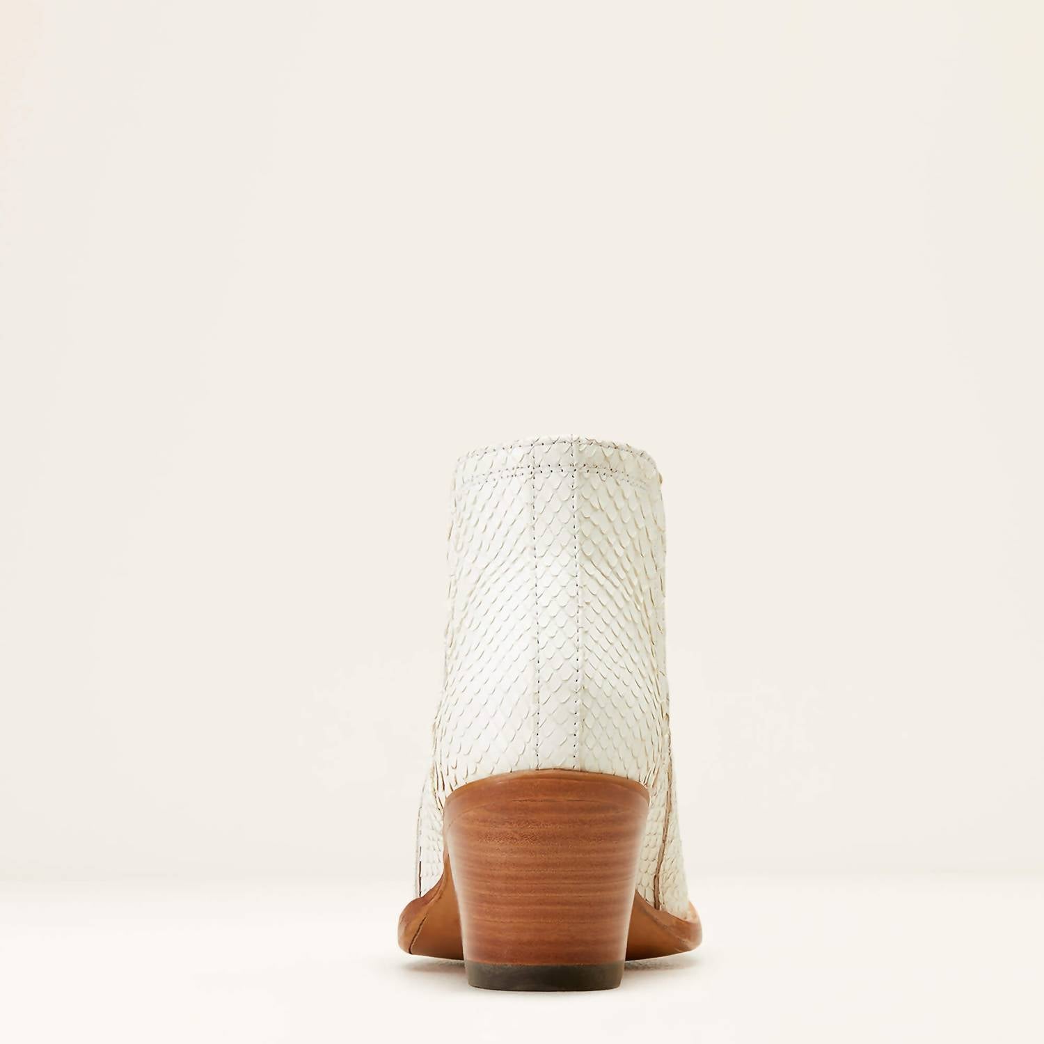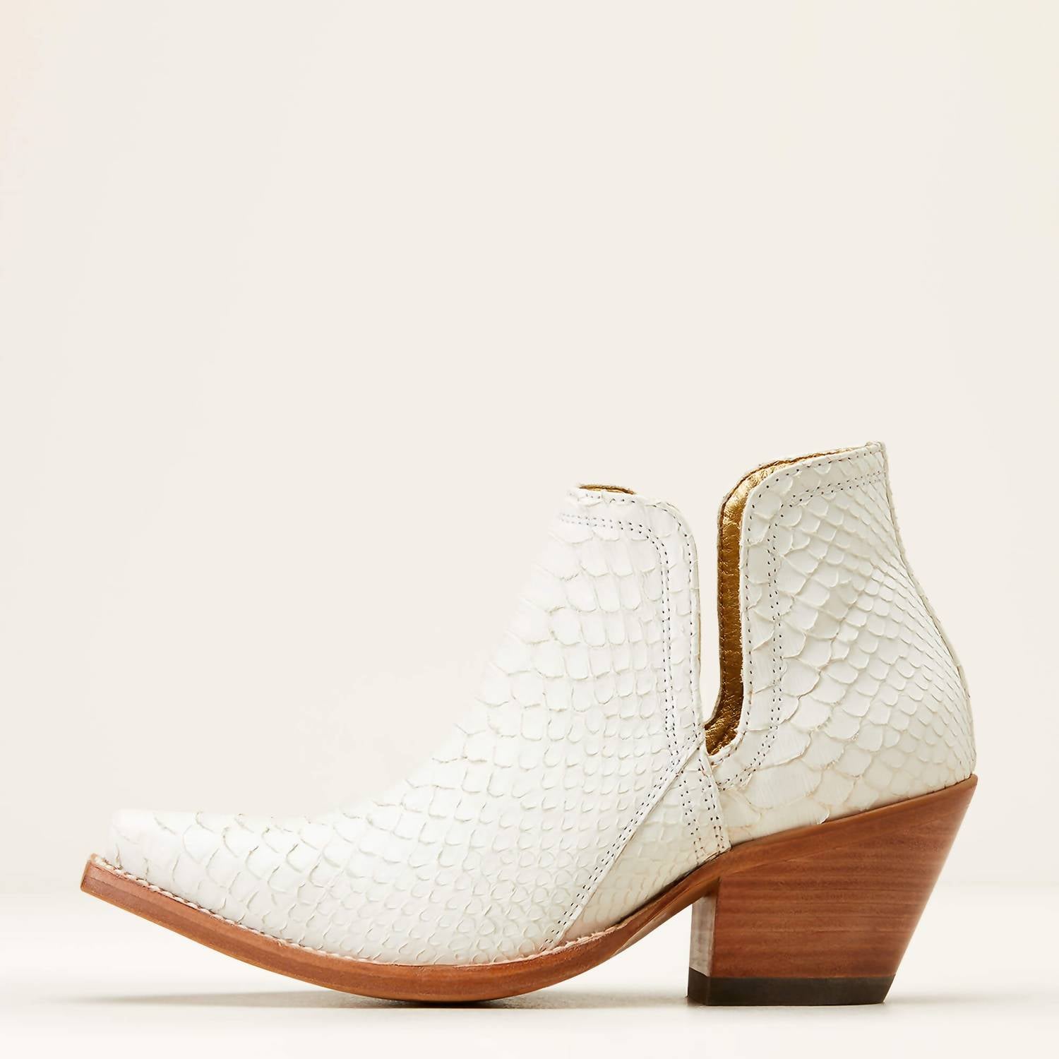 Say hello to the perfect, most versatile boot. The ankle height makes this style easily transition from day to night. Wear them with your favorite skinny jeans and tee for a more laid back look, or pair them with your favorite mini dress and jacket for a night out on the town. Step into timeless elegance with the Women's Dixon Exotic Python Western Bootie by ARIAT, an ankle bootie perfect for spring. Crafted from uniquely textured python leather accented with a classic winter white hue, this bootie offers a richly textured and eye-catching design. Enjoy ergonomic support with ATS® technology and a hand-nailed Veg Tan leather sole, complemented by a 6" shaft height and 2.5" heel for added sophistication. Designed to be resolvable with Goodyear leather welt construction, these booties ensure durability while fitting true to size and offering a unique X Toe and New West Heel.