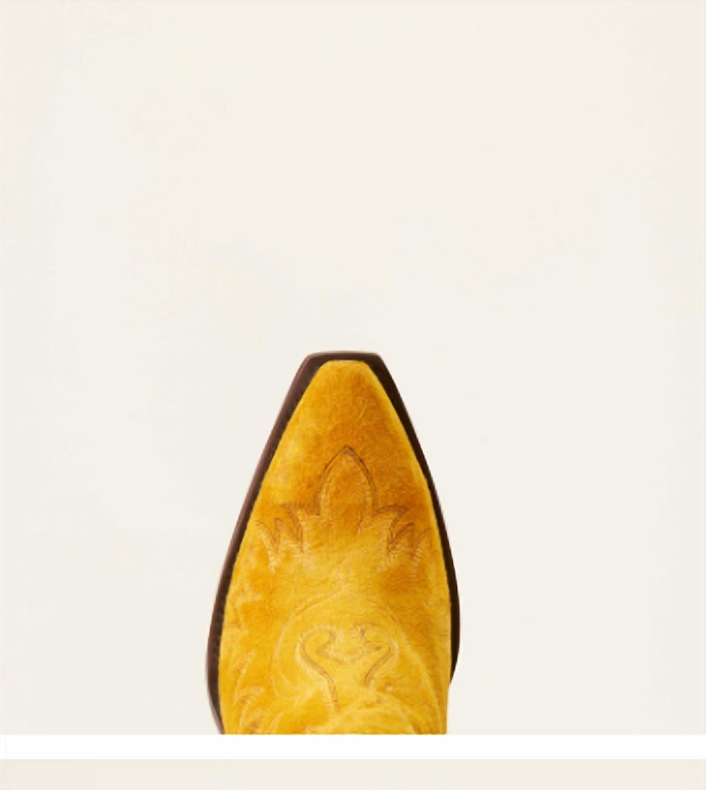 Step into timeless elegance with the ARIAT Women's Western Bootie in Gilded Suede, perfect for a concert-ready style. Expertly handcrafted from quality leather, this bootie boasts an ergonomic support thanks to ATS® technology and a non-removable comfort insole, ensuring all-day wearability. It features a vegetable-tanned leather sole, a Goodyear leather welt construction, and a chic four-row stitch pattern. With an almond toe and trendy block heel, this fall essential is designed for easy slip-on entry and can be effortlessly resoled for lasting wear.