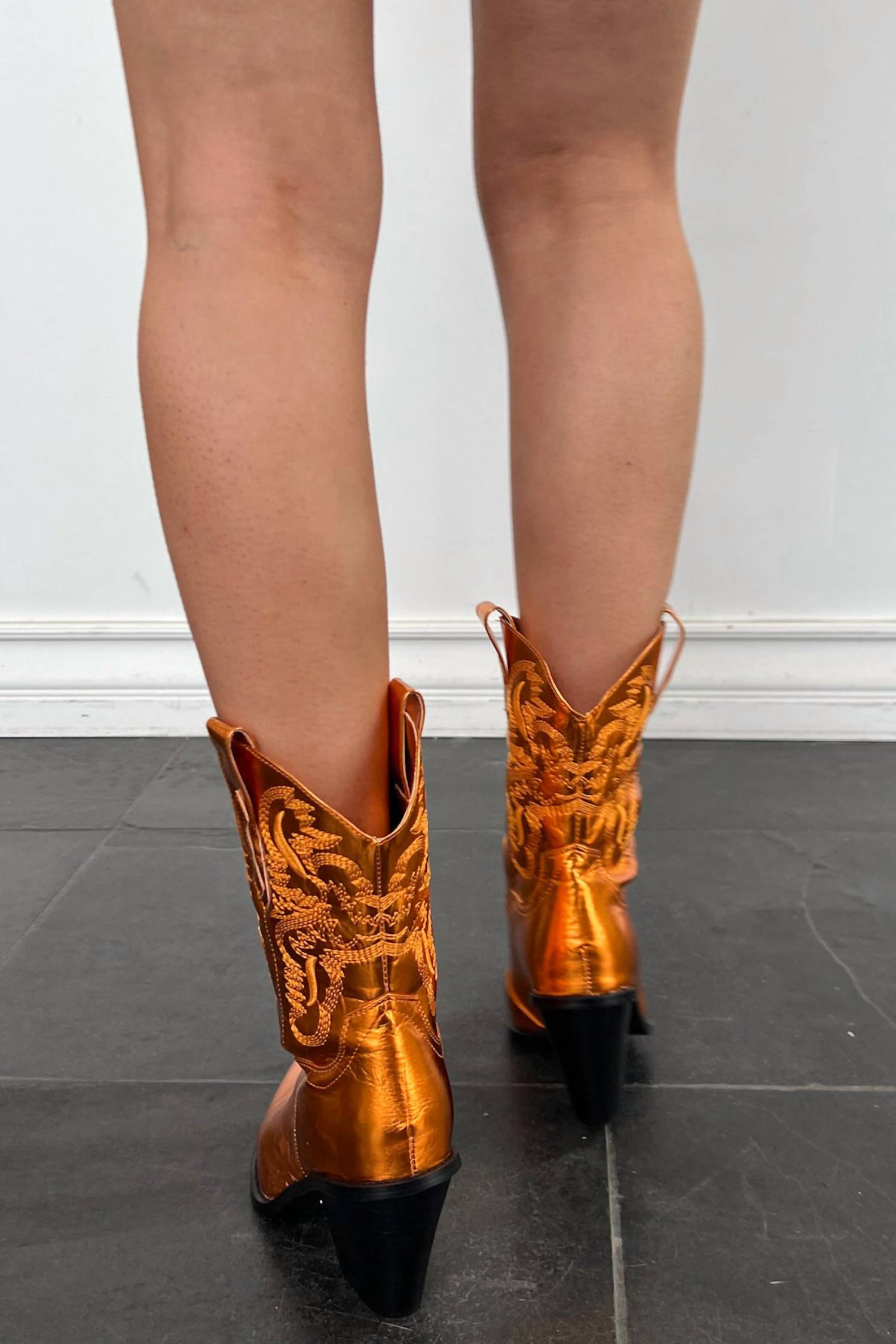 Say hello to the perfect, most versatile boot. The ankle height makes this style easily transition from day to night. Wear them with your favorite skinny jeans and tee for a more laid back look, or pair them with your favorite mini dress and jacket for a night out on the town. Make a bold statement with the Sergio Western Boot by Billini, offering a vibrant orange metallic finish. These boots feature a low stacked block heel at 2.75 inches, delivering a mix of style and comfort. Designed with a closed pointed toe and structured upper, they come with western-inspired embroidery and oversized side pull tabs for easy wear. Crafted with a synthetic upper, lining, and outsole, these boots are perfect for adding flair to your fall vacation look.
