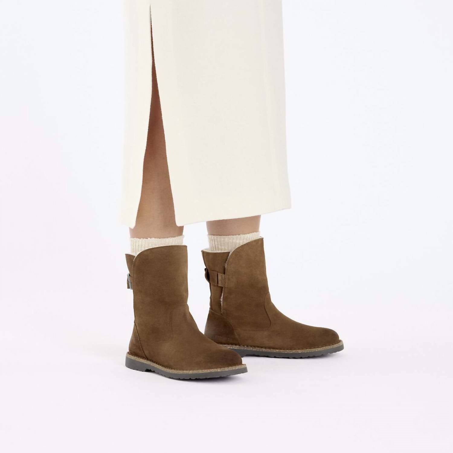 Say hello to the perfect, most versatile boot. The ankle height makes this style easily transition from day to night. Wear them with your favorite skinny jeans and tee for a more laid back look, or pair them with your favorite mini dress and jacket for a night out on the town. Step into warmth and style with the Women's Uppsala Shearling Pull-on Boots by BIRKENSTOCK, perfect for winter travel. Crafted in Portugal, these Dark Tea boots feature a classic suede upper paired with a soft, genuine shearling lining for ultimate coziness. The contoured cork-latex footbed ensures a custom fit with wear, complemented by a suede footbed lining and durable rubber outsole. Designed with a round toe and a flat heel under 1 inch, these boots embody minimalist elegance.