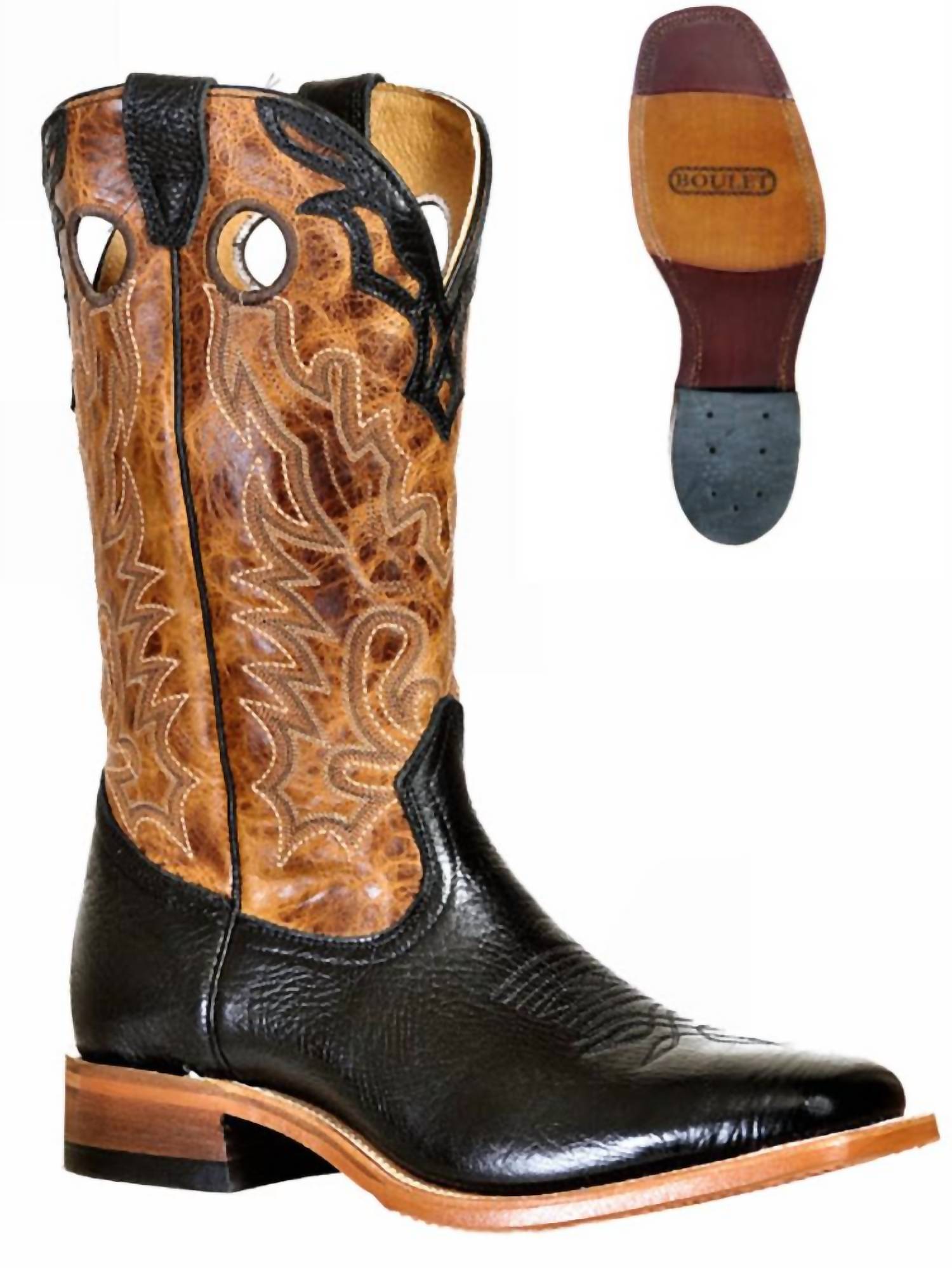 Discover the Women's Lone Star Hybrid Sole Boot by Boulet Boots, an exquisite blend of BLACK and COGNAC hues ideal for any Western-inspired wardrobe. Crafted from high-quality leather, this boot features a stylish squared toe and a low block heel, measuring between 1 1/4"-2" for comfortable wear. Perfect for the summer season, these boots effortlessly embody the rustic charm and sophistication of classic Western fashion. Ideal for women seeking durable and fashionable ankle boots in a stand-out style.