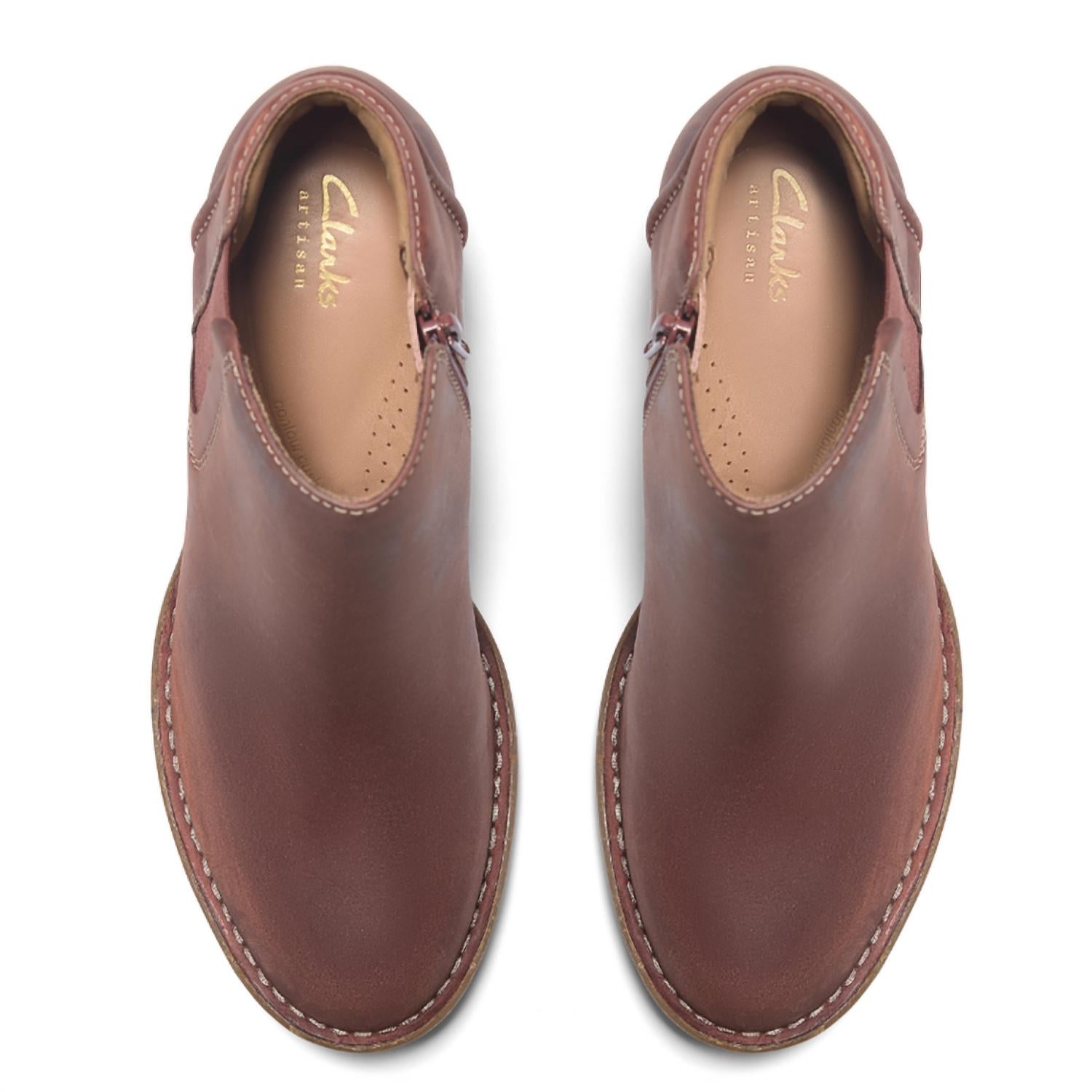 Say hello to the perfect, most versatile boot. The ankle height makes this style easily transition from day to night. Wear them with your favorite skinny jeans and tee for a more laid back look, or pair them with your favorite mini dress and jacket for a night out on the town. Introducing the Women's Kastela Lo Ankle Boot by Clarks, a stylish addition to your fall streetwear collection. These chestnut boots feature premium leather uppers and a comfortable round toe design, perfect for concerts and casual outings. The block heel stands at 57mm, complemented by a molded Contour Cushion footbed for exceptional support. Flexible TPR sole ensures ultimate traction, while stretch panels offer easy foot entry.