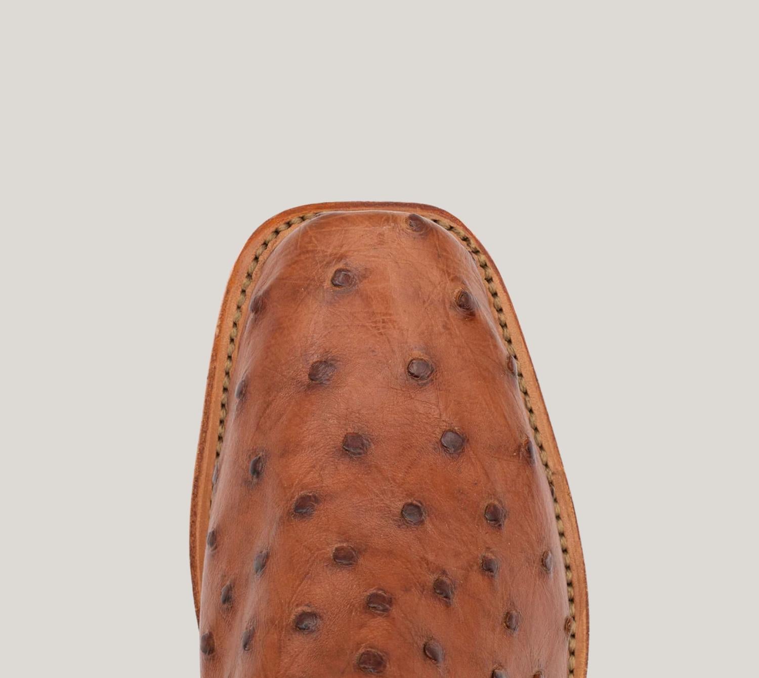 A stylish boot with a comfortable fit and the perfect amount of height. These classic boots are the perfect addition to any outfit and can be worn season after season. Discover the Women's Full Quill With Turquoise Eagle Boots by Fenoglio, a striking addition to any Fall wardrobe. Crafted from luxurious cognac full quill ostrich skin with turquoise eagle tops, these Western boots feature an 11" height and squared toe. Made in Nocona, Texas, each pair boasts all leather outsoles, insoles, and stacked leather heels, ensuring durability and timeless style. Perfect for music festivals, these medium-width boots exhibit exquisite craftsmanship in the quintessential American tradition.