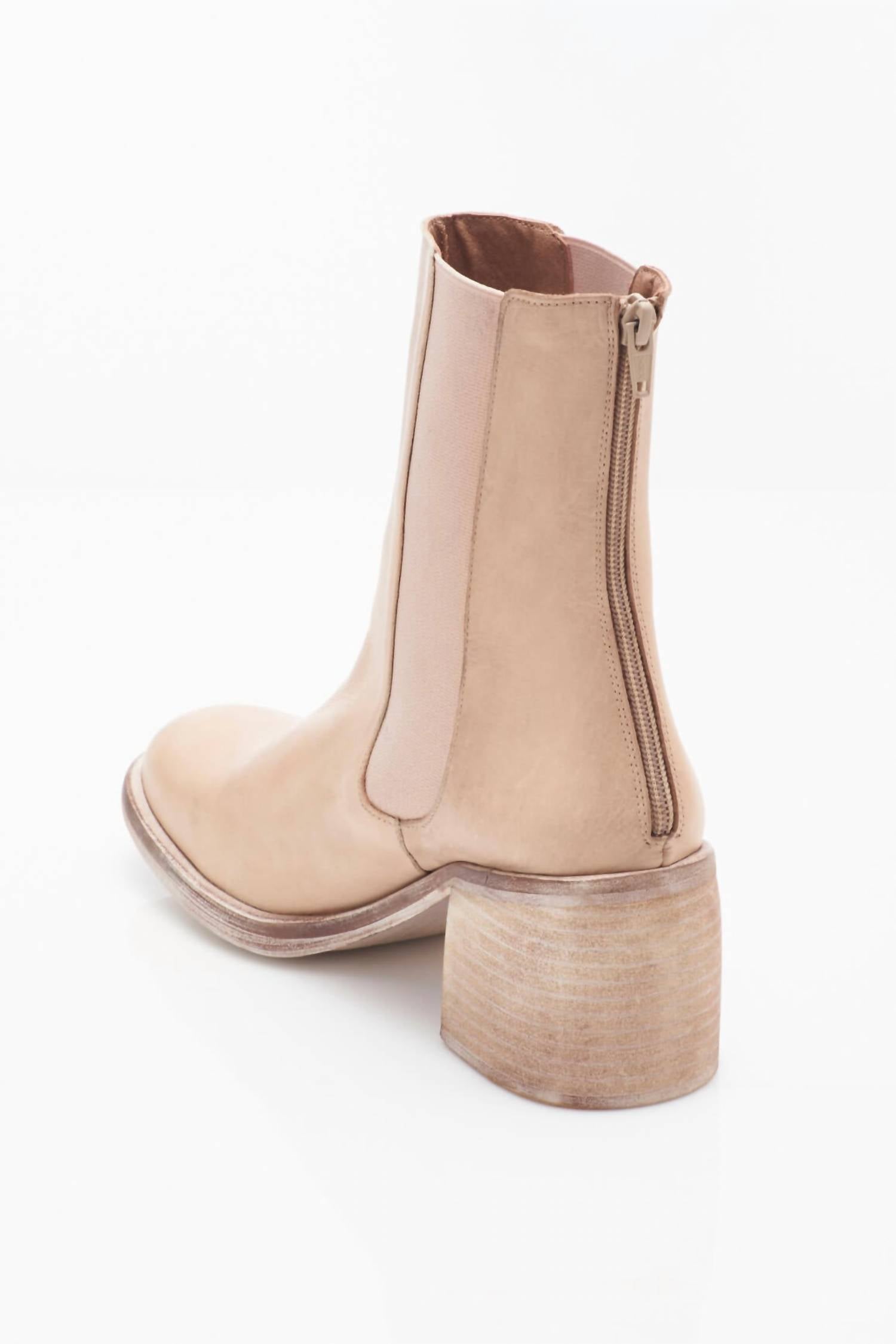 Upgrade your shoe game with these classic heeled boots, designed to merge sophistication and style. Comfortable enough for long days or a night out on the town. Step out in style with the Women's Chelsea Stacked Heel Boot by Free People, crafted for the modern woman. Made from luxurious leather and rubber, these boots feature a comfortable cushioned insole and artisan craftsmanship from Spain. The stylish design boasts elastic side accents, a zipper back for easy fit, and a chic stacked block heel with a height of 2.75 inches. Shaft is 6.42 inches, ankle circumference is 9.72 inches, and top circumference is 9.65 inches. Care: Clean with leather shoe cleaner and a soft towel; avoid getting wet. These boots run true to size, so we suggest sizing up if you're between sizes. Perfect for a dinner party, these boots capture fall's quiet luxury trend in sandy beige.