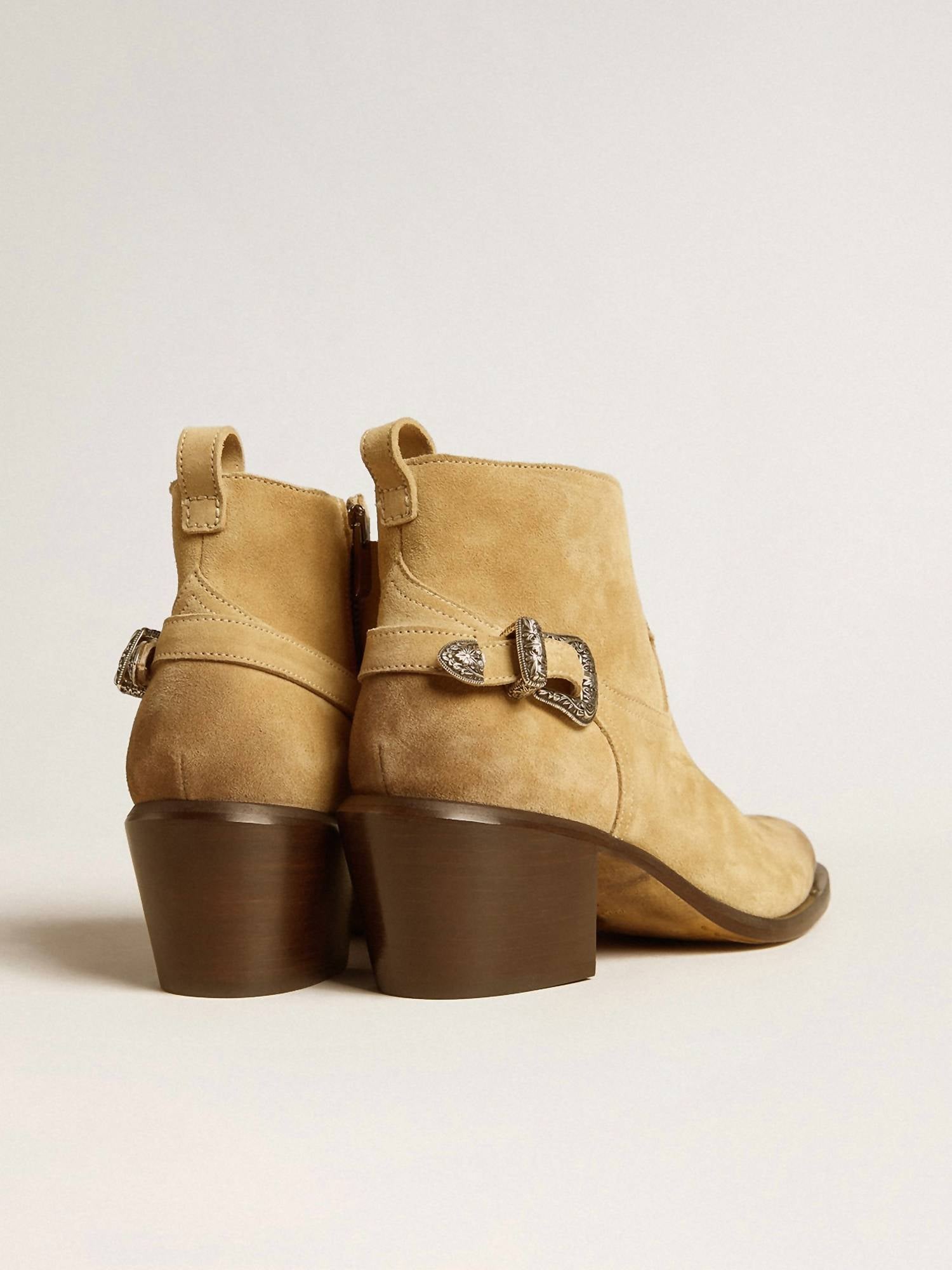 Say hello to the perfect, most versatile boot. The ankle height makes this style easily transition from day to night. Wear them with your favorite skinny jeans and tee for a more laid back look, or pair them with your favorite mini dress and jacket for a night out on the town. Experience the elegance of the Women's Patty Ankle Boots by GOLDEN GOOSE, a sophisticated choice in sand for an elevated style. These ankle-high boots feature a waxed suede upper with tonal stitching and a pointed almond toe, accented with a leather strap and inlaid silver-tone metal buckle. The interior is lined with soft leather, and the boots secure with a convenient zip fastening on the inner side. Standing on a mid-height block heel of 65mm (2.6") and a luxurious gold-tone leather sole, these boots embody quiet luxury suited for spring, making them perfect for your next anniversary celebration.