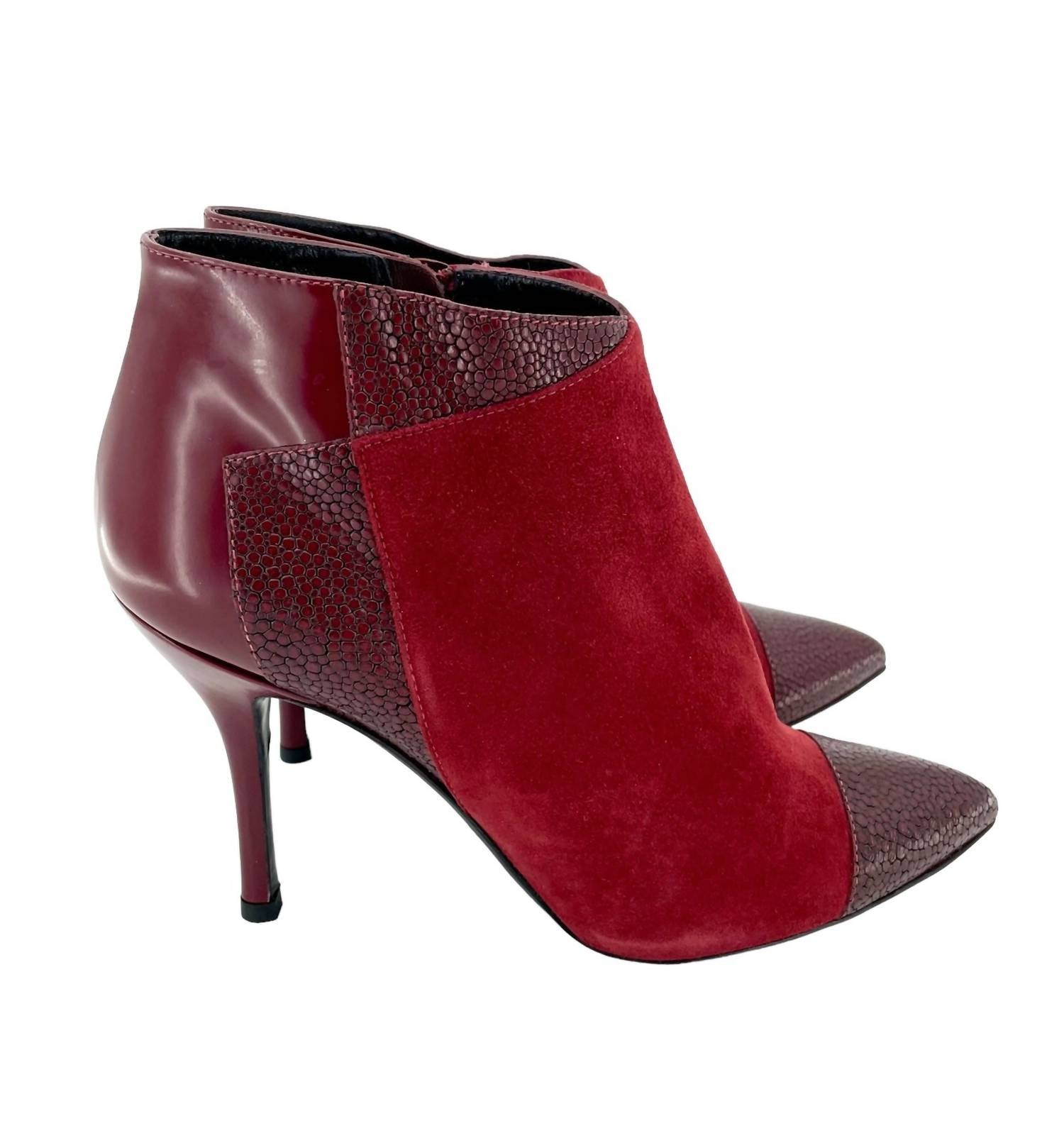 Say hello to the perfect, most versatile boot. The ankle height makes this style easily transition from day to night. Wear them with your favorite skinny jeans and tee for a more laid back look, or pair them with your favorite mini dress and jacket for a night out on the town. A classic ankle boot is set on a slim heel and receives an upgrade with contrasting suede and leather construction as well as textured details Pointed textured cap toe Suede leather construction Textured vamp and suede heel panel Side zip closure Padded footbed Slim heel 3.5" heel height Made in Italy Leather upper, lining, and sole