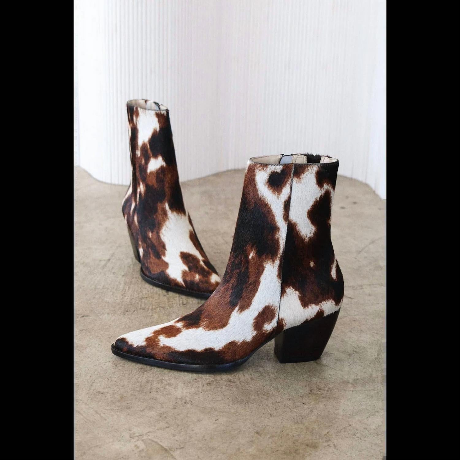 Say hello to the perfect, most versatile boot. The ankle height makes this style easily transition from day to night. Wear them with your favorite skinny jeans and tee for a more laid back look, or pair them with your favorite mini dress and jacket for a night out on the town. Step into effortless style with the Women's Caty Ankle Boots by Matisse, a must-have in Brown Multi Cow Hair for your fall outings. Featuring a unique cow hair upper and suede material, these Western-inspired boots boast a mid-heel height of 2.5 inches and a pointed toe. Their design includes a 7-inch shaft height and a 10-inch boot opening, complete with a padded insole and textile lining for comfort. Crafted to perfection with a manmade outsole and zipper closure, these imported beauties are perfect for a Thanksgiving gathering.