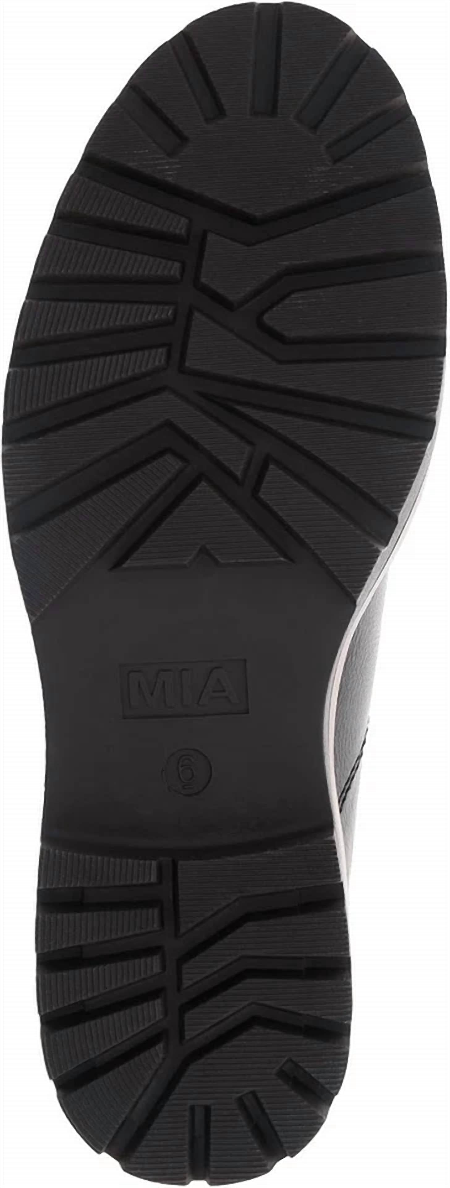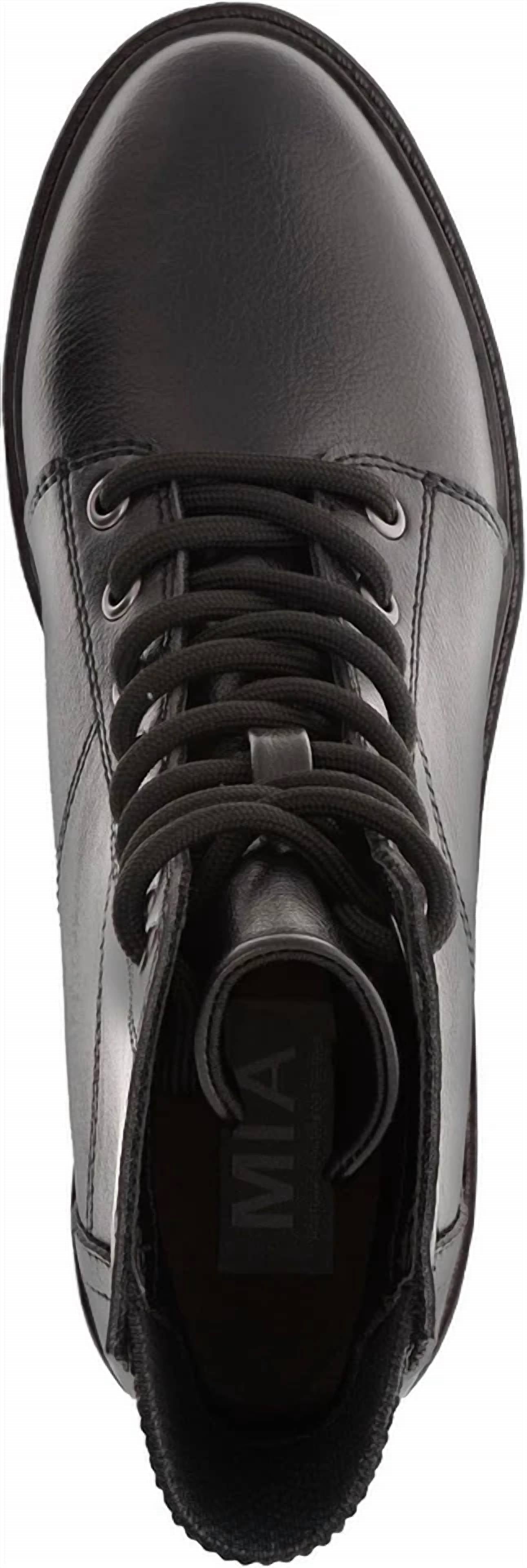 A stylish lace-up boot with a comfortable fit and classic design. Versatile enough to wear with almost every outfit, your closet and feet will be thanking you. Step out in style with the Women's Symth Combat Wedge Boots by MIA—a perfect blend of edgy streetwear and comfort. These black lace-up boots feature a wedge heel and a lug sole, offering a fashionable boost with a 2-inch heel height. Finished with tonal stitching, they are ideal for fall music festivals. Designed with a round toe, these boots promise versatility and trend-savvy appeal.