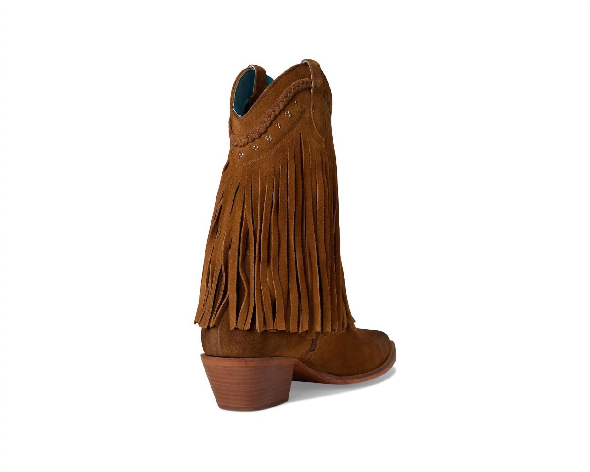 Say hello to the perfect, most versatile boot. The ankle height makes this style easily transition from day to night. Wear them with your favorite skinny jeans and tee for a more laid back look, or pair them with your favorite mini dress and jacket for a night out on the town. Step into style with the Women's Setup Fringe Western Boots by Roan in a stunning mustard hue. These boots are crafted from premium full-grain suede, showcasing dramatic fringe and intricate stud accents for a bold, Western-inspired look. With a pointed toe and a comfort-focused 2-inch block heel, these boots seamlessly blend classic silhouettes with contemporary flair. Made in India, they feature a shaft height of 10.5 inches and a circumference opening of 13 inches, embodying a standout aesthetic perfect for elevating your fall wardrobe.
