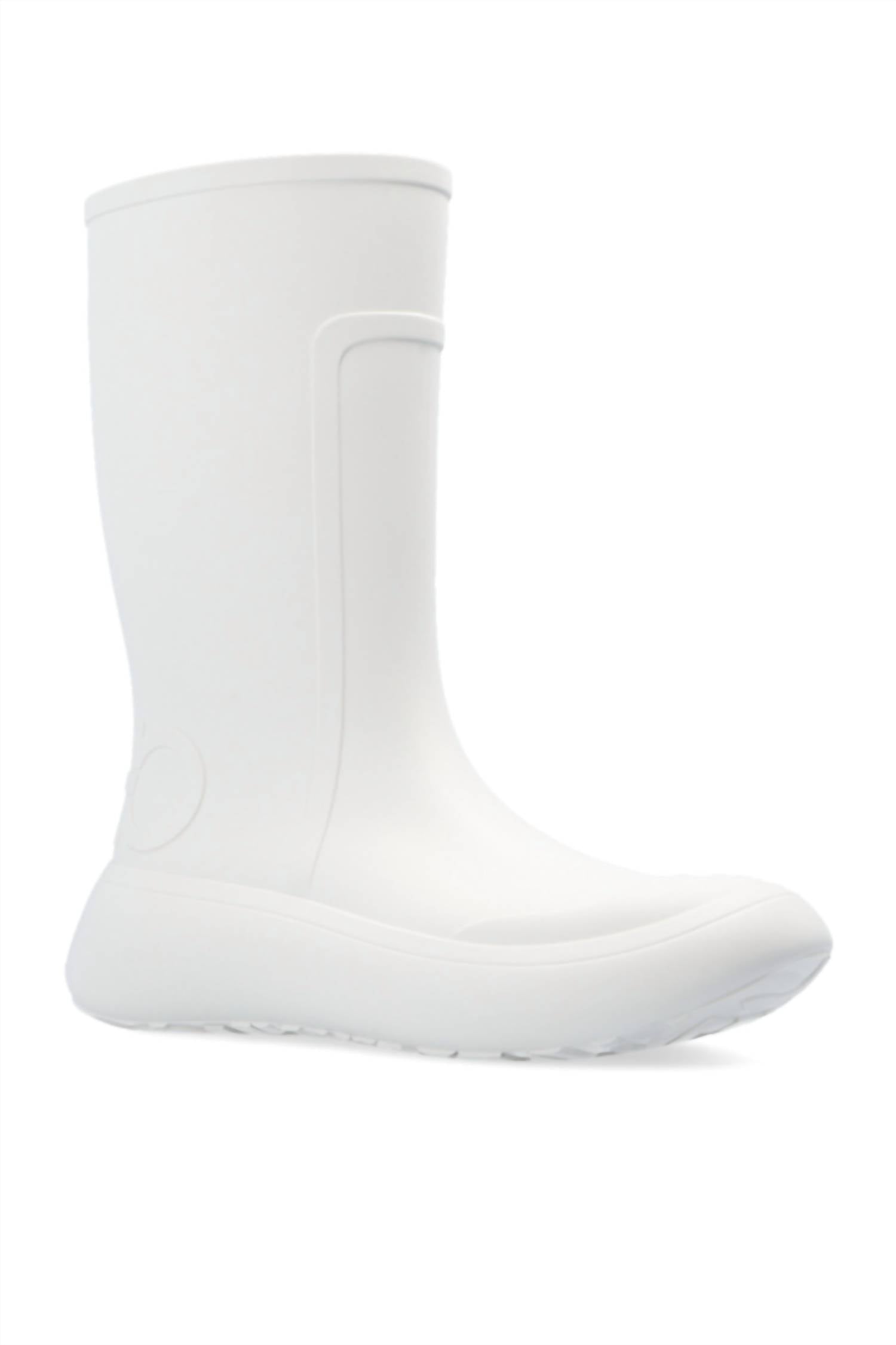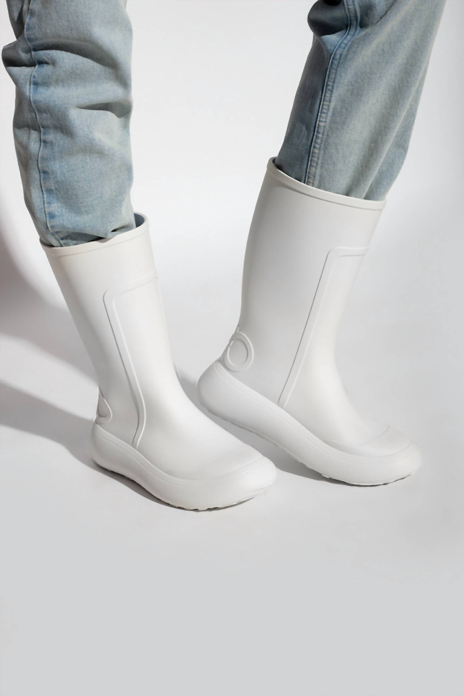 You'll be wishing for rainy days with these stylish yet functional rainboots. Step into the rainy season with the White Rain Boots by Salvatore Ferragamo, crafted entirely from durable rubber. These stylish boots are perfect for travel, featuring a round toe and a flat heel design for comfortable wear during fall adventures. Proudly showcasing the iconic raised 'Gancini' logo, these boots rest on a reliable white rubber sole with a heel height of 4cm, extending to 6cm at the highest point. A chic and practical choice for women seeking both functionality and refined elegance.