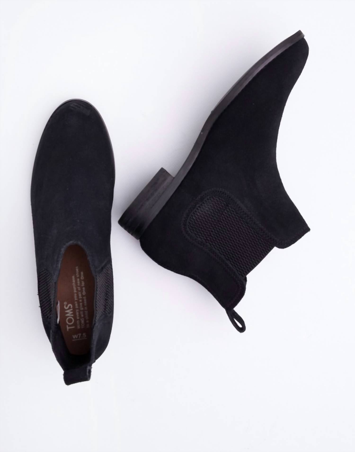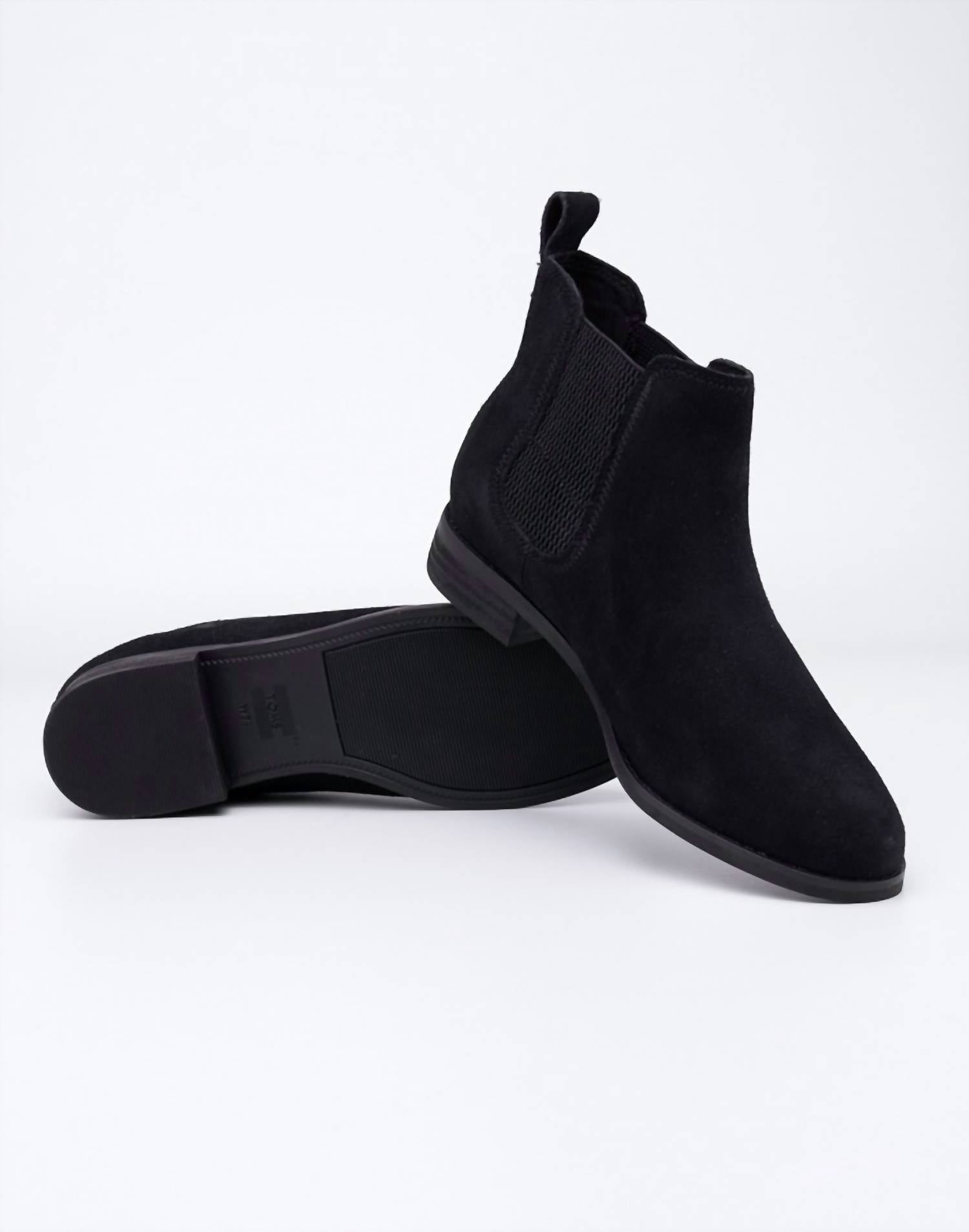 Say hello to the perfect, most versatile boot. The ankle height makes this style easily transition from day to night. Wear them with your favorite skinny jeans and tee for a more laid back look, or pair them with your favorite mini dress and jacket for a night out on the town. Step into sophistication with the Women's Ella Suede Ankle Boots by TOMS, featuring a sleek Chelsea style accentuated by a rubber breech at the ankle. Crafted from high-quality suede, these boots offer unparalleled comfort with a reinforced heel and soft textile insole. The 1-inch block heel ensures stability, while the rubber outsole provides optimal traction for various surfaces.
