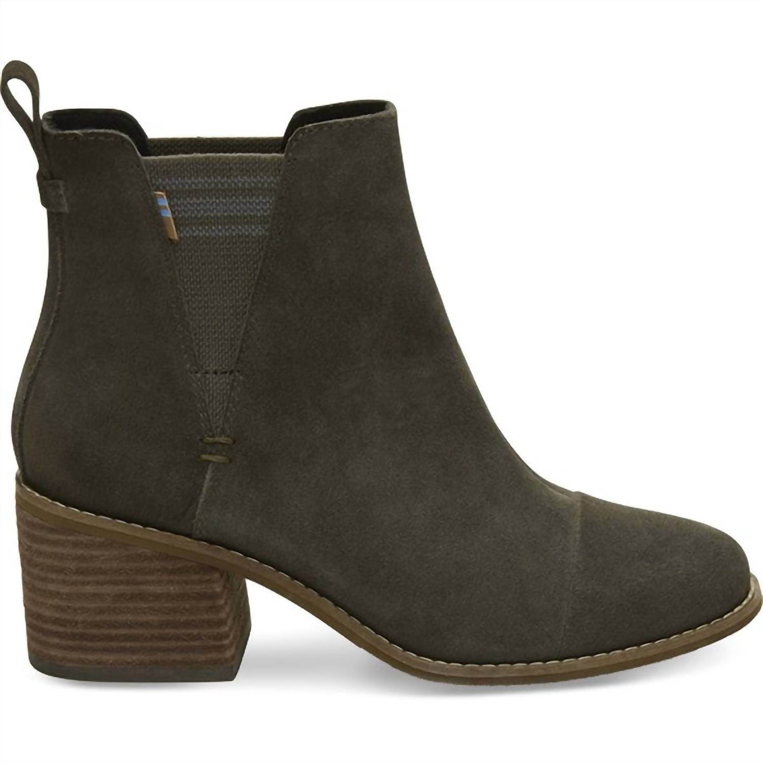 Step out in confidence and showcase your impeccable taste with these fashionable and versatile boots. Their classic style will have you reaching for these boots season after season. Step into sophistication with the Women's Esme Suede Chelsea Boot by TOMS. Expertly crafted in rich Tarmac Olive, these ankle boots feature a sleek suede leather finish and a comfortable round toe design. A stylish 2.25-inch block heel offers the perfect height for a versatile mid-heel look, ideal for embracing fall fashion.