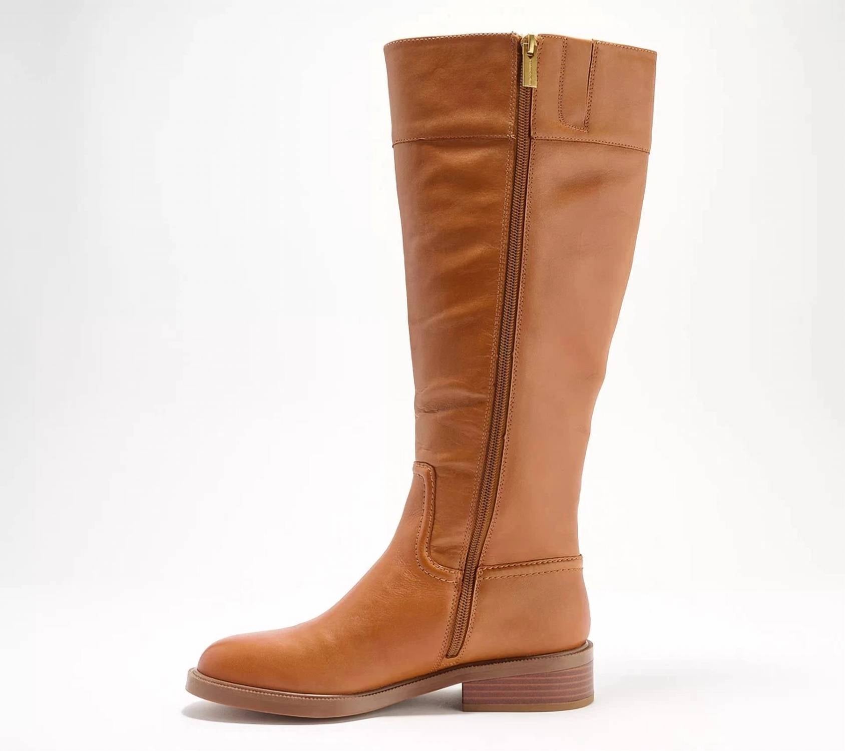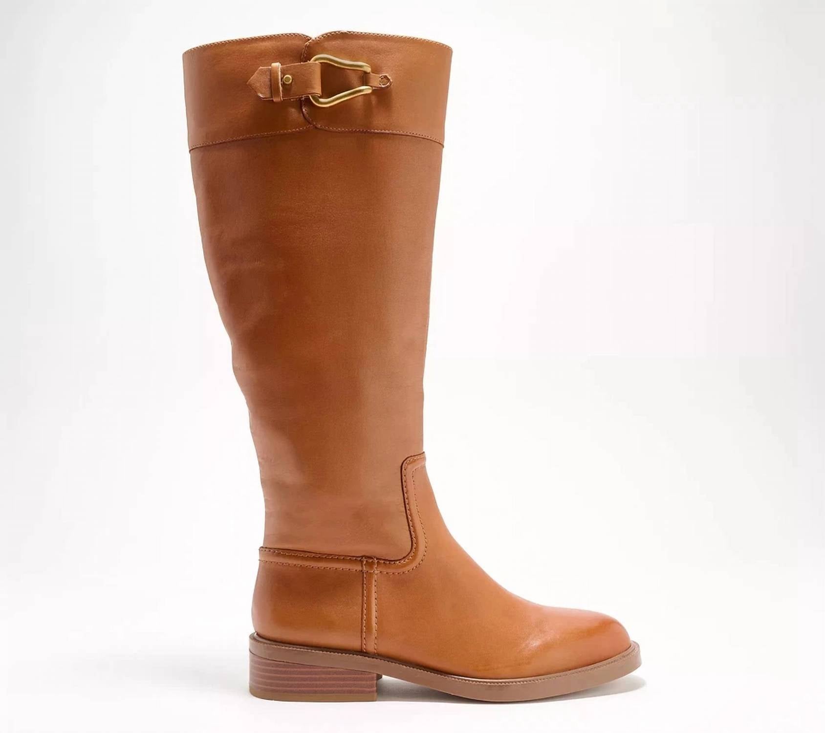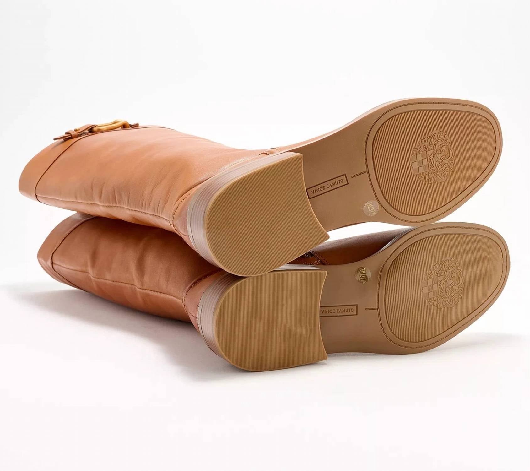 Step into timeless style with the Women's Andalian Leather Riding Boots by VINCE CAMUTO. These boots boast a tall shaft with a wide calf, inside zip closure, and chic hardware details, balancing equestrian flair with a sleek, classic design. Crafted with a leather upper, textile/man-made lining, and a practical rubber outsole, they feature a 1.37-inch stacked block heel and a 15.35-inch shaft with a 16.54-inch opening circumference. Imported and true to size, these boots promise enduring style and comfort for any occasion.