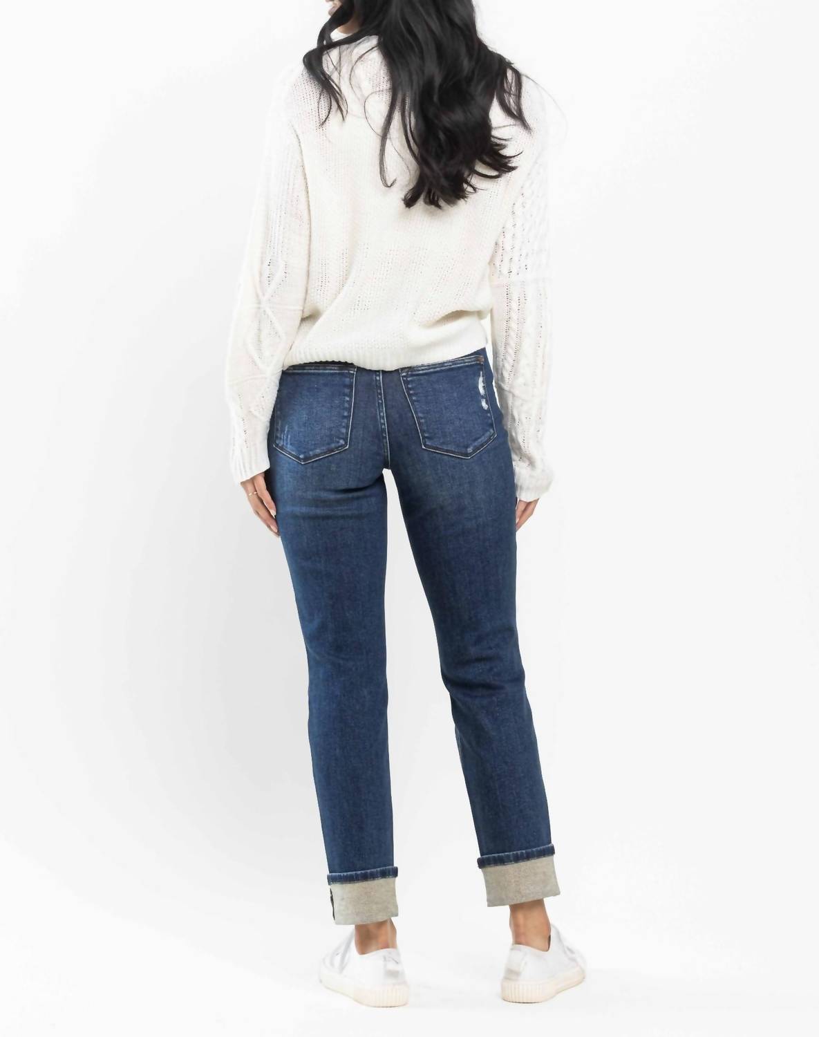 a laid-back feel while still surprisingly form-flattering. Step up your denim game with the "Charlotte" Midrise Buffalo Plaid Patch Destroyed Boyfriend Jeans by Judy Blue. Designed for a relaxed yet stylish fit, these blue jeans feature a unique plaid and check pattern. Crafted from a comfortable cotton blend (94% Cotton, 5% Polyester, 1% Spandex), they boast a mid-rise waist and a button closure. Available in regular and plus sizes, the front rise measures 9.75" in regular and 11.75" in plus sizes, with an inseam of 28" cuffed and 31" uncuffed.